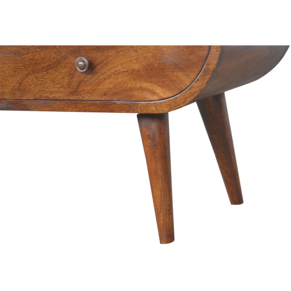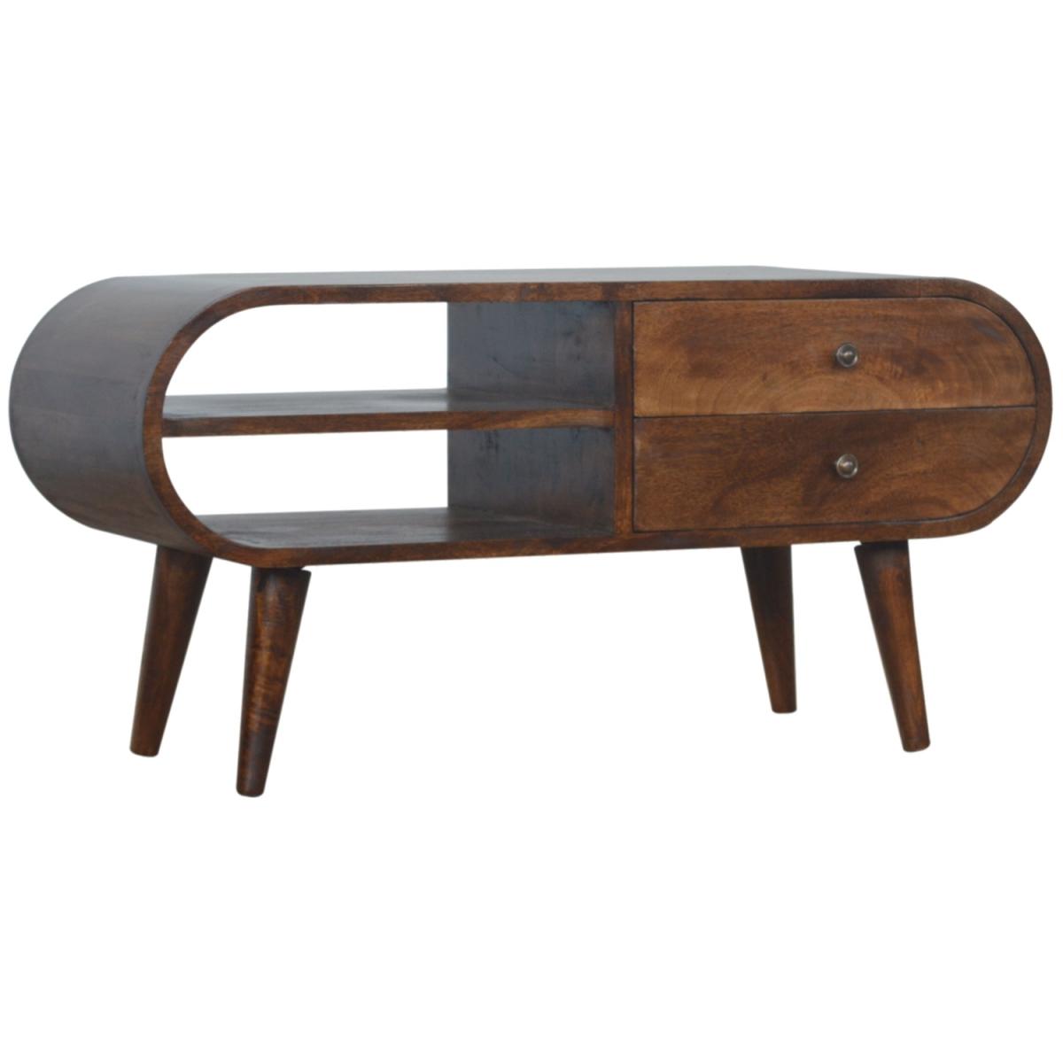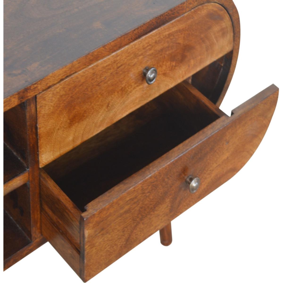 This Solid wood media unit has been constructed from 100%Solid mango wood in a chestnut finish and offers a unique shaped design with rounded edges. It features four drawers which have shiny knobs and Nordic-style legs. A great, simple addition to the living room.