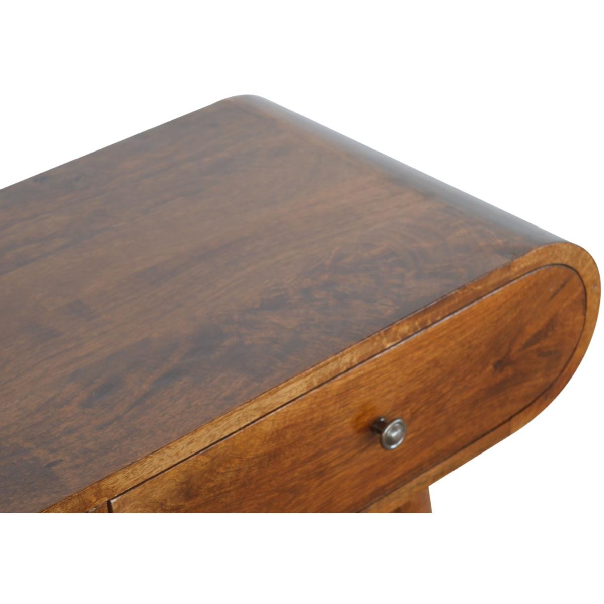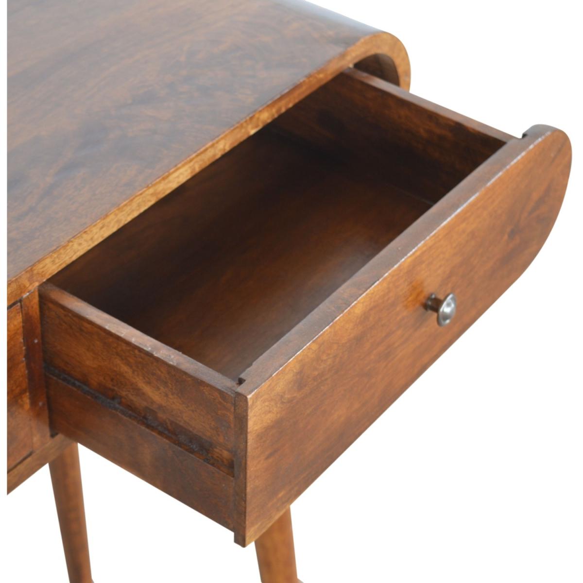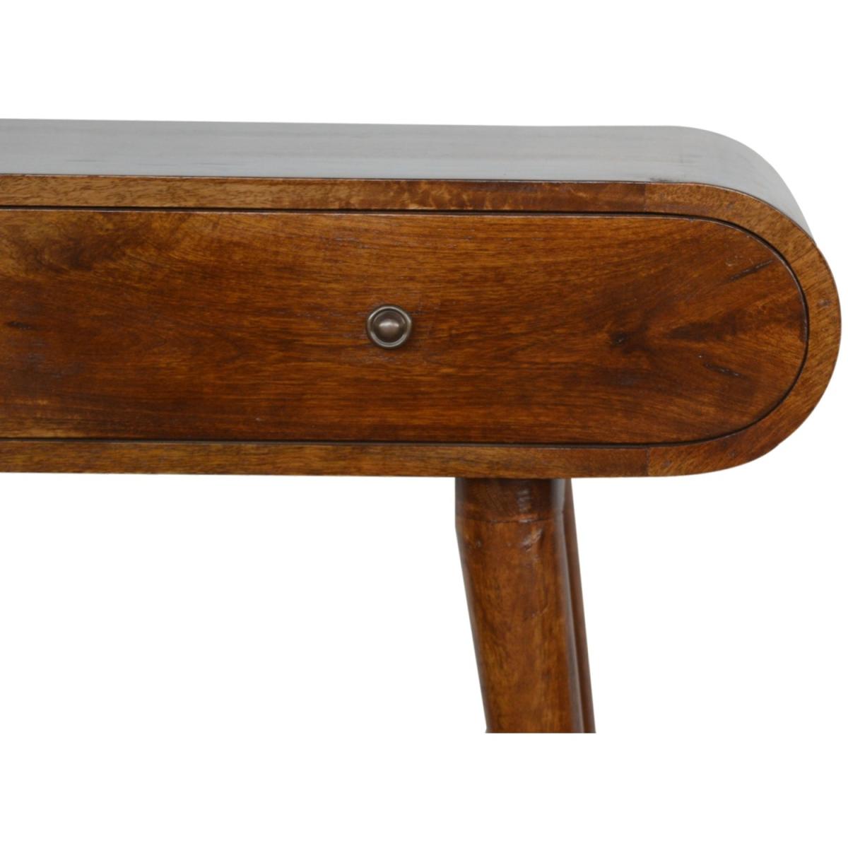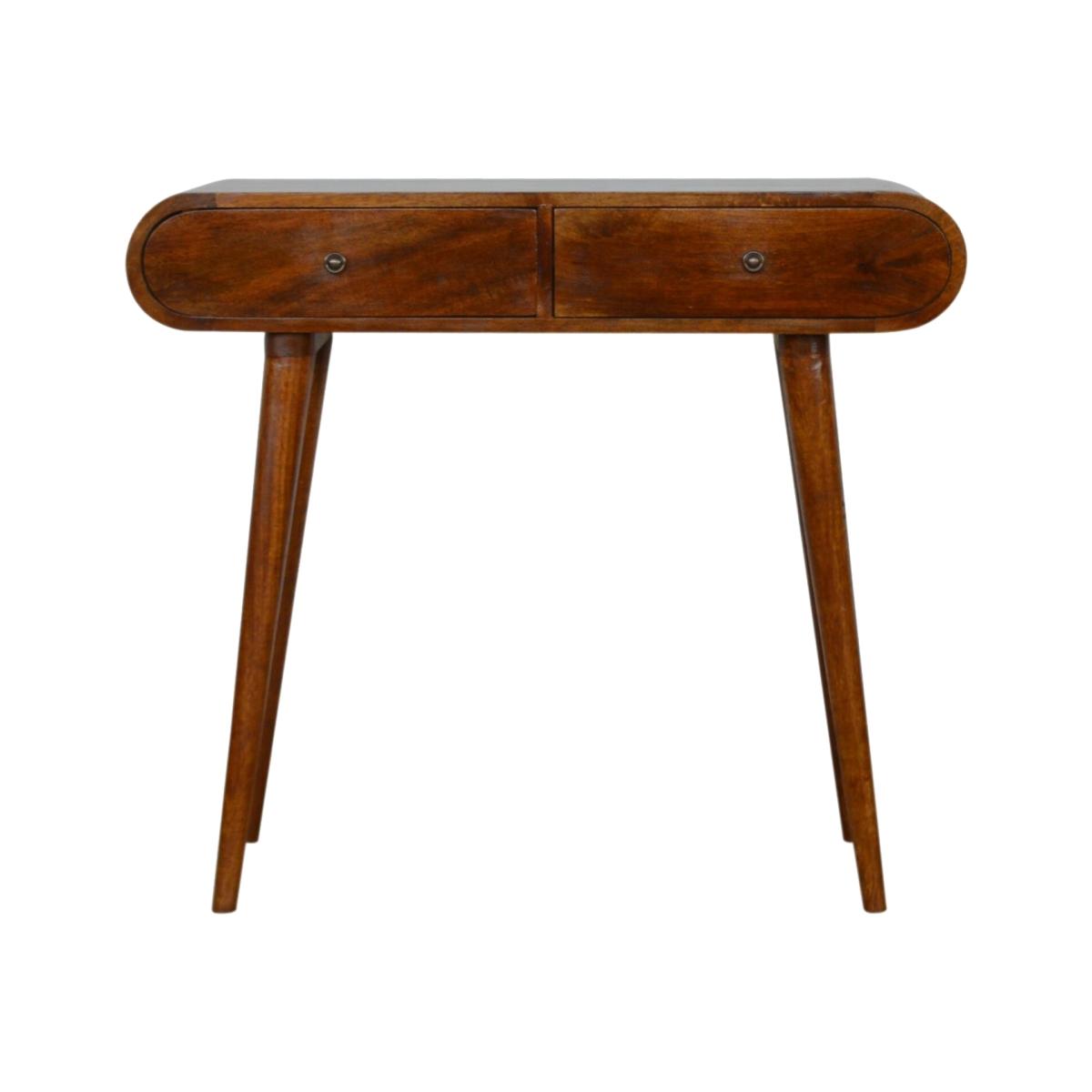 This Solid wood console table has been constructed from 100% Solid mango wood in a chestnut finish and offers a unique shaped design with rounded edges. It features 2 drawers which come with shiny brass knobs and Nordic-style legs. A great simple addition to the home.