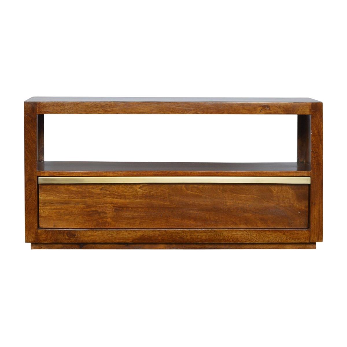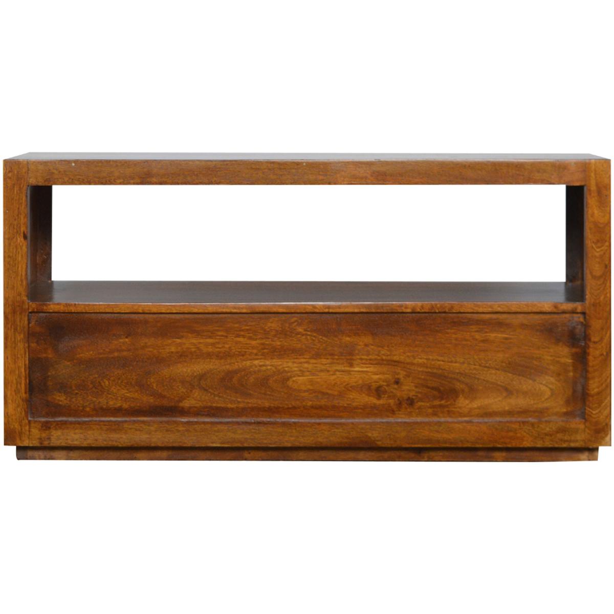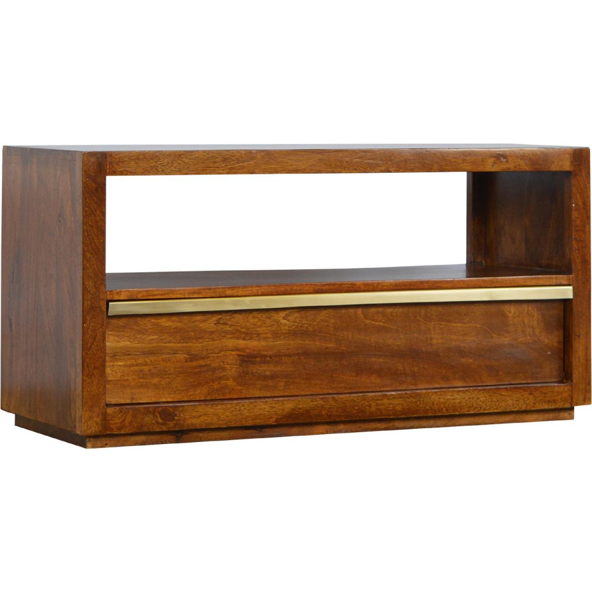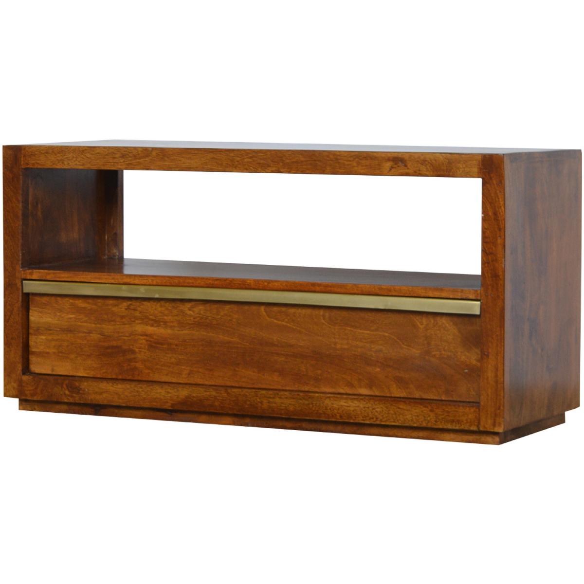 This solid wood media unit has been constructed from 100% solid mango wood in a chestnut finish and offers a unique shaped design with rounded edges. It features four drawers that have shiny knobs and Nordic-style legs. A nice addition to the living room.