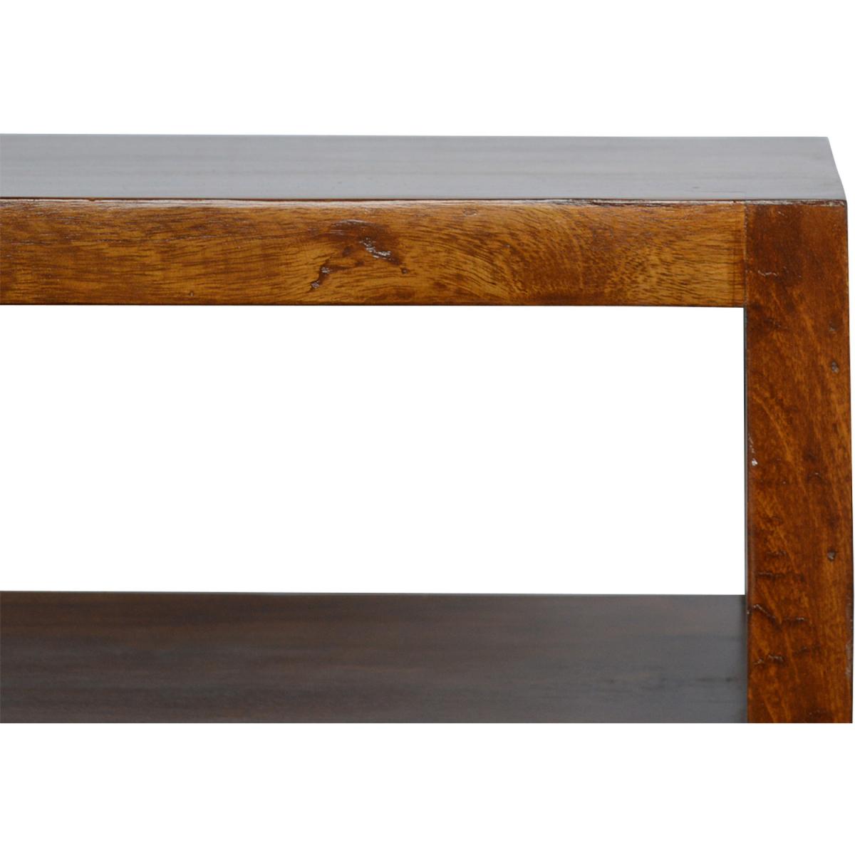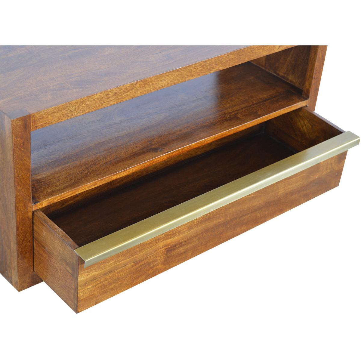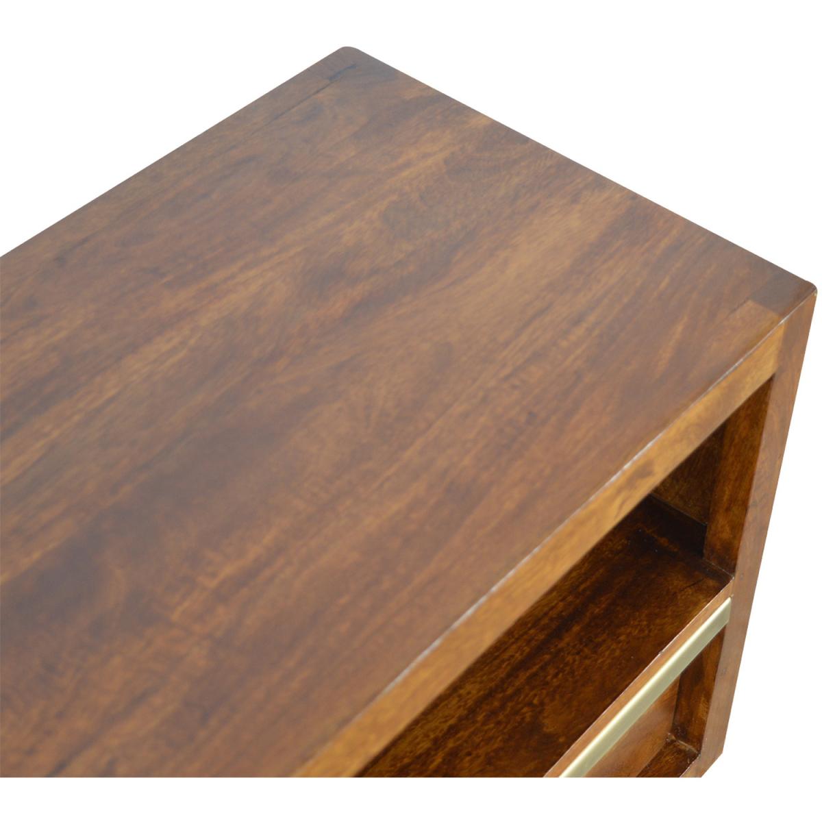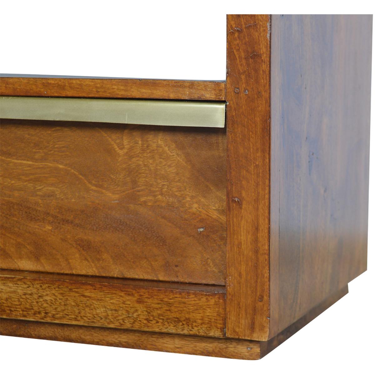 This solid wood media unit has been constructed from 100% solid mango wood in a chestnut finish and offers a unique shaped design with rounded edges. It features four drawers that have shiny knobs and Nordic-style legs. A nice addition to the living room.