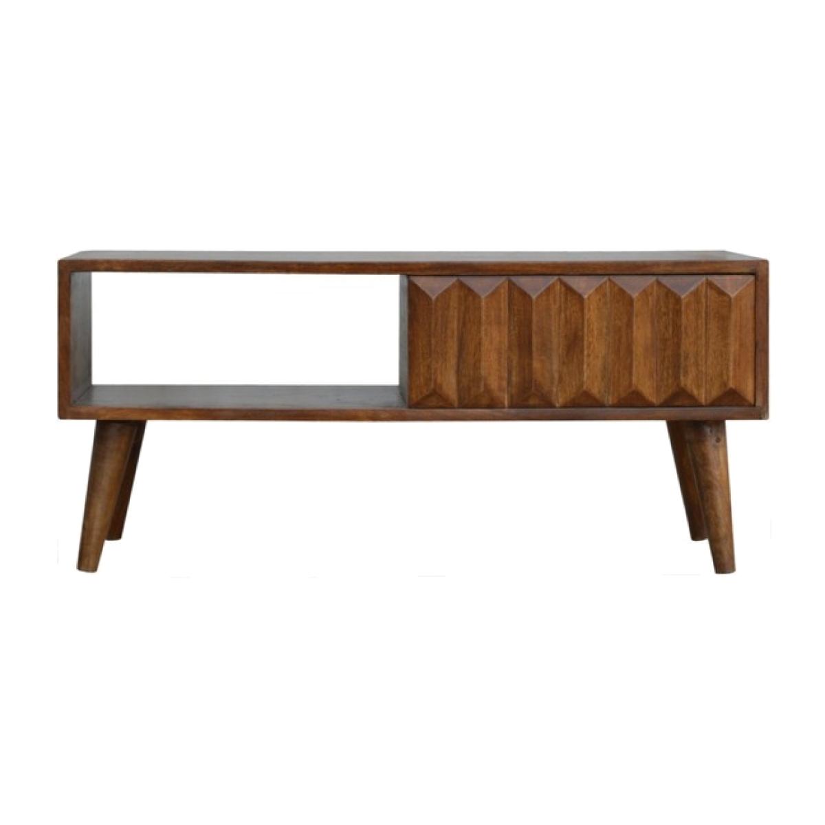 I love this chestnut prism slider because of its bold colour and mid-century design, which can act as a statement piece in a variety of interiors. It works particularly well in modern or eclectic living spaces where a pop of colour is welcome, and its warm wood tones add a sense of coziness. For styling, consider pairing with neutral or complementary hues to let the orange really stand out, and use minimal accessories to keep the focus on the unit itself. It’s versatile enough to sit beneath a large TV or as a display piece in a hallway, but remember to mark it out with a few carefully curated decorative objects, as its clean lines lend themselves to a clutter-free aesthetic.