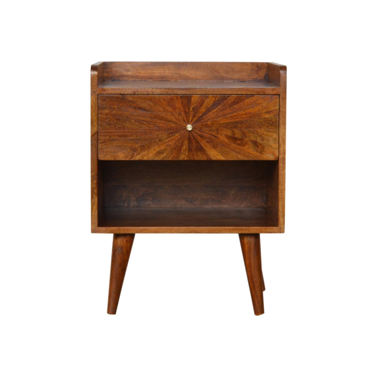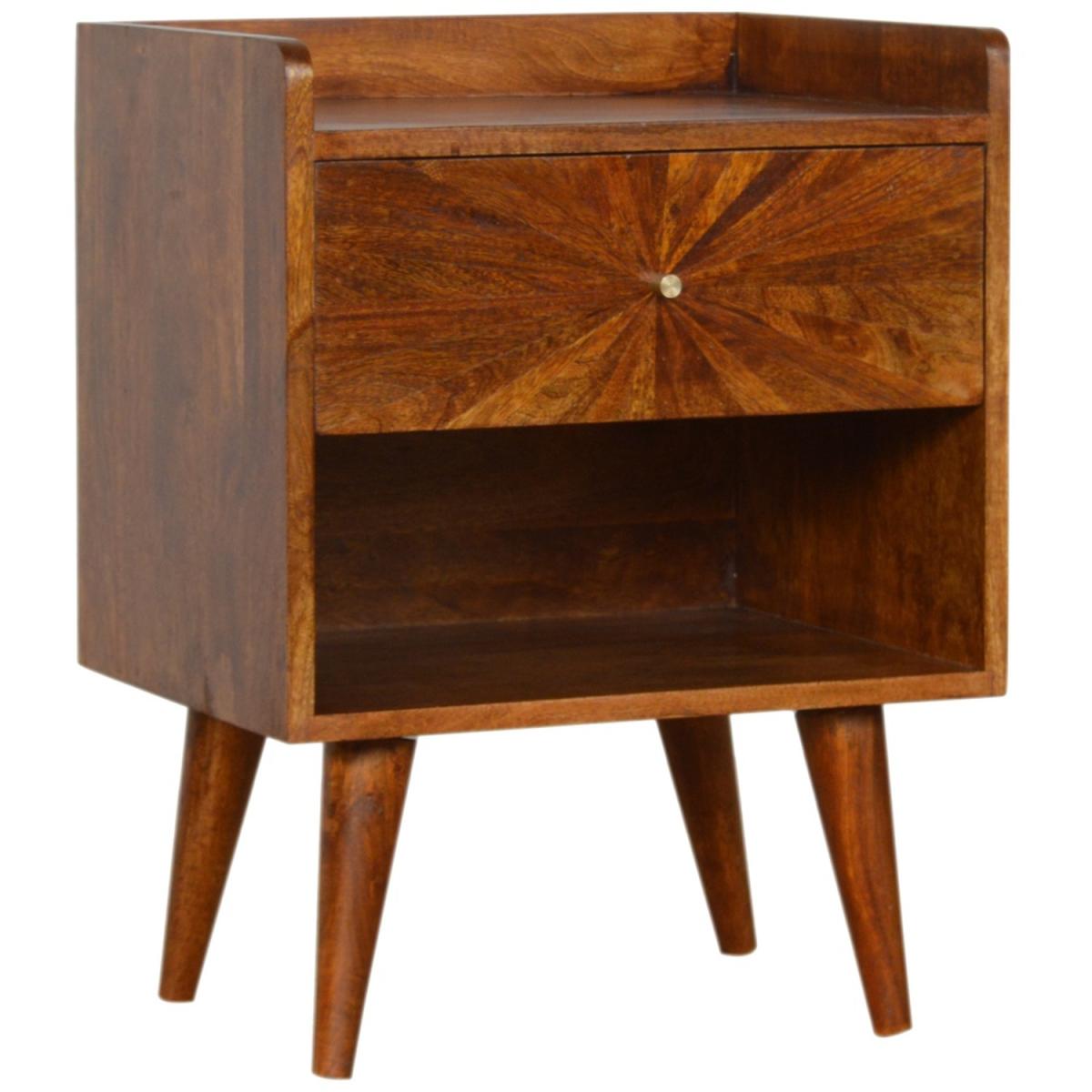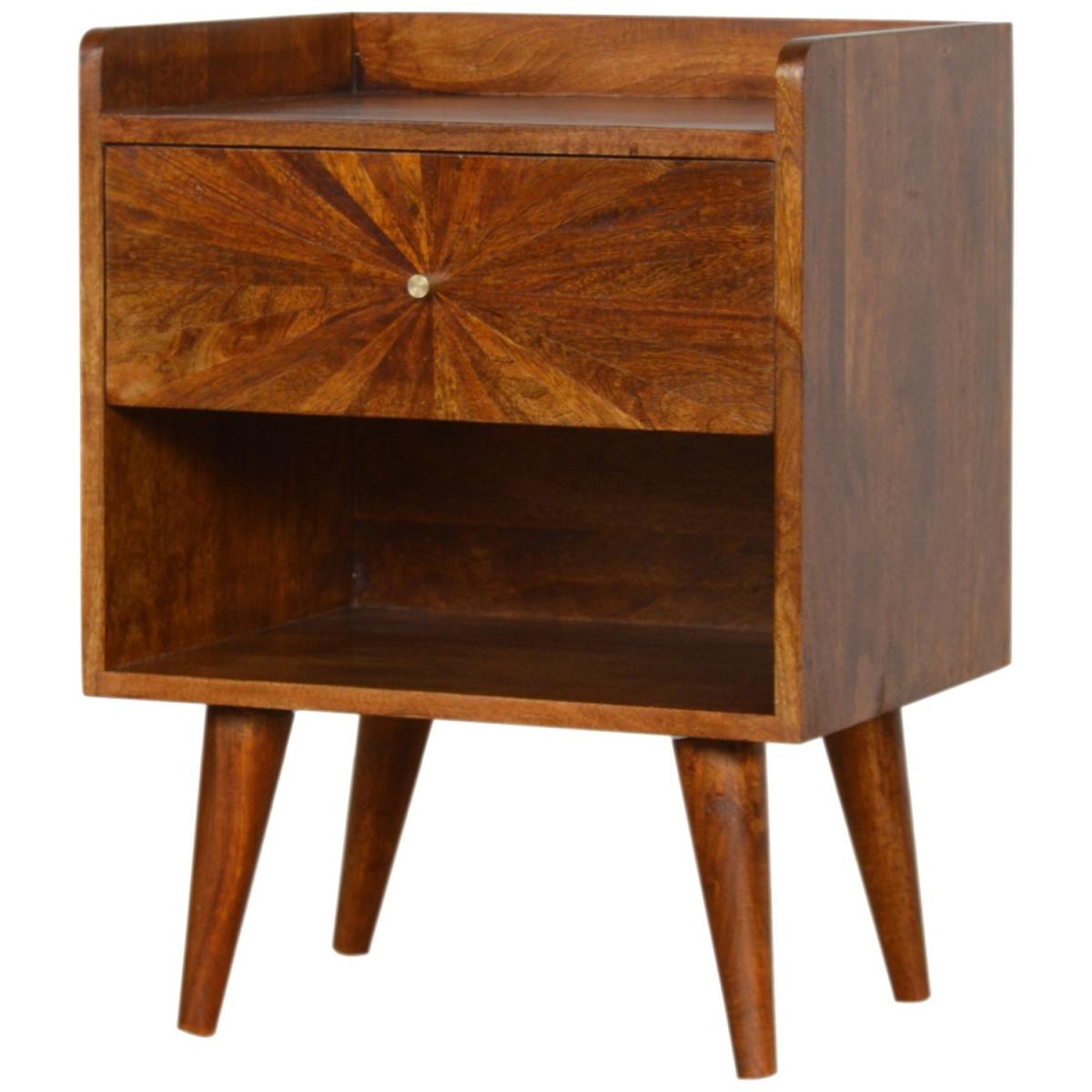 For storing bits and pieces before bedtime, this piece of furniture will prove handy all over your home. It is constructed from 100% solid mango wood in a chestnut finish and has a sunrise pattern on the drawer front. It features 4 nordic style legs and a shiny candle knob. This bedside is bound to be the perfect partner for your bed.