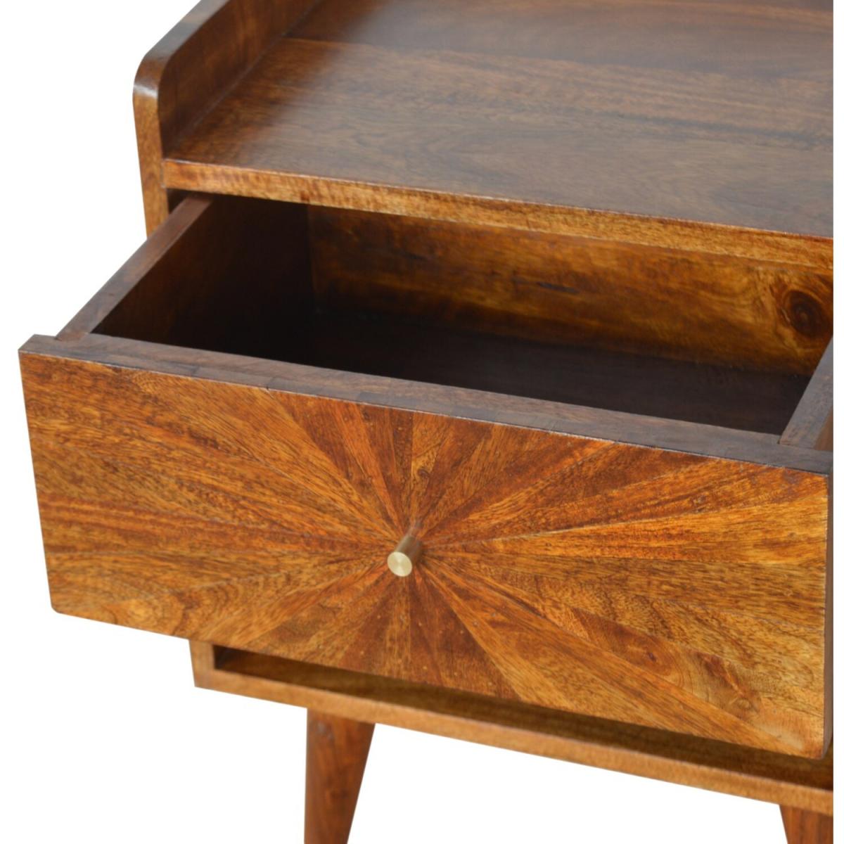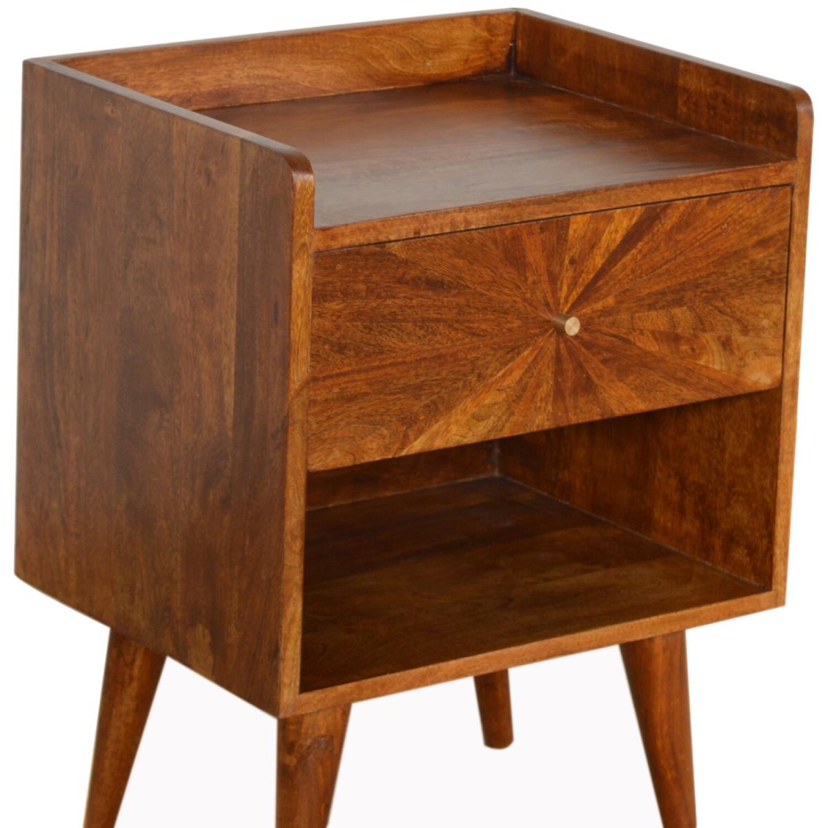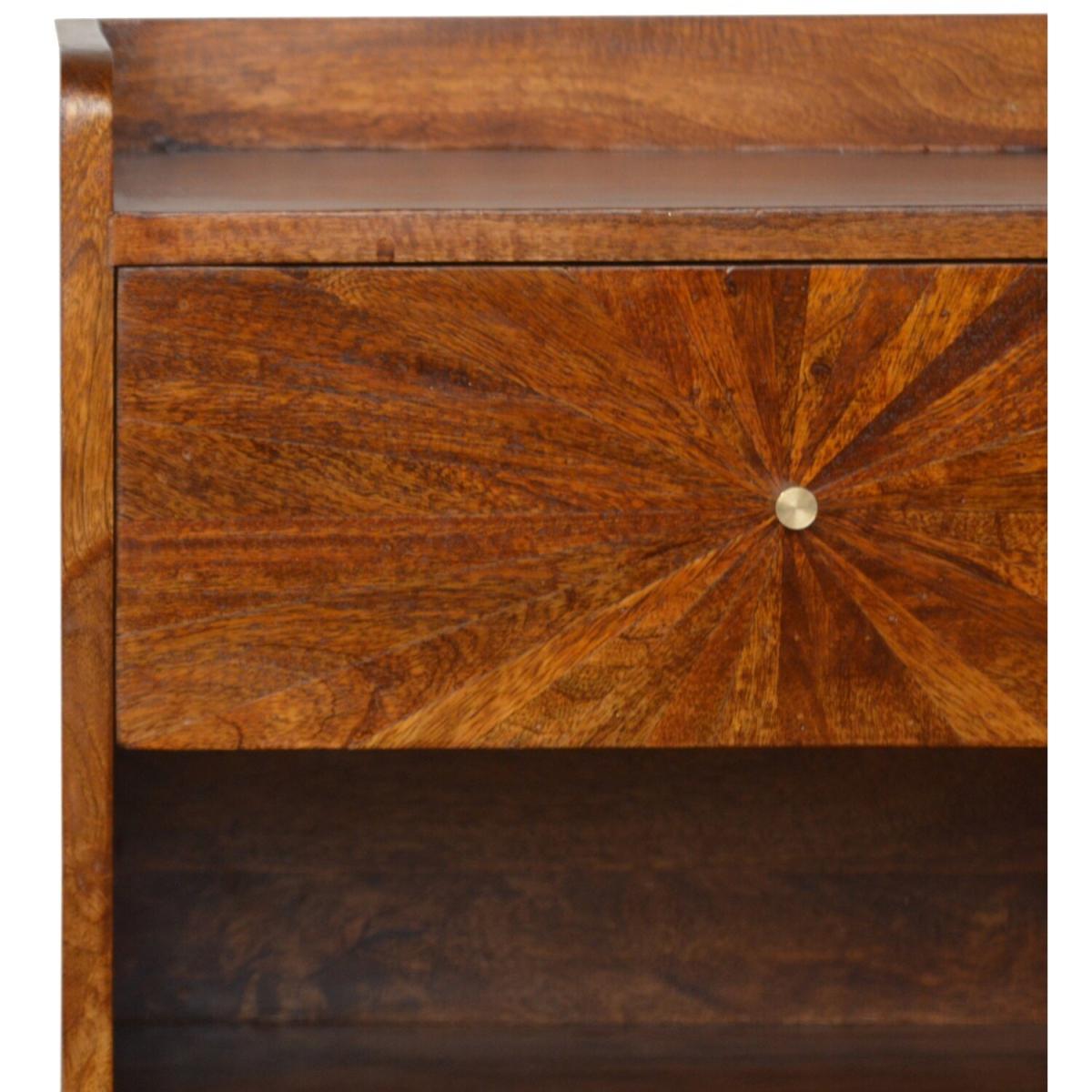 For storing bits and pieces before bedtime, this piece of furniture will prove handy all over your home. It is constructed from 100% solid mango wood in a chestnut finish and has a sunrise pattern on the drawer front. It features 4 nordic style legs and a shiny candle knob. This bedside is bound to be the perfect partner for your bed.