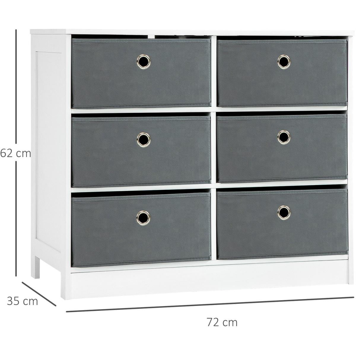 It features six drawers, giving you lots of room, with the flat surface top providing additional space. Made fabric, the drawers add a touch of softness - most importantly they can be removed to double up the space. Made from MDF for a strong and sturdy structure, this unit is completed with anti-tipped straps for safety.