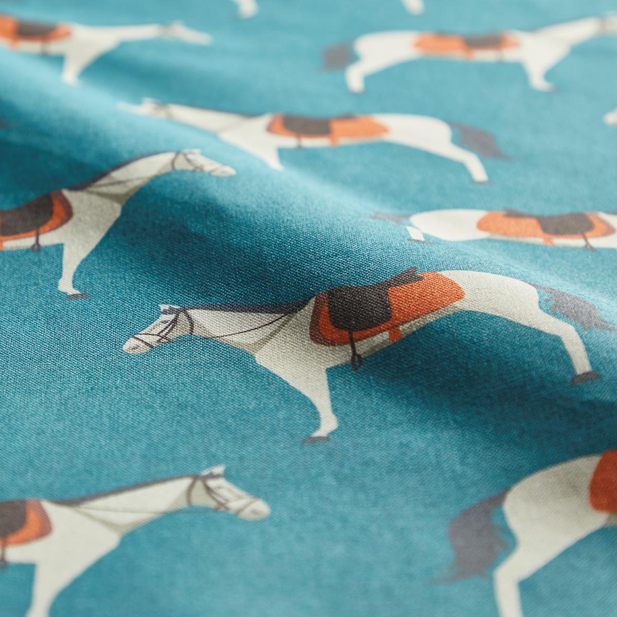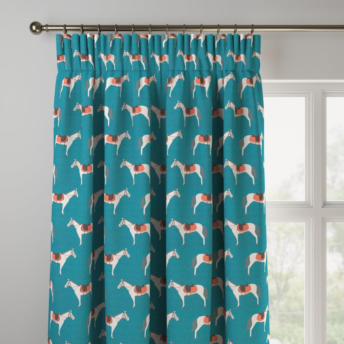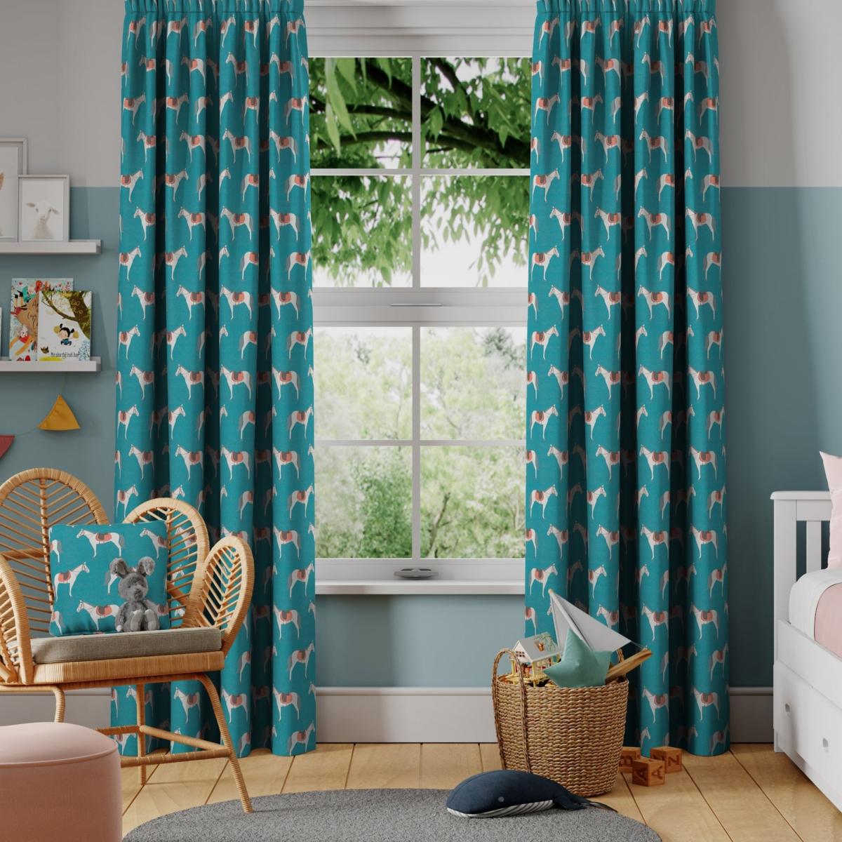 I love these Cheval curtains for their playful yet sophisticated design, especially with the whimsical horse motif on a vibrant teal background. They work exceptionally well in lively, eclectic, or coastal-inspired interiors where a pop of colour and pattern can add personality. These curtains are versatile enough to brighten a child's room, a casual living space, or even a quirky office. Practical styling tips include pairing them with solid-coloured walls to allow the pattern to stand out, and choosing understated furniture to keep the focus on the curtains. Additionally, they can be layered with blinds or sheer curtains for added flexibility in controlling light and privacy.
