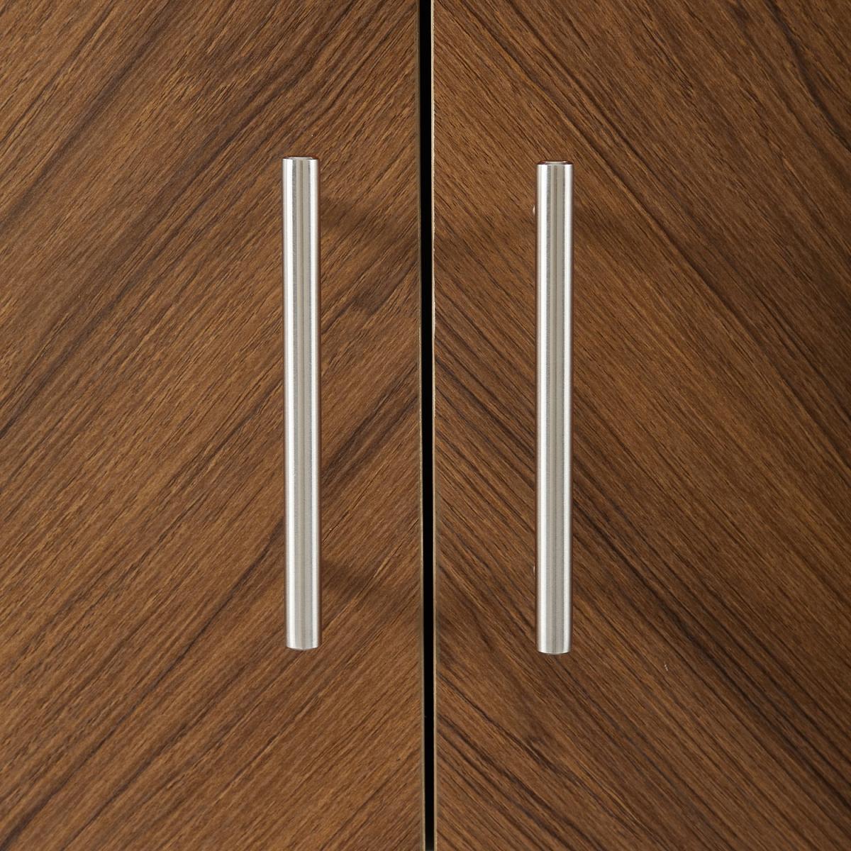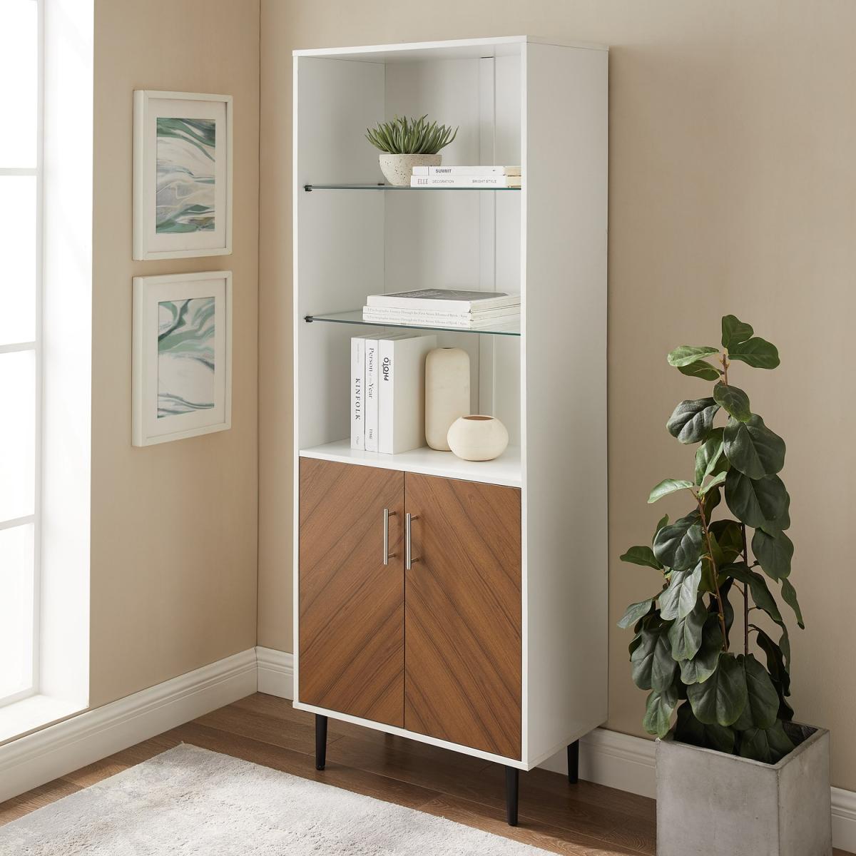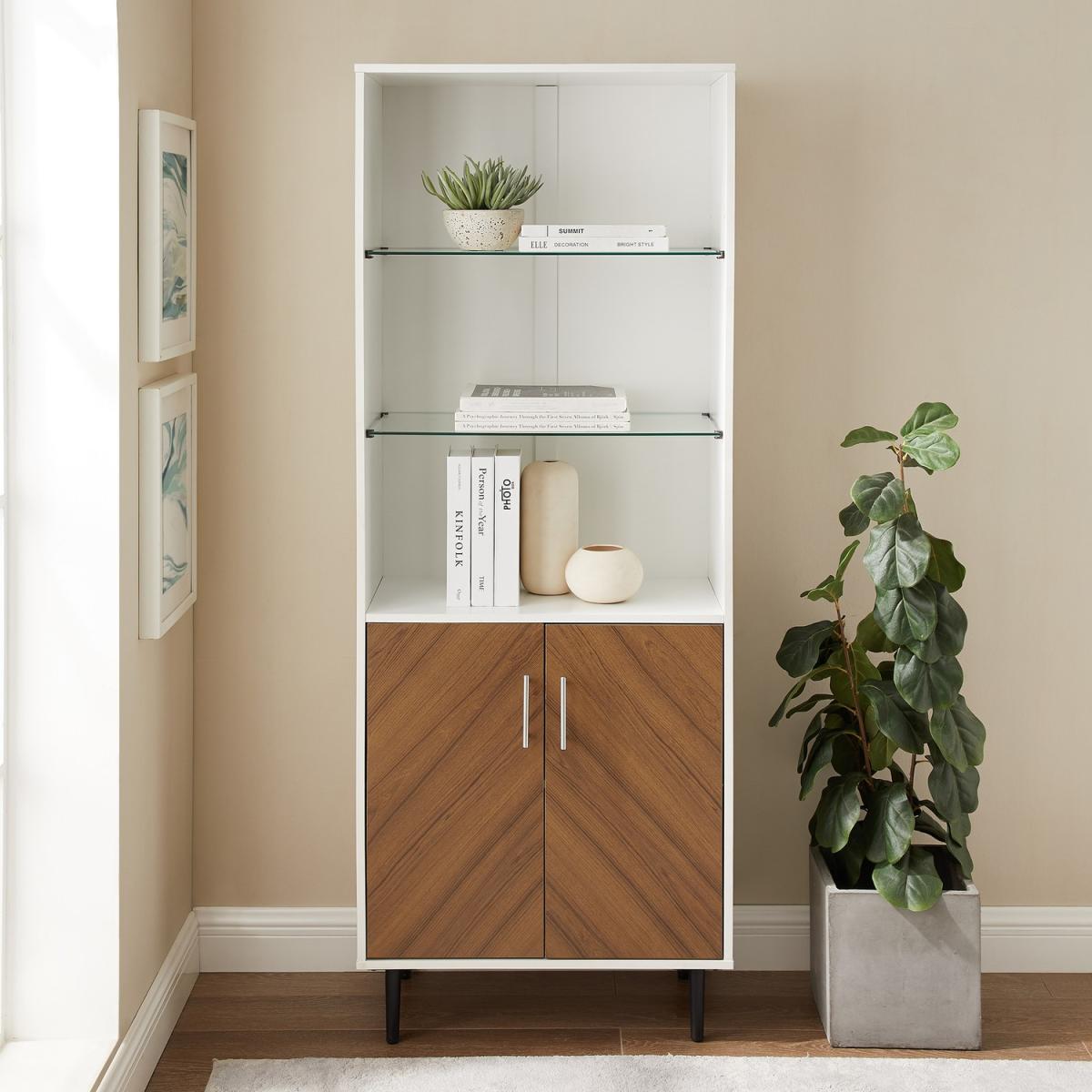 Dimensions H173 x W67 x D36 cm. Following the trend for herringbone wood this modern shelving unit has a chevron bookmatch finish which would elevate any contemporary interior. Combining open shelves for decorative accessories and a closed storage cabinet for hiding away clutter this bookcase functions on two levels to help you organise your space. Designed with practicality in mind each glass shelf is adjustable and the bookshelf stands on strong sturdy metal legs. This modern shelf is rooted in mid-century style with contemporary design updates that would be at home in any modern glam interior. Place in your living room to display your accessories for the perfect #shelfie or even in your home office to store paperwork and books in style. Features. Faux bookmatch doors2 doors with soft close hinges1 adjustable wood shelf2 adjustable tempered glass shelves. Open and closed storage Wall anchoring hardware included..
