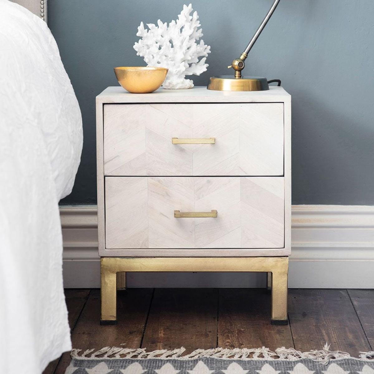 I’m a fan of the chevron bedside for its clean, subtle pattern and warm brass base - it sits equally well in contemporary, Scandi or modern coastal schemes. The pale finish keeps the look light while the metal legs add a hint of luxury without feeling fussy. To style it, keep the surface simple: a streamlined lamp, a small vase or sculptural object and a neat stack of books. Group any metallics you use - say a brass bowl or frame - with the legs to create harmony, and anchor the unit with a rug that extends beneath it so the whole corner feels considered.