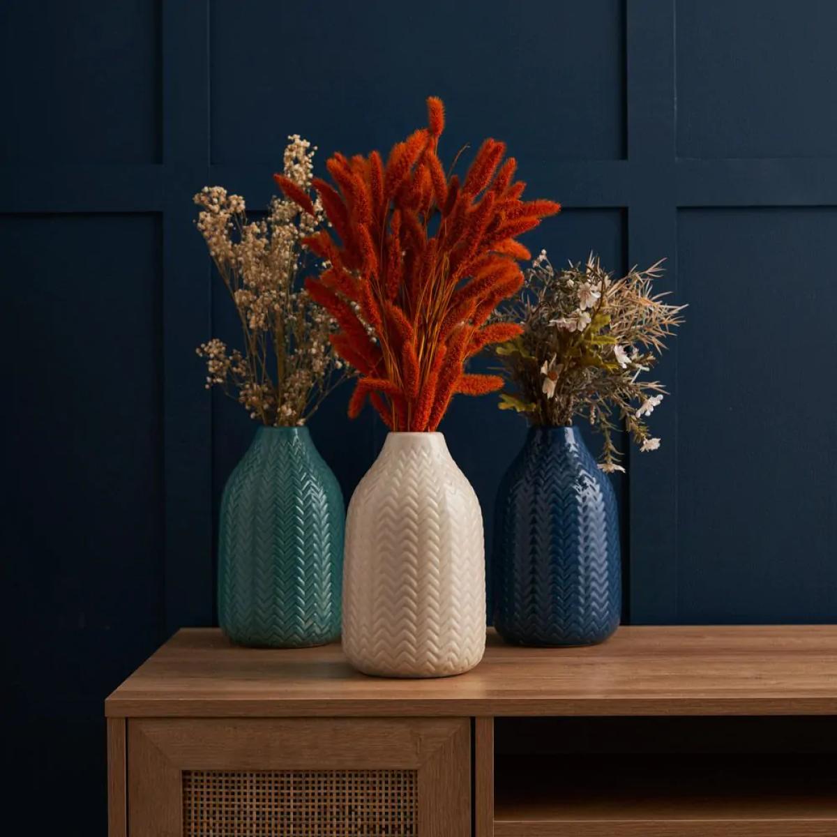 I love this vase for its subtle pattern and versatile cream tone, making it a great addition to a neutral or pared-back scheme. It works particularly well in understated, contemporary interiors, but can also bring a soft touch to more eclectic or rustic spaces. For styling, try pairing it with dried grasses or minimalist bouquets for a simple, chic look, or let it stand on its own as a sculptural piece. Its size and shape lend themselves well to coffee tables, shelves, or sideboards, where it can add visual interest without overwhelming the space. Overall, it's a practical yet elegant piece that can effortlessly elevate a variety of interiors.