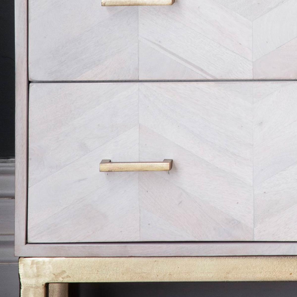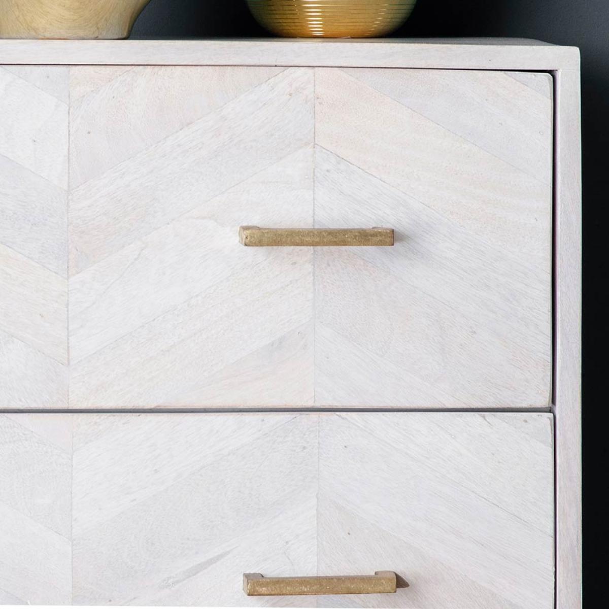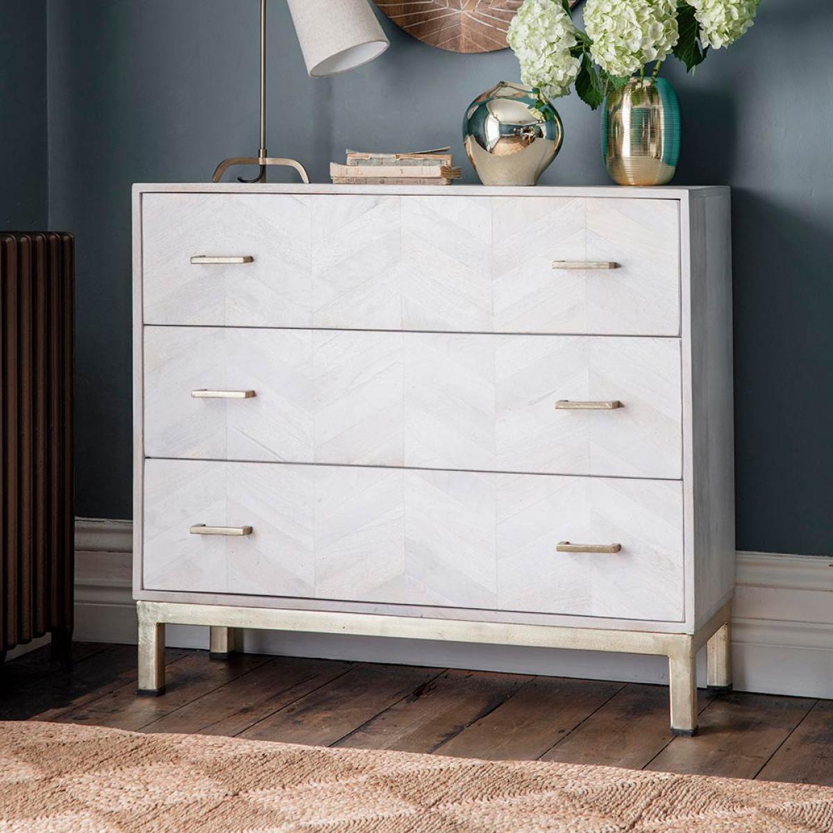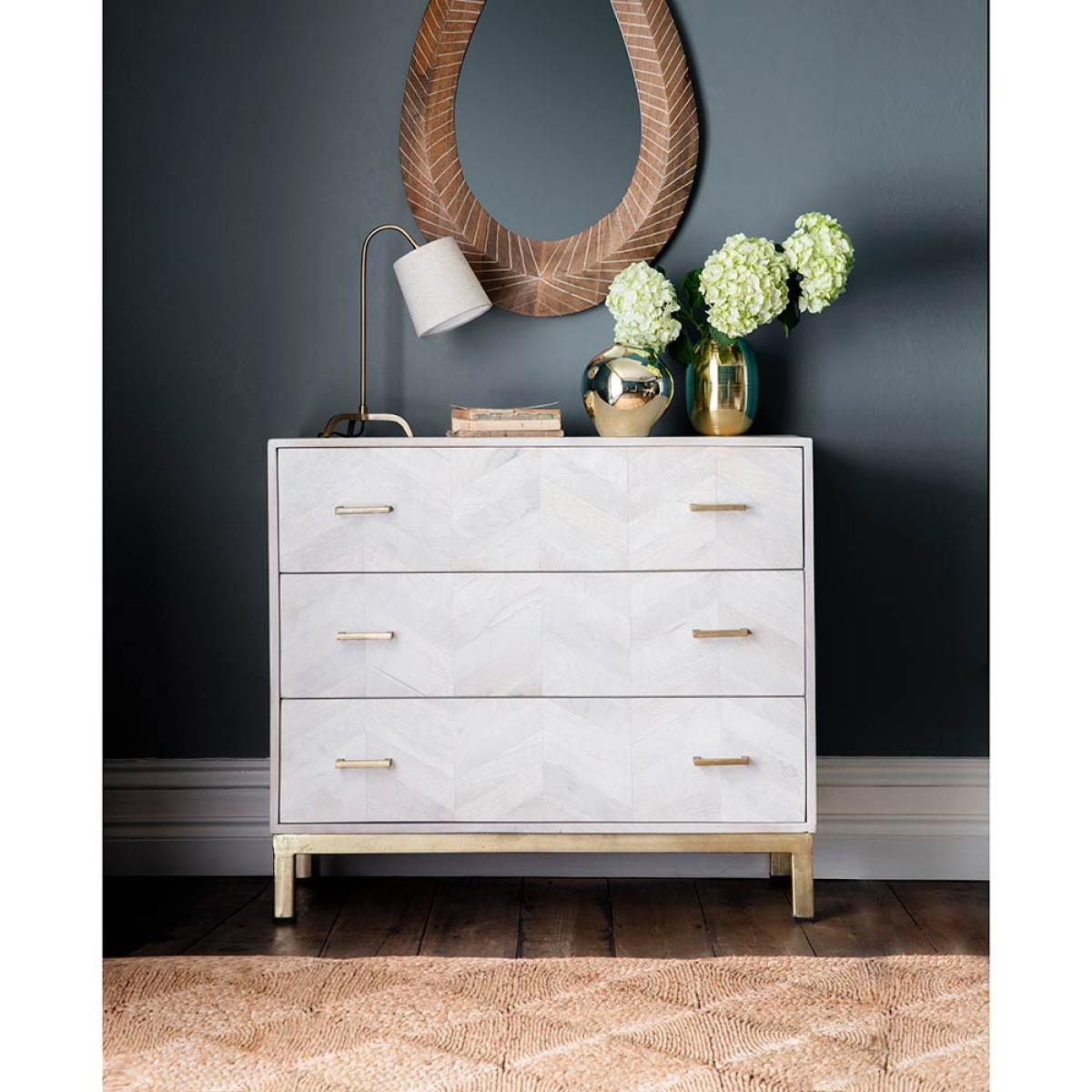 Whether you need extra storage in the bedroom or are thinking about giving the room a whole new look, our Chevron Chest of Drawers combines statement style with savvy storage in one. With its whitewash mango wood drawer design and brass plated frame and handles, it perfectly blends classic and contemporary design with matching Chevron Bedside Drawers also available for a fully co-ordinated finish. Great for guest rooms, too.