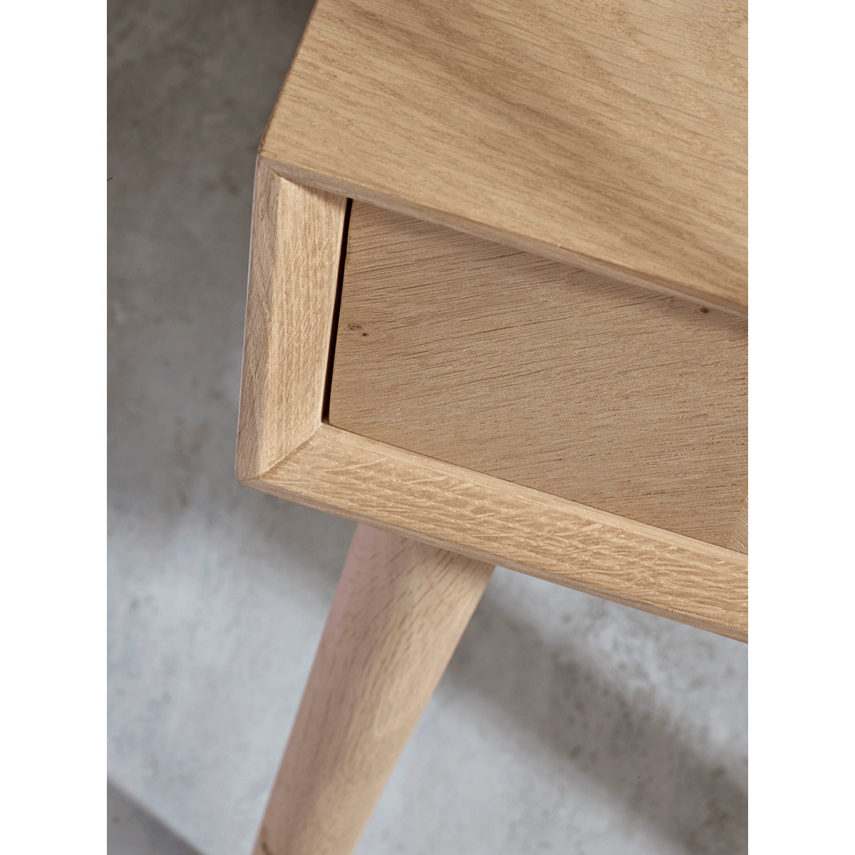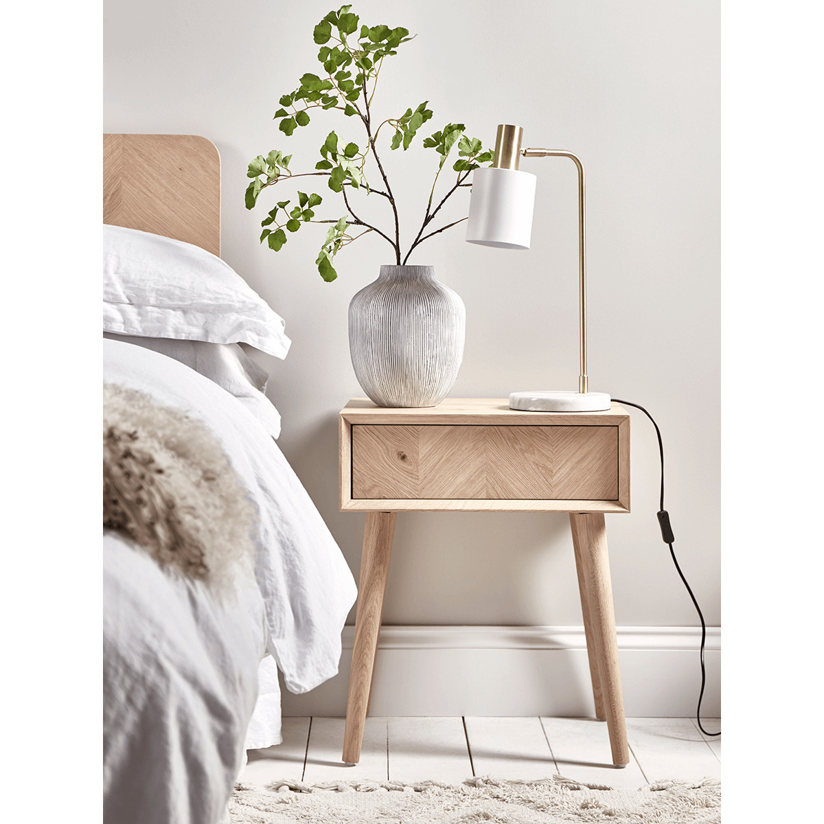 The perfect bedside table for a neutral or Scandi inspired bedroom, our stylish blonde oak table features four slender, tapered legs and a subtle chevron finish. Each piece has a handy hidden drawer for added storage, and pairs beautifully with other pieces from our Chevron Oak Furniture Collection.