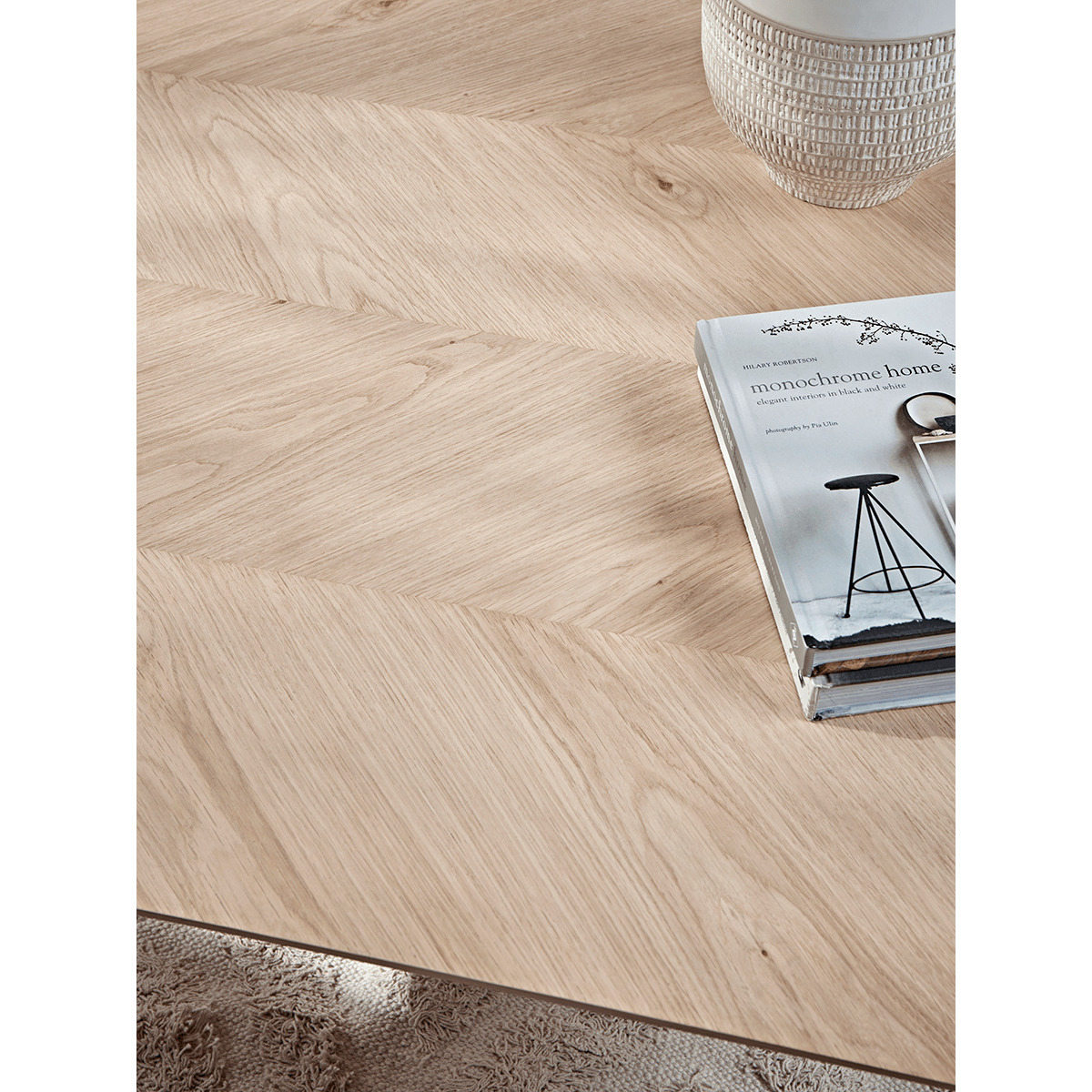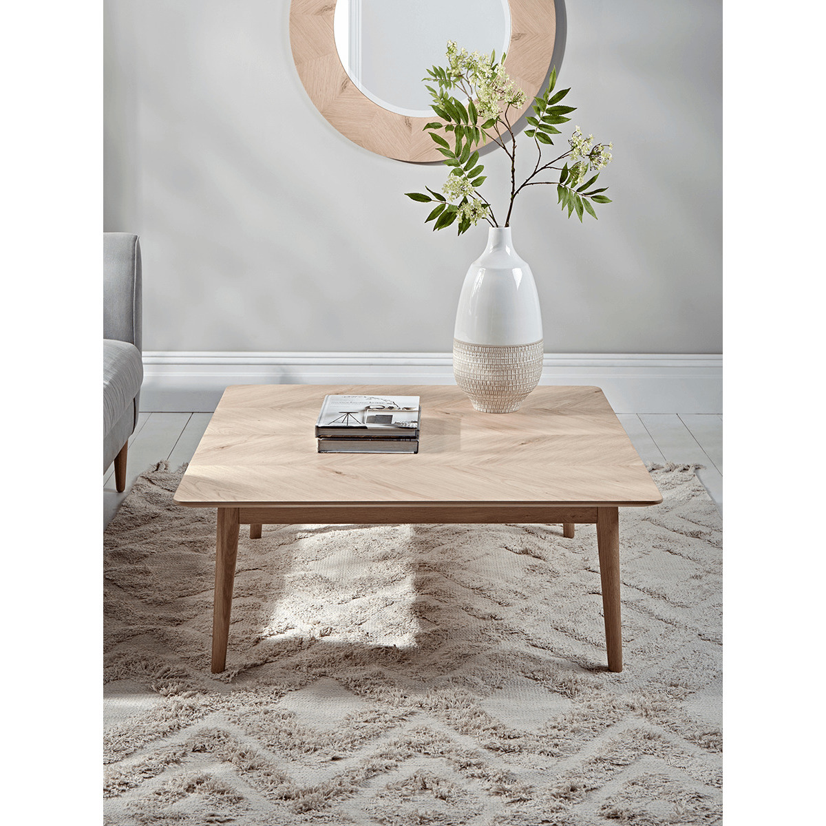 The perfect coffee table for a neutral or Scandi inspired interior, our stylish blonde oak piece features four slender, tapered legs and a subtle chevron finish. Place in front of your sofa or armchair for a stylish centrepiece to your living space. Discover other pieces from our Chevron Oak Furniture Collection.