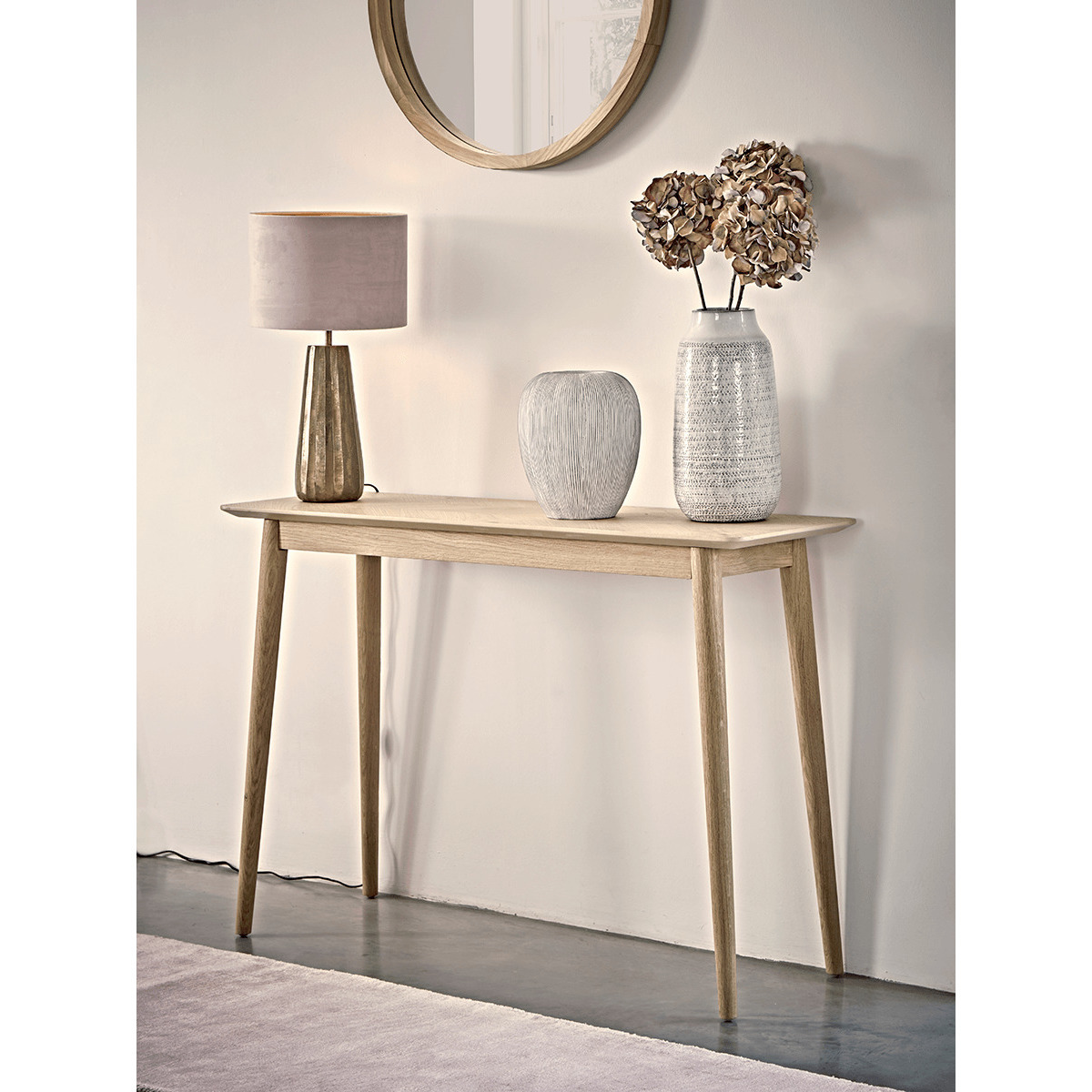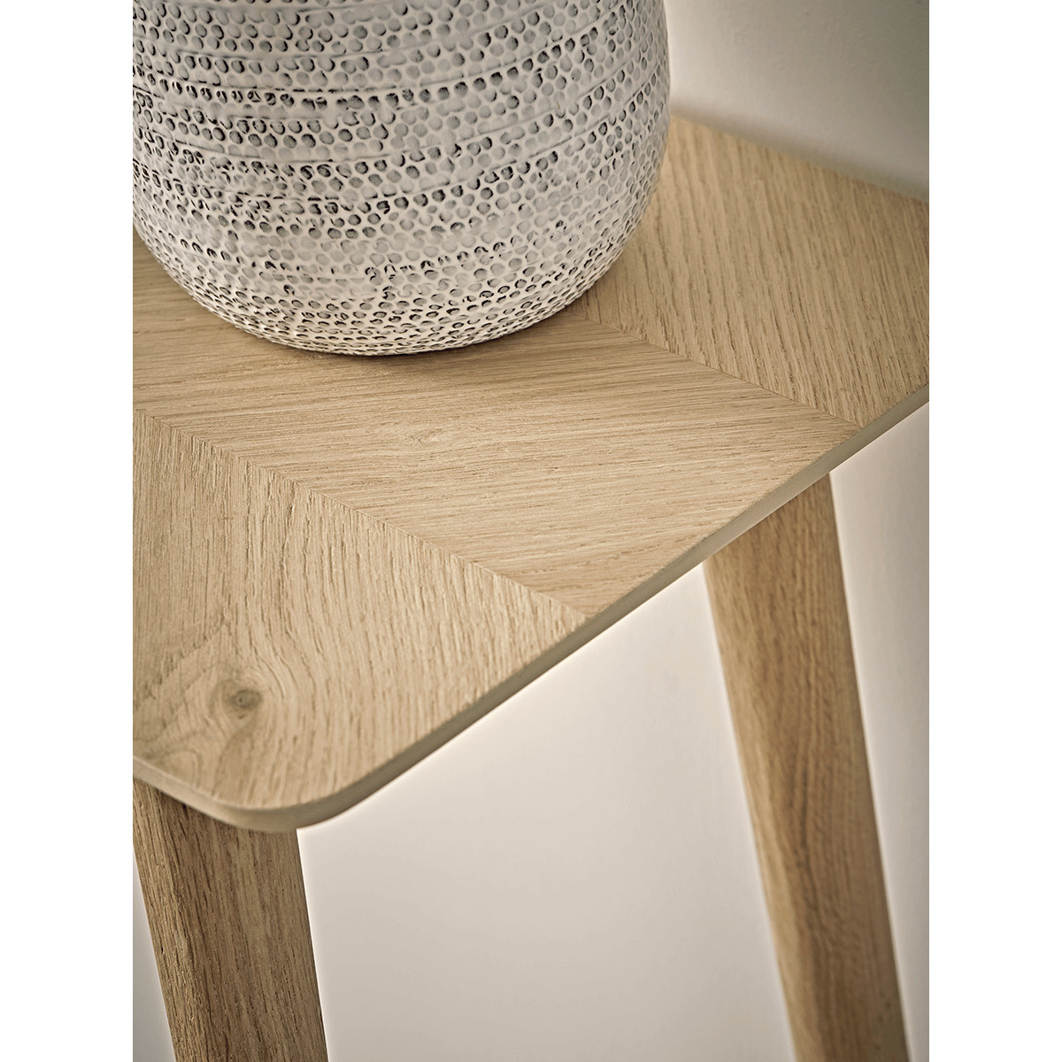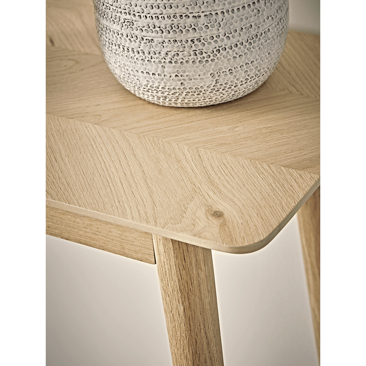 The perfect console table for a neutral or Scandi inspired interior, our stylish blonde oak table features four slender, tapered legs and a subtle chevron finish. Place in your hallway or living room for a stylish finish.