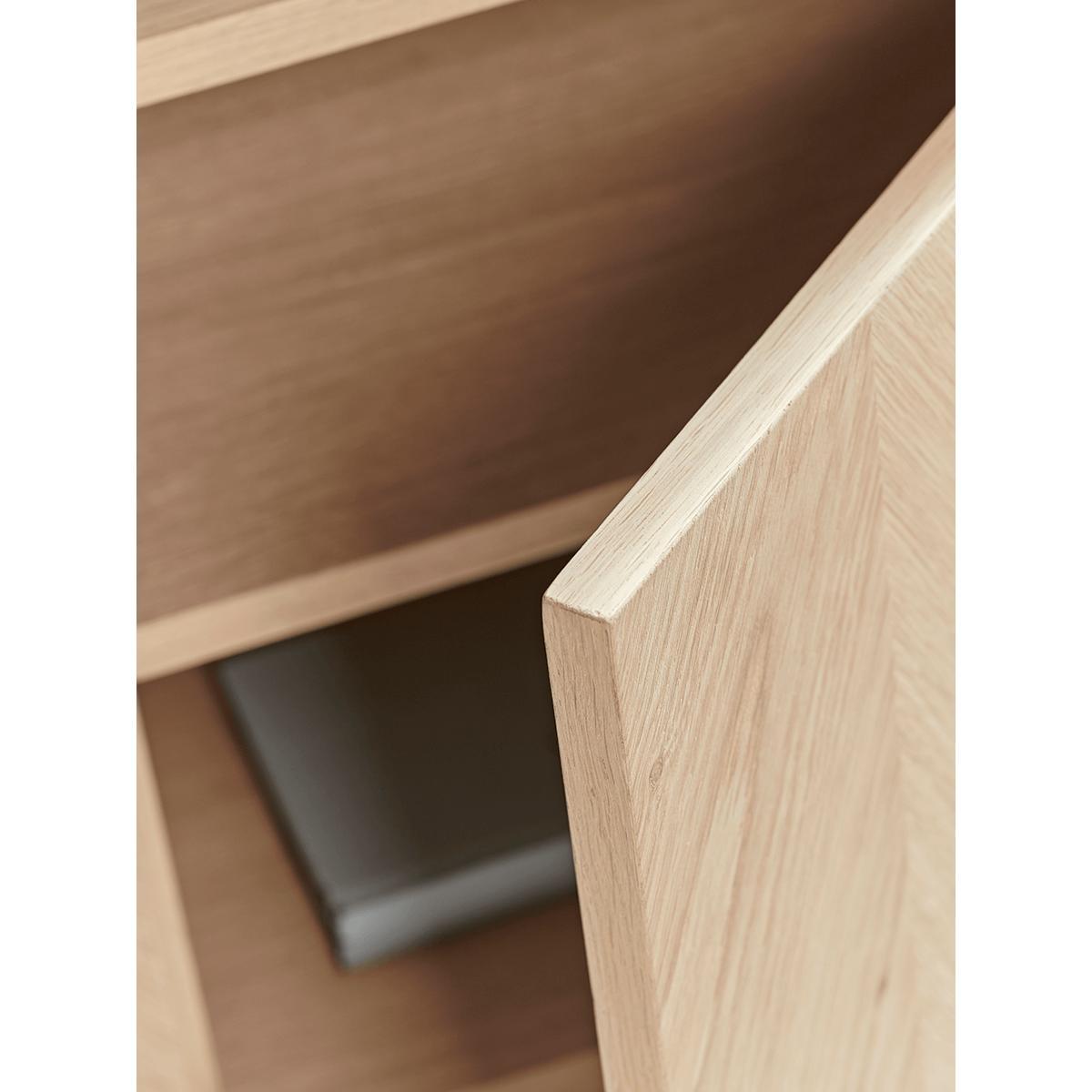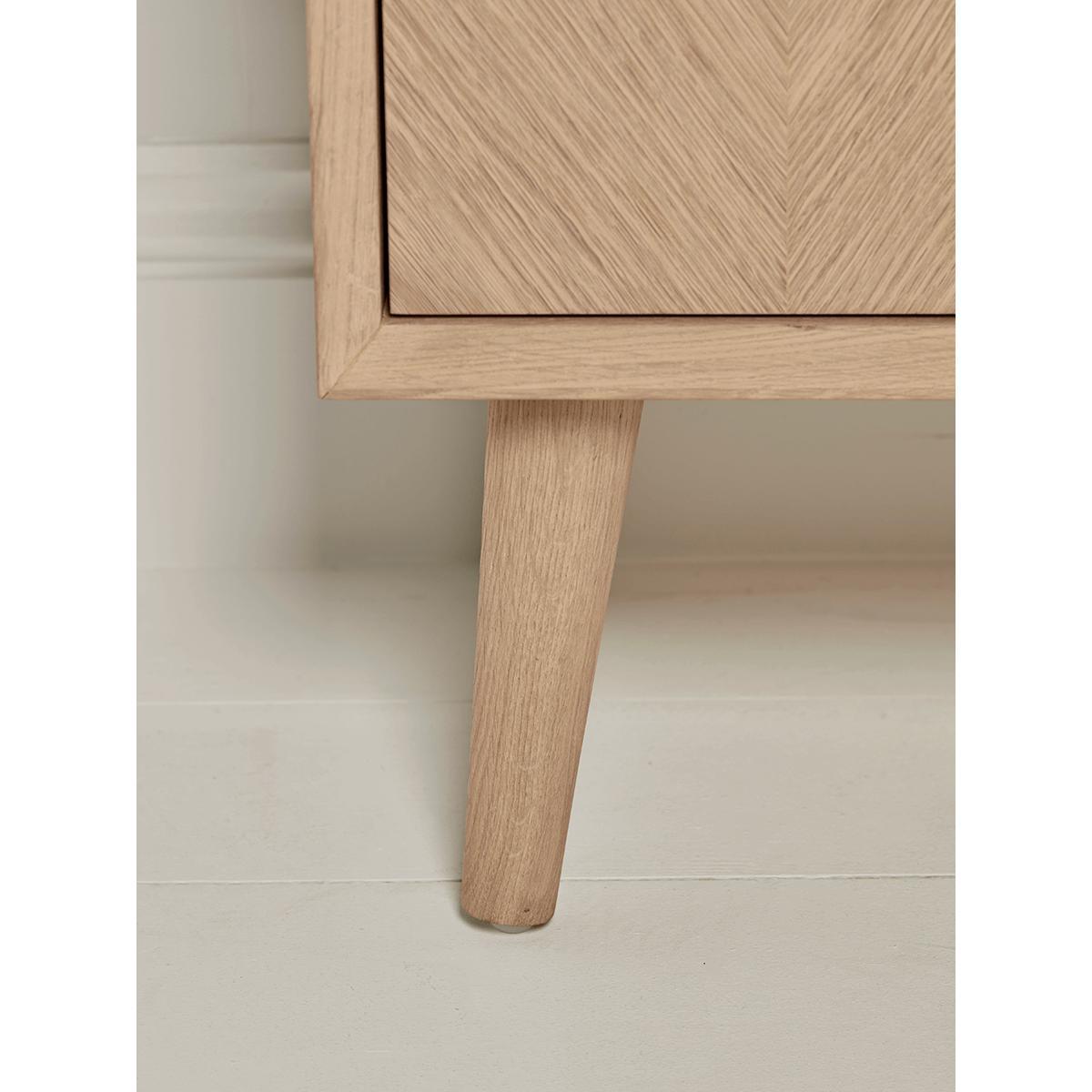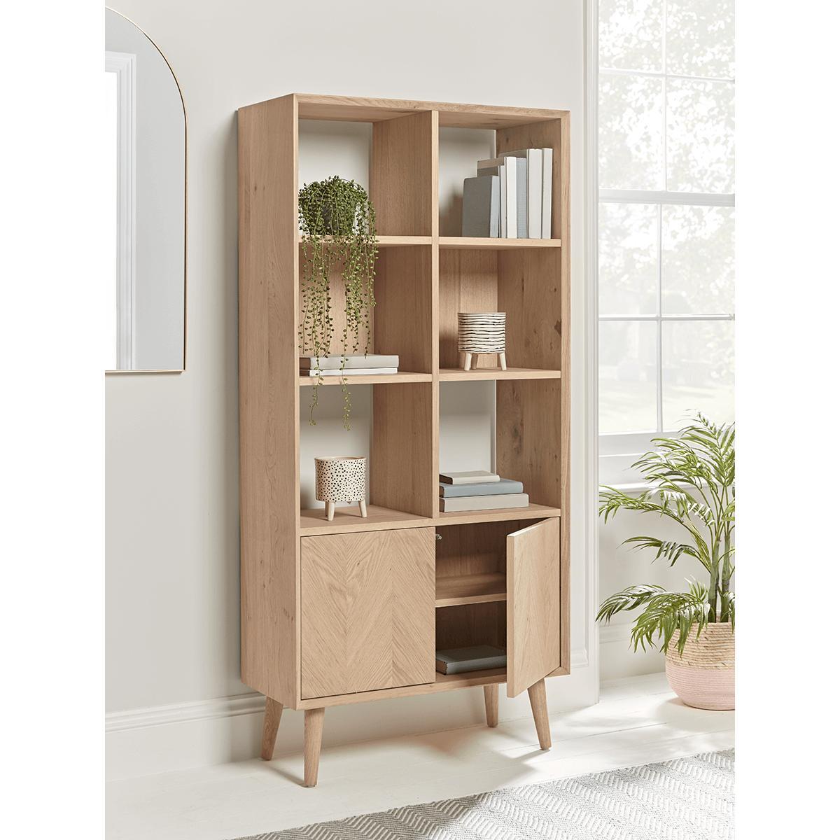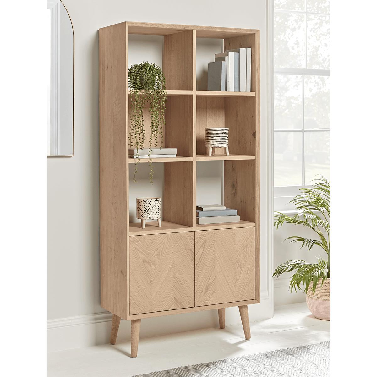 The perfect addition to any neutral or Scandi inspired interior, our stylish Chevron Oak Display Unit features four slender, tapered legs and a subtle chevron finish. Each piece has six spacious, open shelves with plenty of room for displaying greenery, books and ornaments. Below are two generous cupboards with push-click closing mechanisms and adjustable interior shelves for flexible storage. Crafted from beautiful blonde oak, this piece will help you create a serene, laid back aesthetic in your home. Complete your entire look with other pieces from our. Chevron Oak Collection.