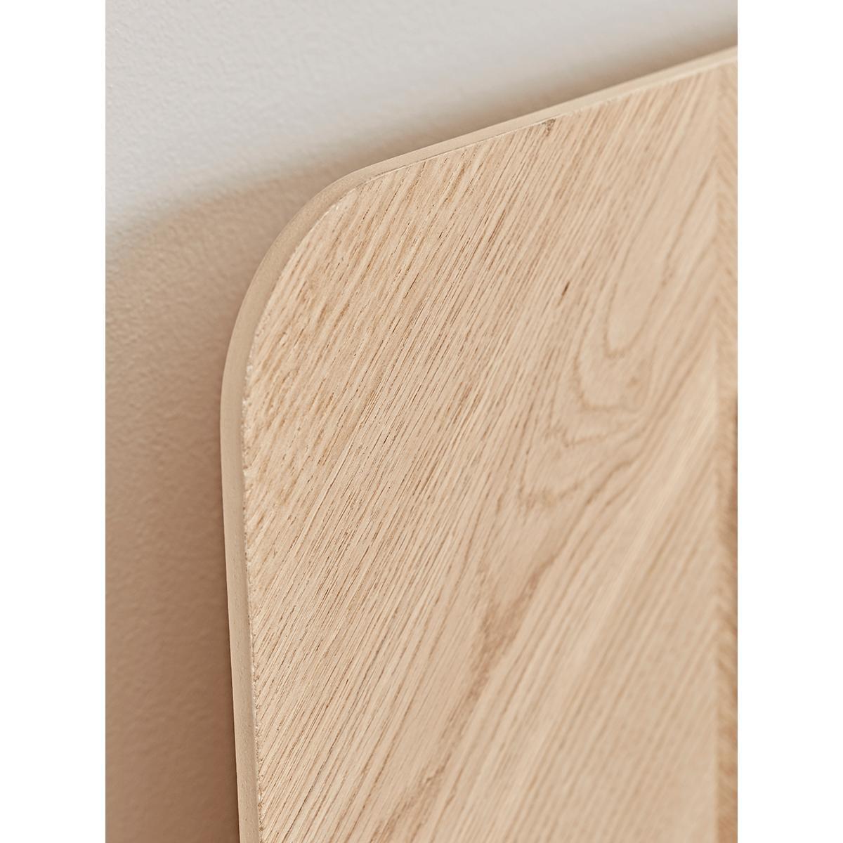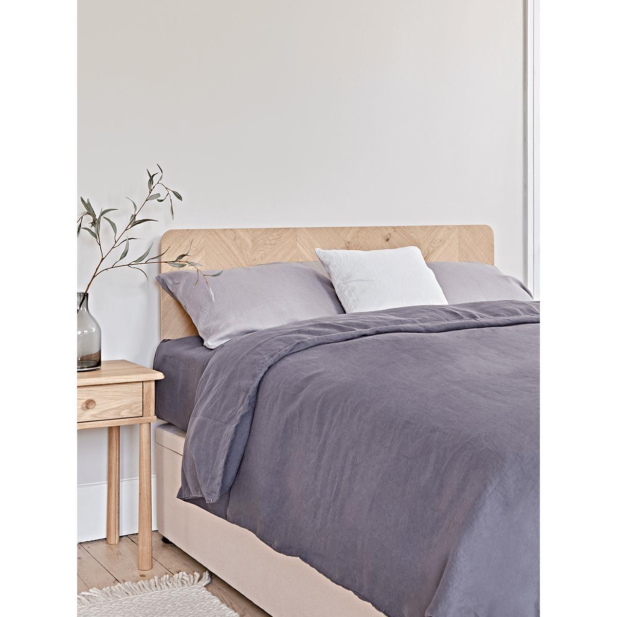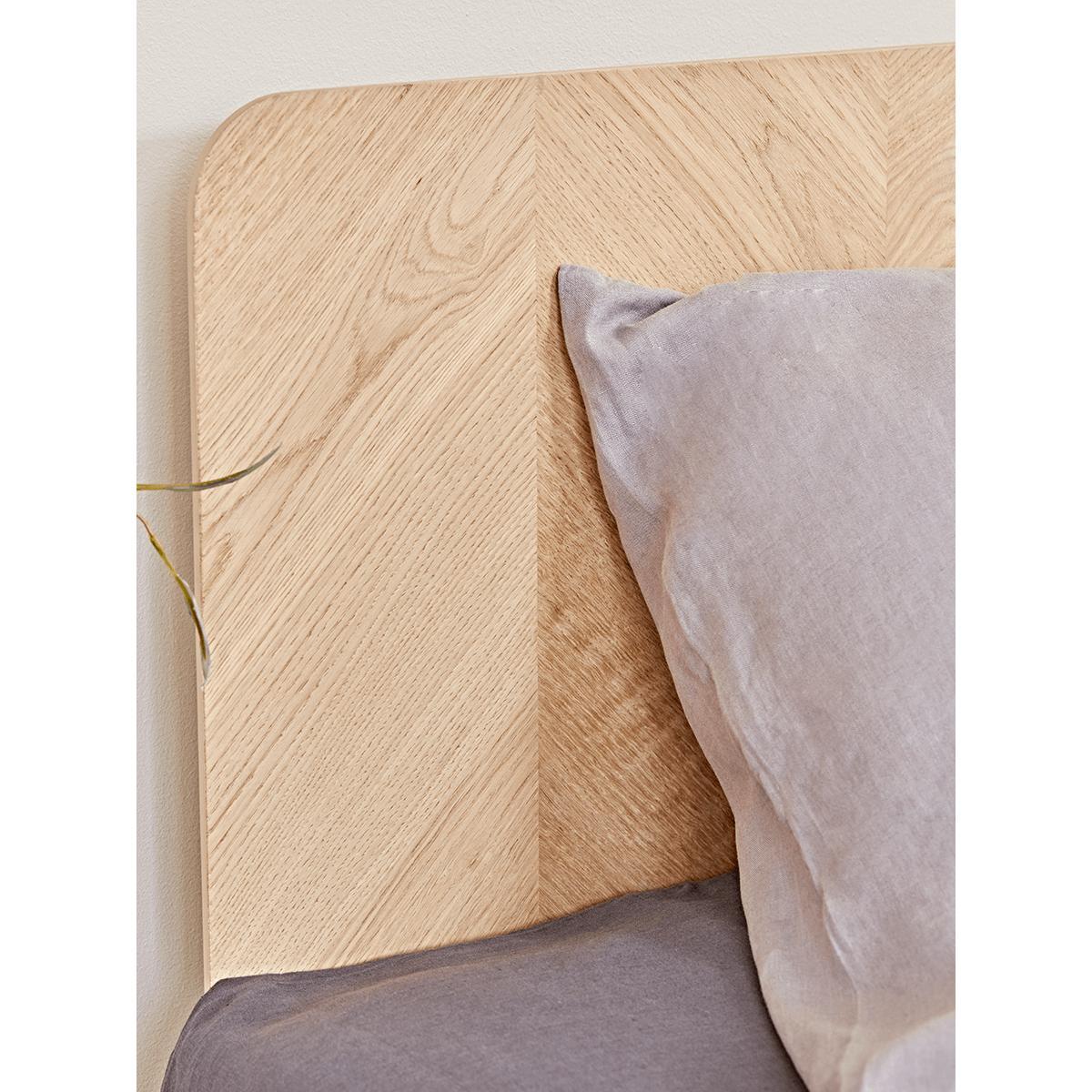 Our headboard is striking in its simple form, and crafted from soft toned oak and oak veneer and is available in both a double and a kingsize. Perfectly paired with a minimal interior, a subtle chevron design reaches to the very edge of this clean, principled Nordic piece. We have styled here with our. Grey Lina Storage Bed Base. For complementing bedroom furniture, see our. Chevron Oak Furniture Collection.