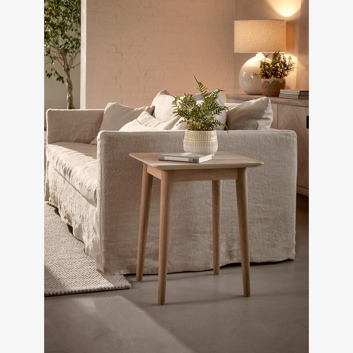 I’m a big fan of the chevron oak table for its clean lines and compact footprint - it’s ideal where you need a practical surface without overwhelming the room. The pale oak finish sits comfortably in Scandi-inspired schemes, modern minimal interiors or any space that benefits from a light, natural accent. Styling-wise, use it beside a sofa or armchair to hold a simple lamp and a small potted plant, or group two together as a nightstand alternative with a stack of art books. Its neutral tone means it pairs well with textured fabrics (think linen or boucle) and muted rugs to keep the look cohesive.