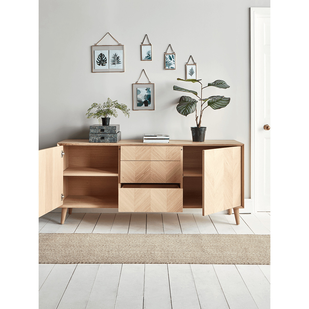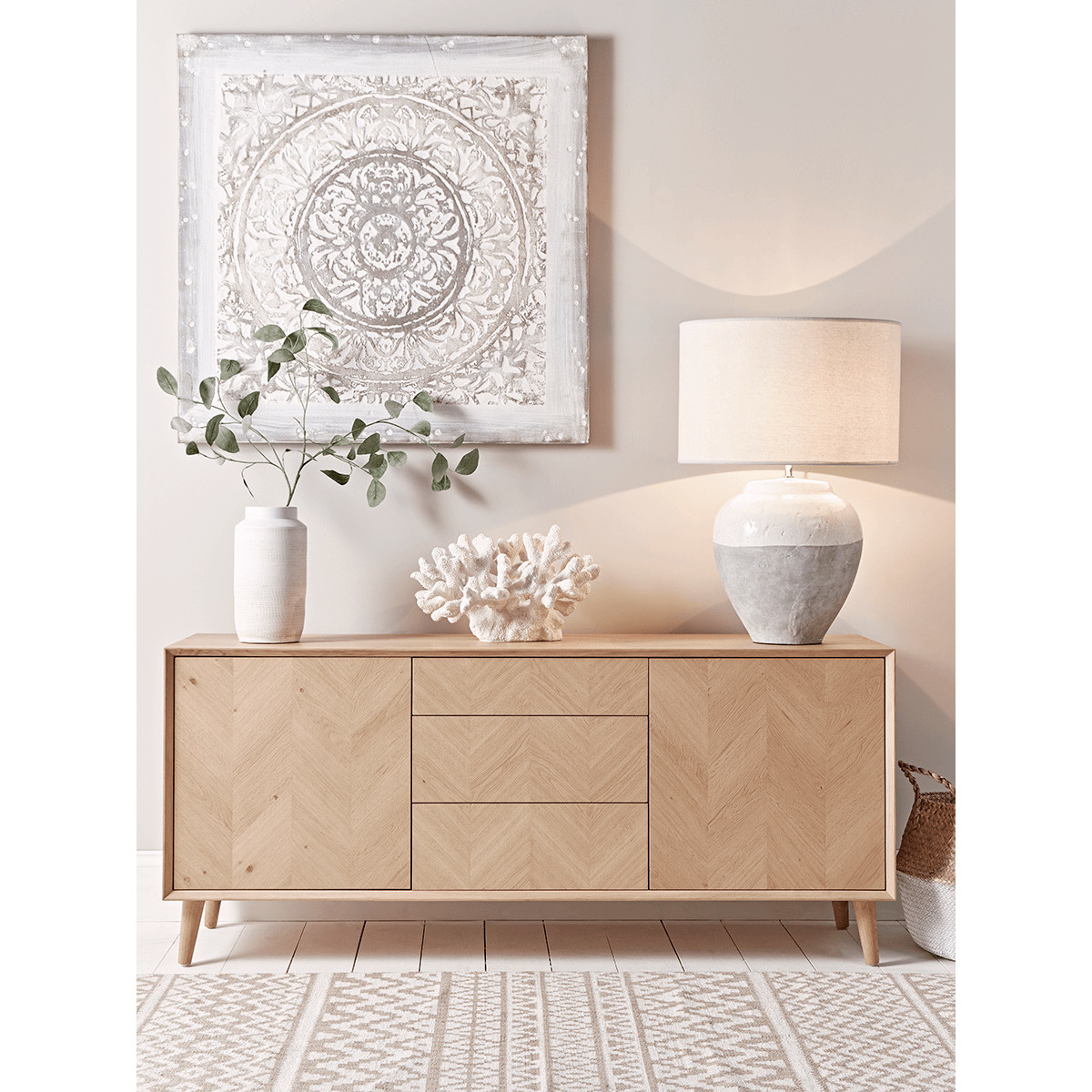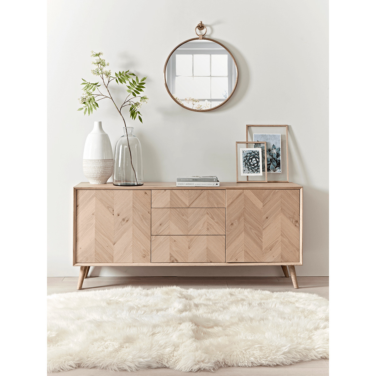 The perfect sideboard for a neutral or Scandi inspired interior, our stylish blonde oak piece features four slender, tapered legs and a subtle chevron finish. Each piece has three handy drawers for ample storage, and pairs beautifully with other pieces from our. Chevron Oak Furniture Collection. Try styling your sideboard beneath a classic. Round mirror.