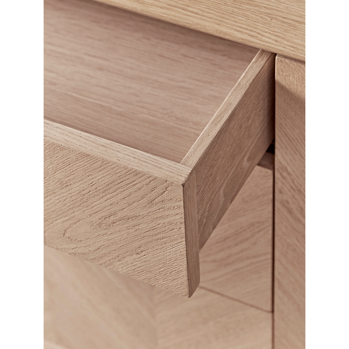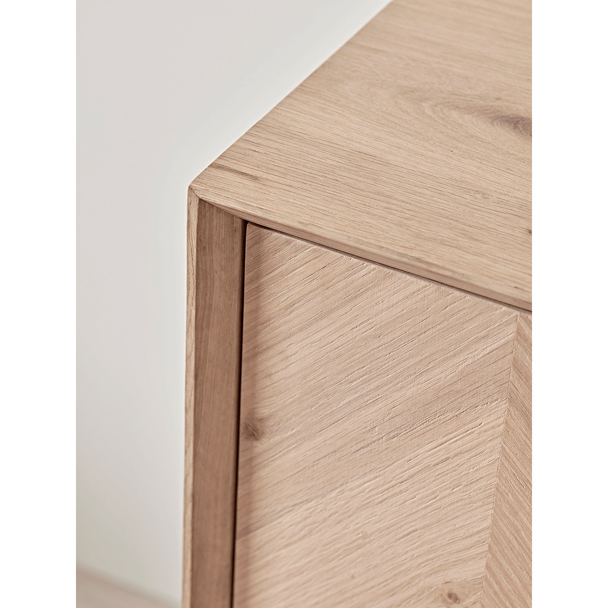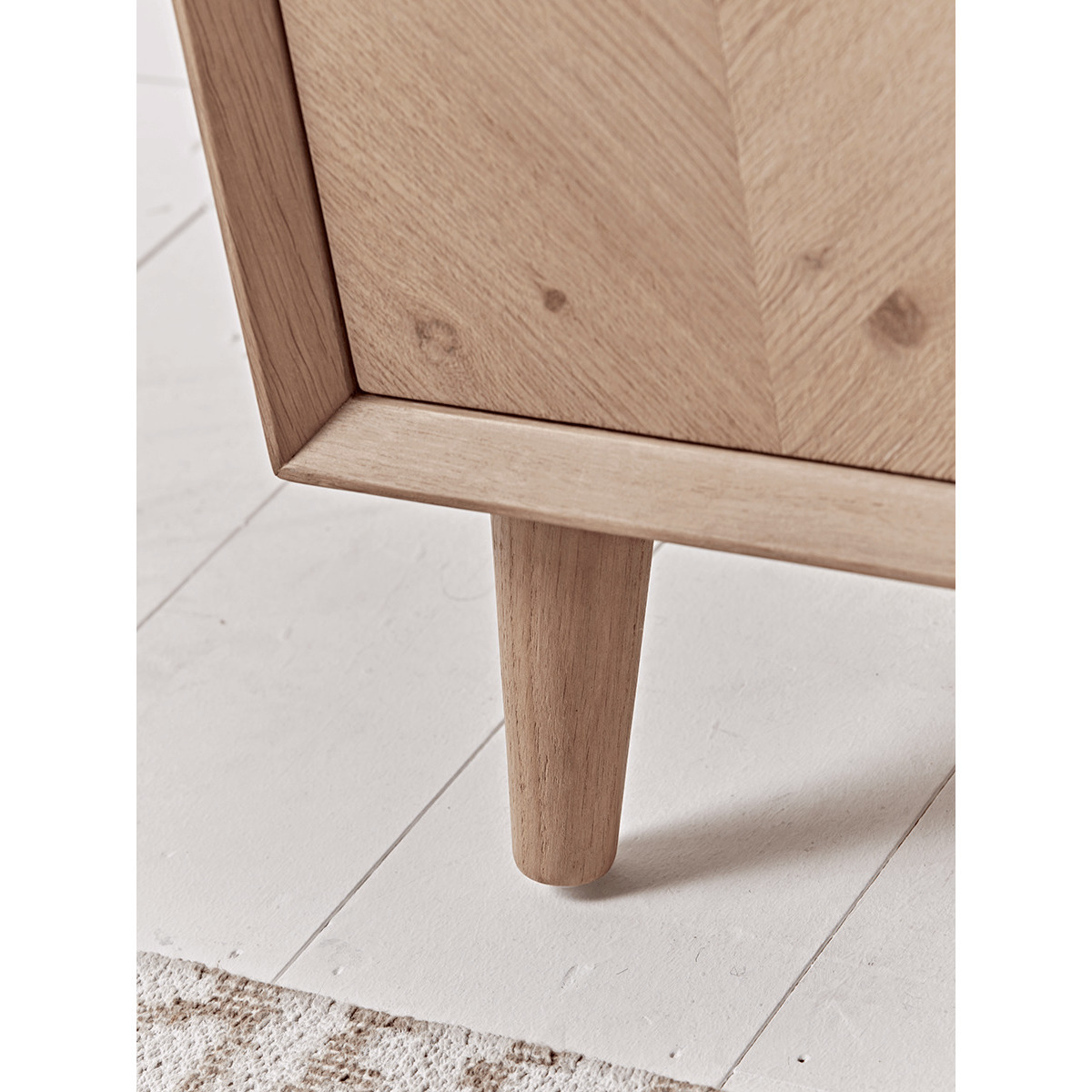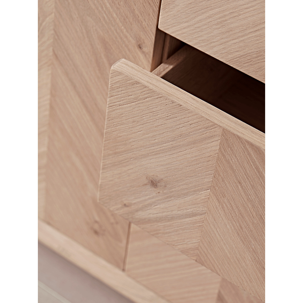 The perfect sideboard for a neutral or Scandi inspired interior, our stylish blonde oak piece features four slender, tapered legs and a subtle chevron finish. Each piece has three handy drawers for ample storage, and pairs beautifully with other pieces from our. Chevron Oak Furniture Collection. Try styling your sideboard beneath a classic. Round mirror.