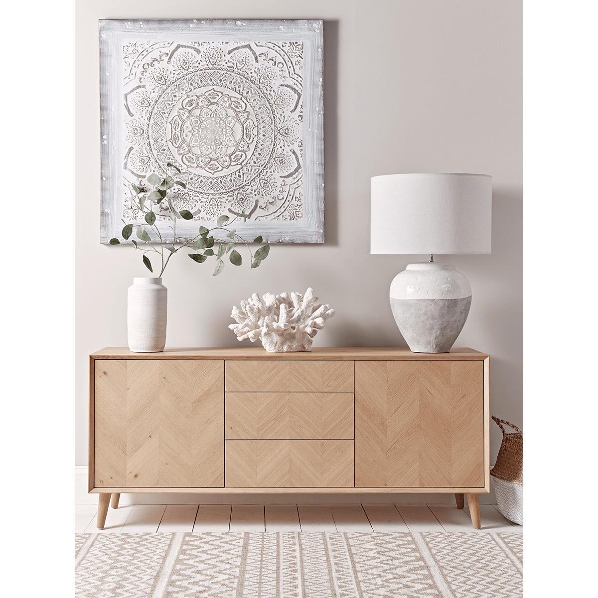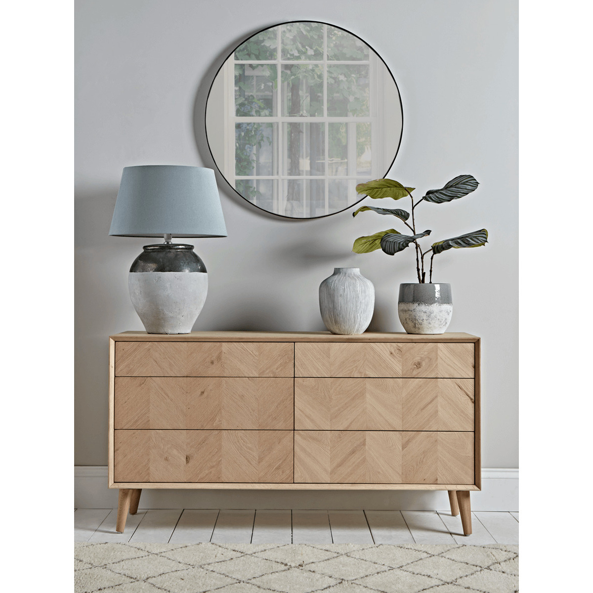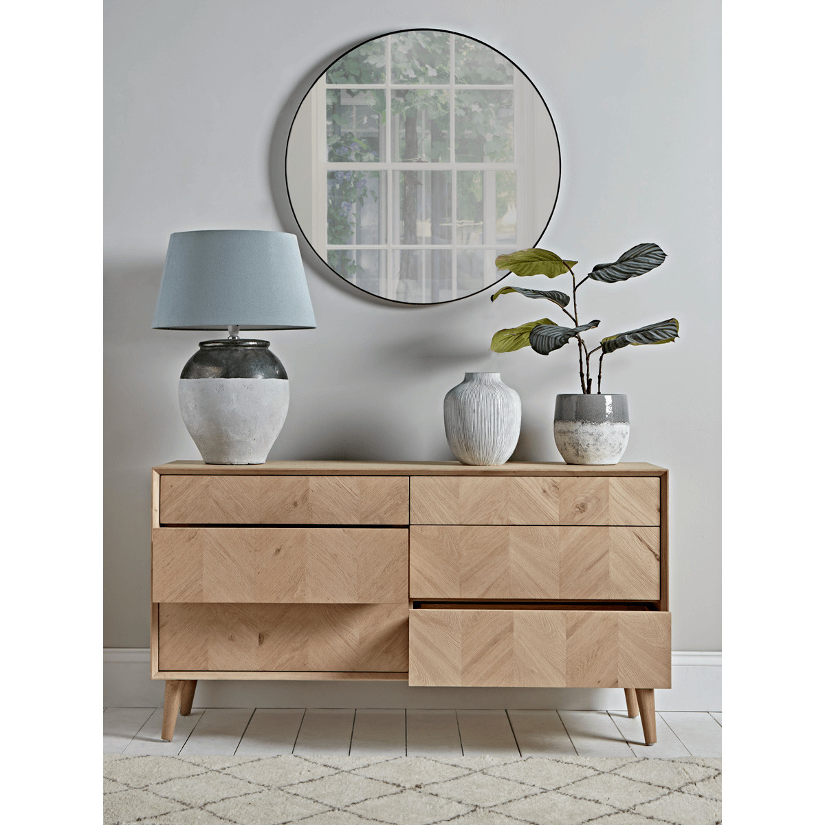 I’m a big fan of this chevron oak sideboard for its clean lines and versatile wood texture. The subtle chevron pattern adds interest without overwhelming, so it sits equally well in Scandi-inspired, coastal or modern farmhouse schemes. Six drawers give you plenty of hidden storage, keeping surfaces clutter-free. Styling-wise, I’d anchor it with a round mirror or slim artwork above, then layer in a ceramic lamp, a low vase of foliage and a couple of small sculptural objects. Keep your colour palette neutral with occasional dark or muted hues for contrast, and let the oak grain remain the focal point.