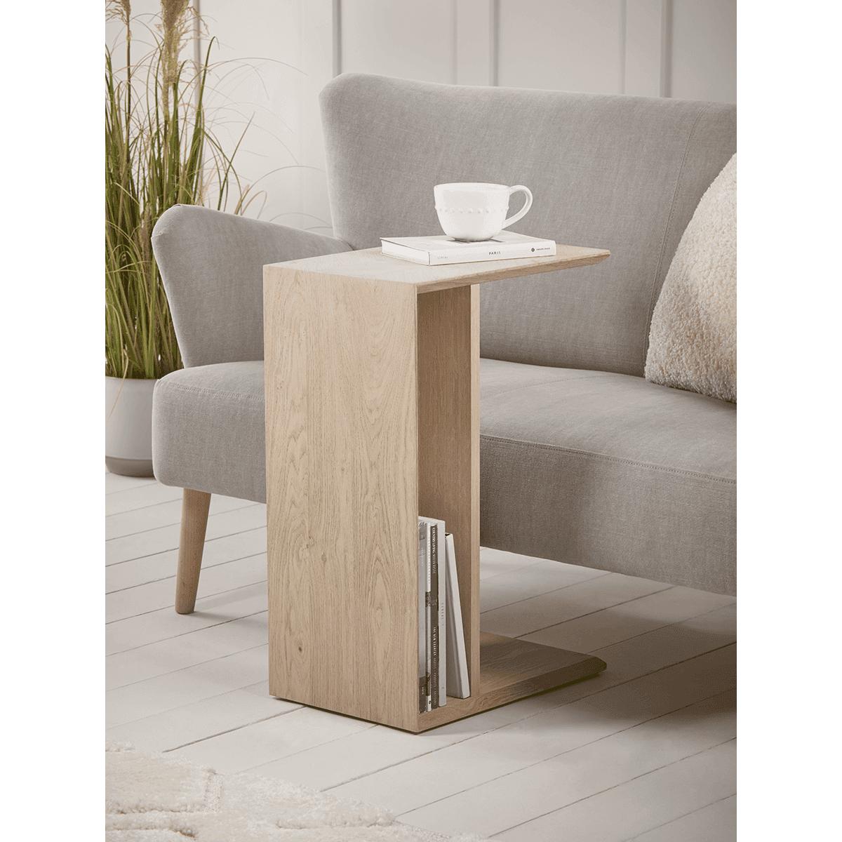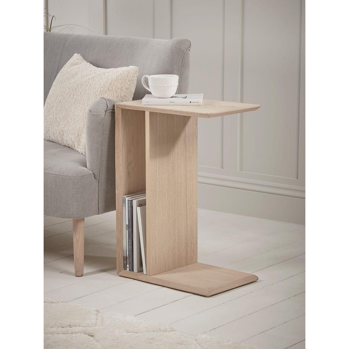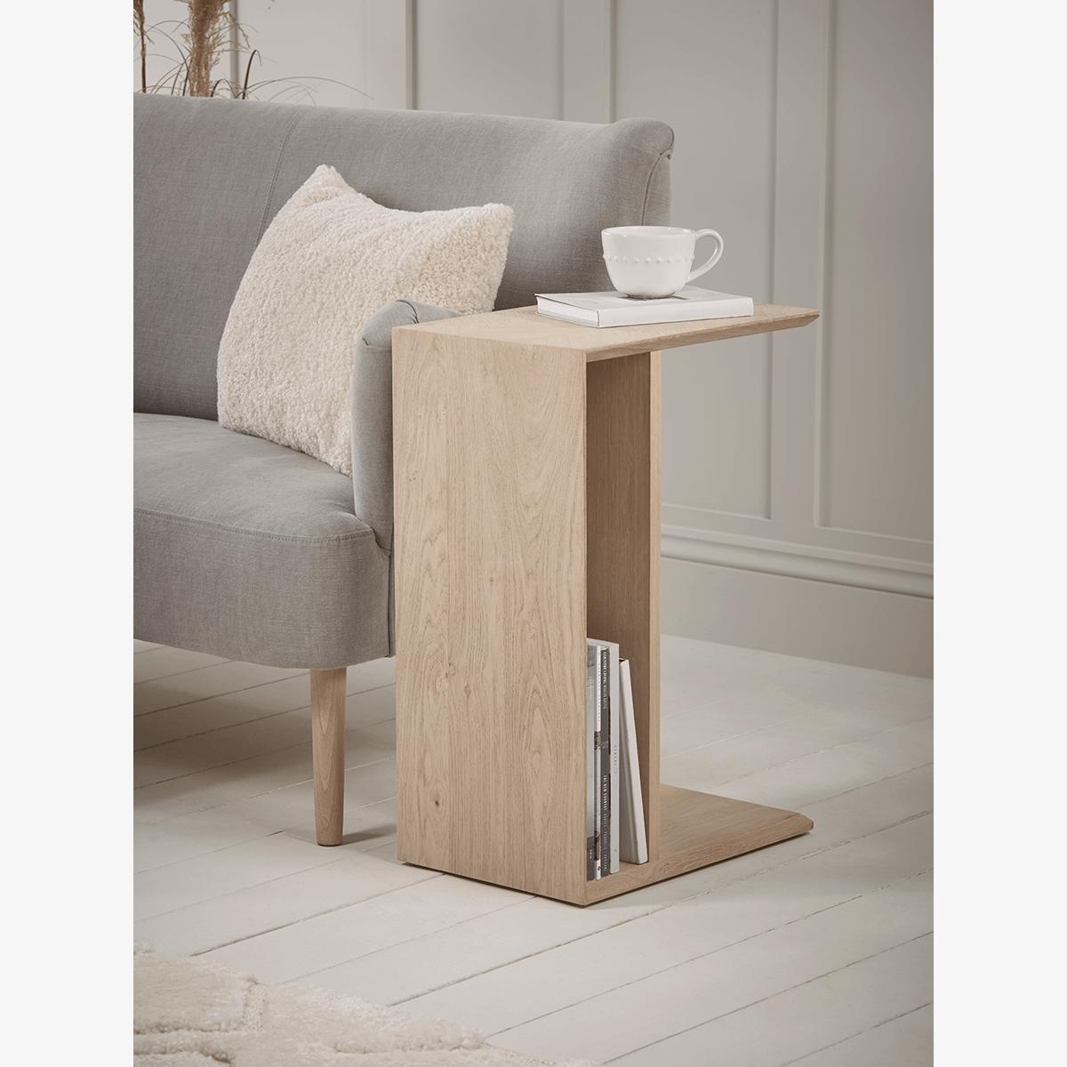 I’m really taken with this chevron oak side table for its smart C-shape design and natural oak grain - it slips neatly under a sofa arm, keeping drinks or your laptop within reach without crowding the floor. It suits Scandi, modern farmhouse or pared-back contemporary schemes, especially alongside neutral upholstery and textured wool rugs. For styling, lean into its slim profile by pairing a small ceramic lamp and a single framed photo on top, then slot a few magazines or slim coffee-table books in the back compartment. Add a trailing plant or a slim vase to introduce a hint of greenery and soften the angular lines.