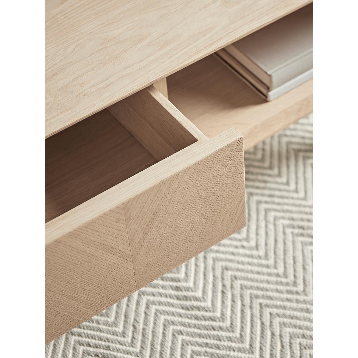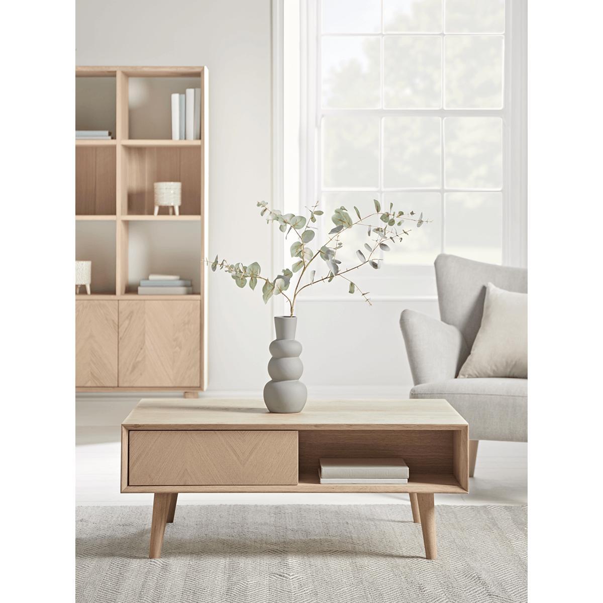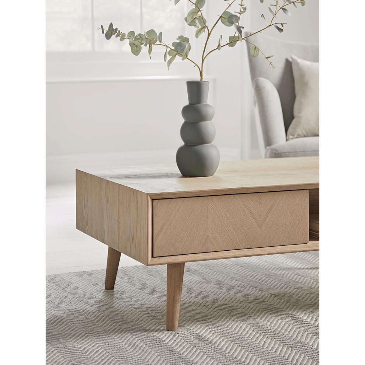 The perfect coffee table for a neutral or Scandi inspired interior, our stylish blonde Chevron Oak Storage Coffee Table features four slender, tapered legs and a subtle chevron finish. With two useful drawers and two openings on either side, place in front of your sofa or armchair for a stylish centrepiece to your living space that will also help you keep it tidy and serene. Discover other pieces from our. Chevron Oak Furniture Collection.