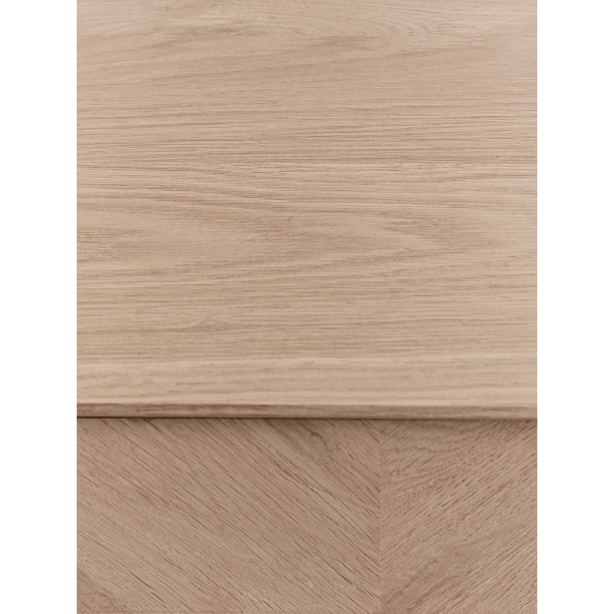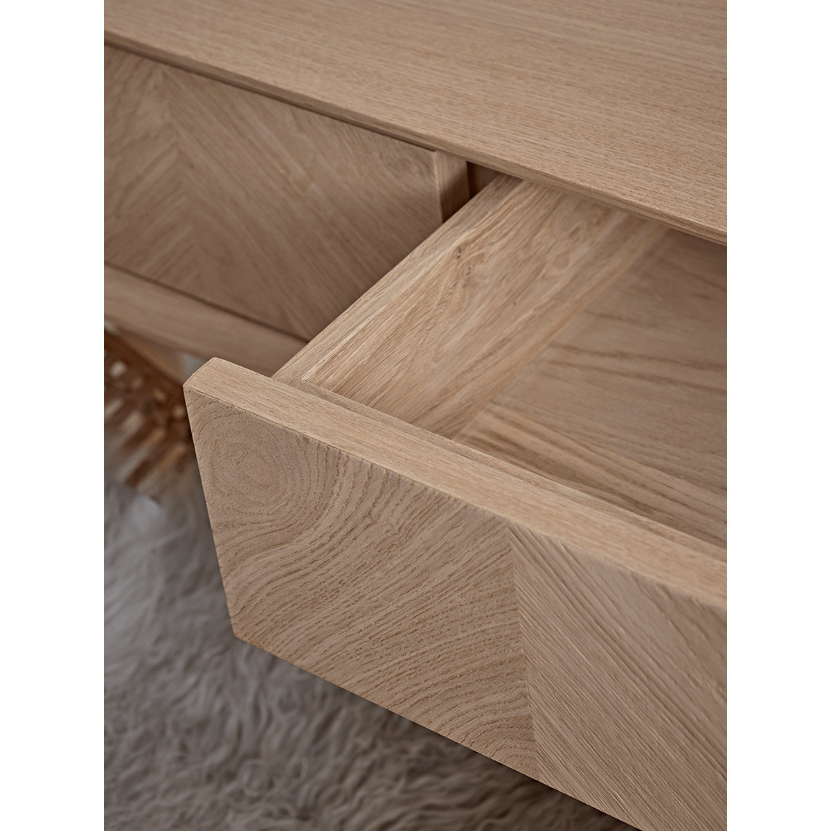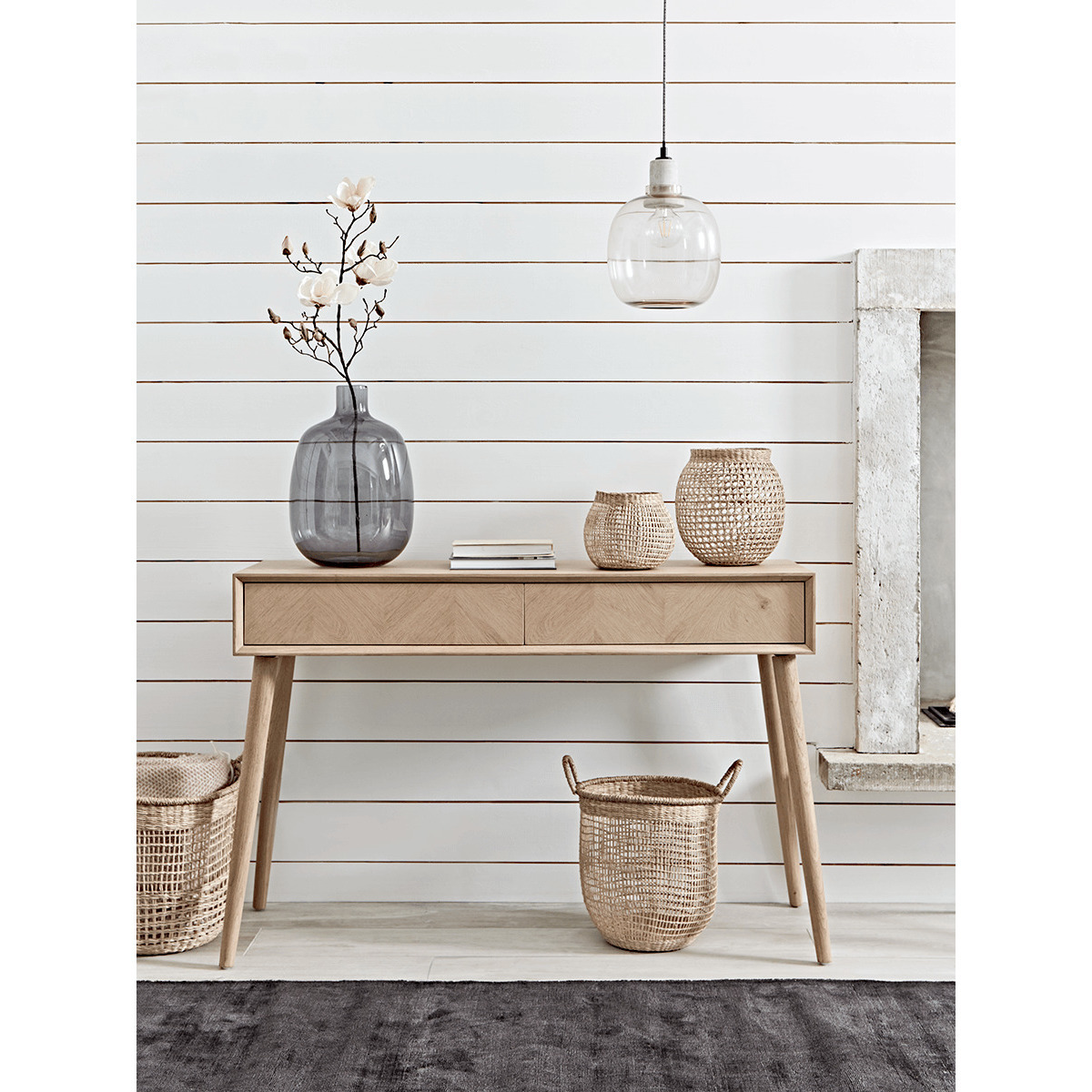 The perfect console table for a neutral or Scandi inspired interior, our stylish blonde oak table features four slender, tapered legs and a subtle chevron finish. Each piece has two handy hidden drawers for added storage, and pairs beautifully with other pieces from our Chevron Oak Furniture Collection.