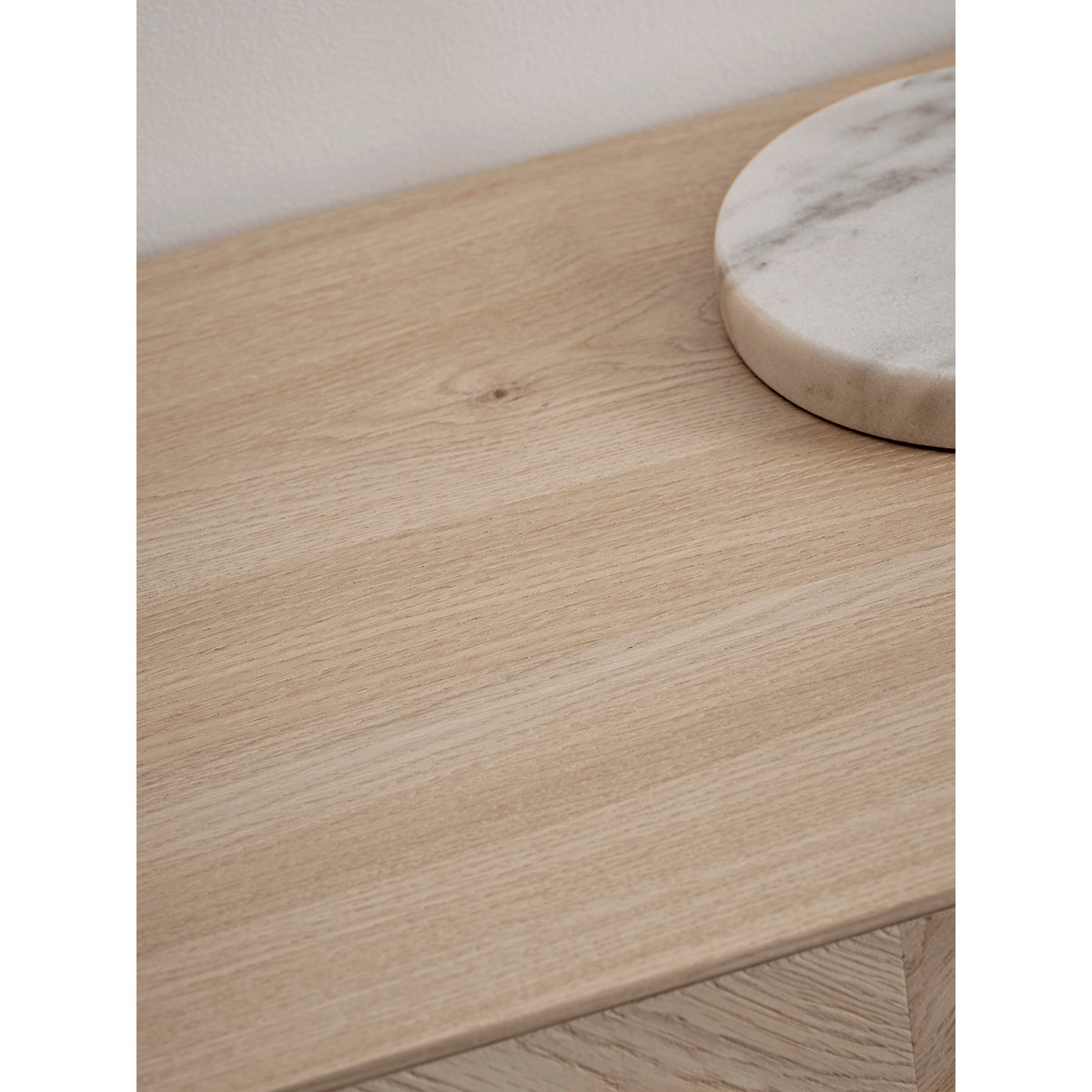 I love the Chevron Oak storage table for its versatile blend of modern lines and warm natural materials. Its clean, structured design makes it suitable for contemporary, Scandinavian, or even rustic interiors. It works particularly well in entryways, living rooms, or behind sofas, where it can serve both as a practical surface and a decorative element. When styling, consider layering minimalist accessories like vases, candles, or small stackable books to bring out its warm oak tone. To keep the look cohesive, incorporate other wood or neutral tones within the space, and avoid overcrowding the surface to maintain its sleek profile.