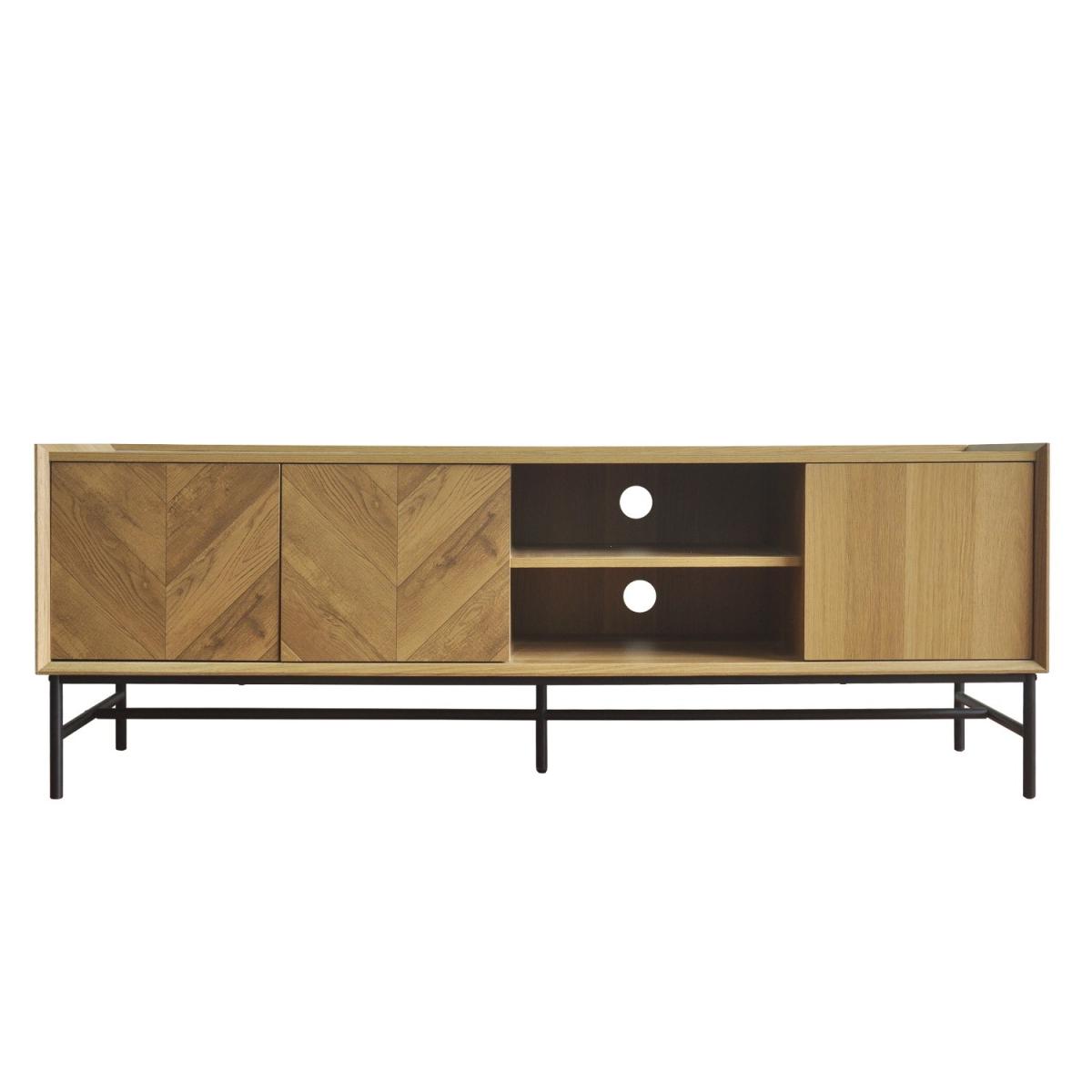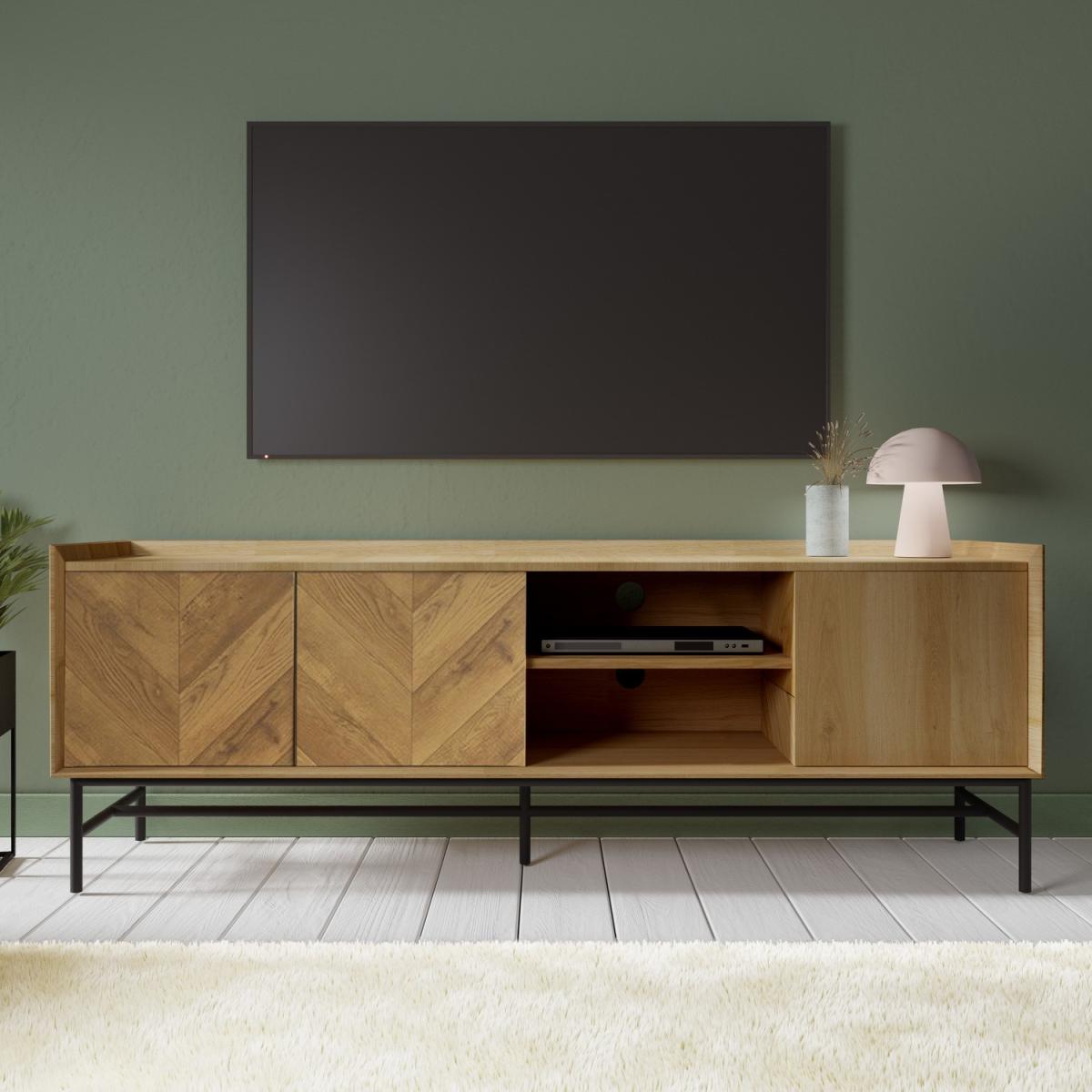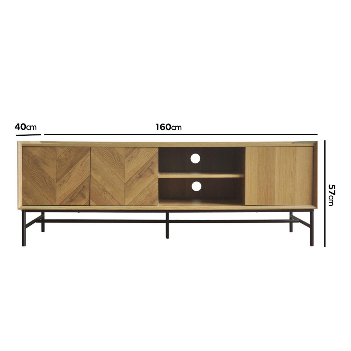 Features we love Sleek and functional TV unit finished in oak-effect Door fronts feature stunning chevron-pattern detailing. Both open and closed storage for organising essentials. Cable management holes are featured on both shelves. Black powder-coated metal frame completes the look. Matching items are available in the Telsa range Need to know. Dimensions. W160 x H55 x D40 cm Weight. 30kg Number of doors. 3 Colour. Natural oak and black Material. Oak foil MDF and metal Finish. Oak foil top and powder-coated legs Assembly required. Yes.
