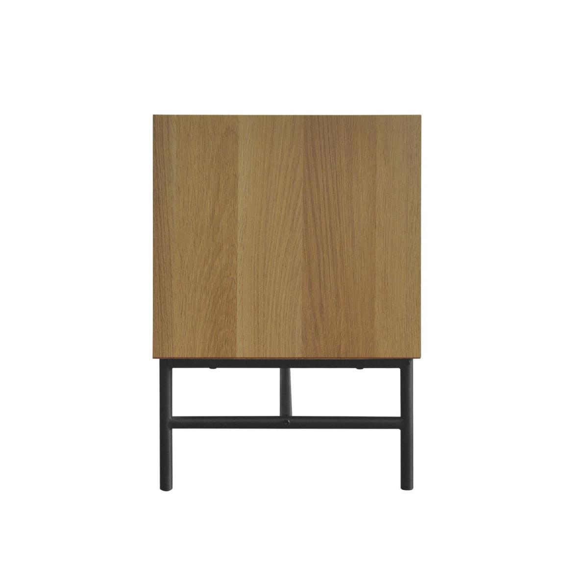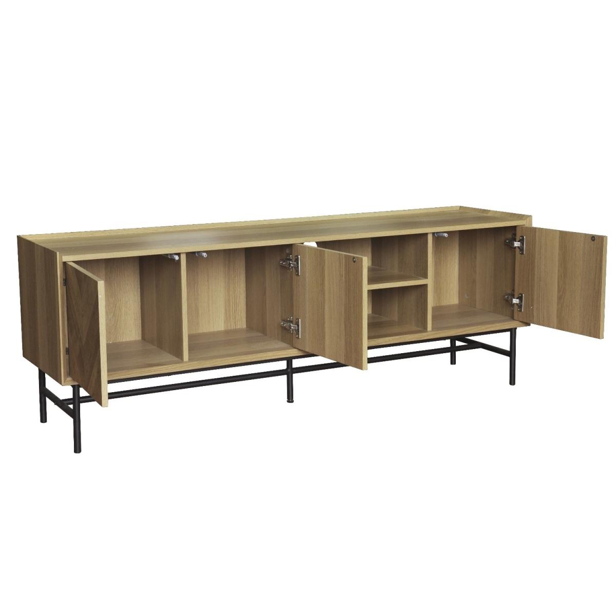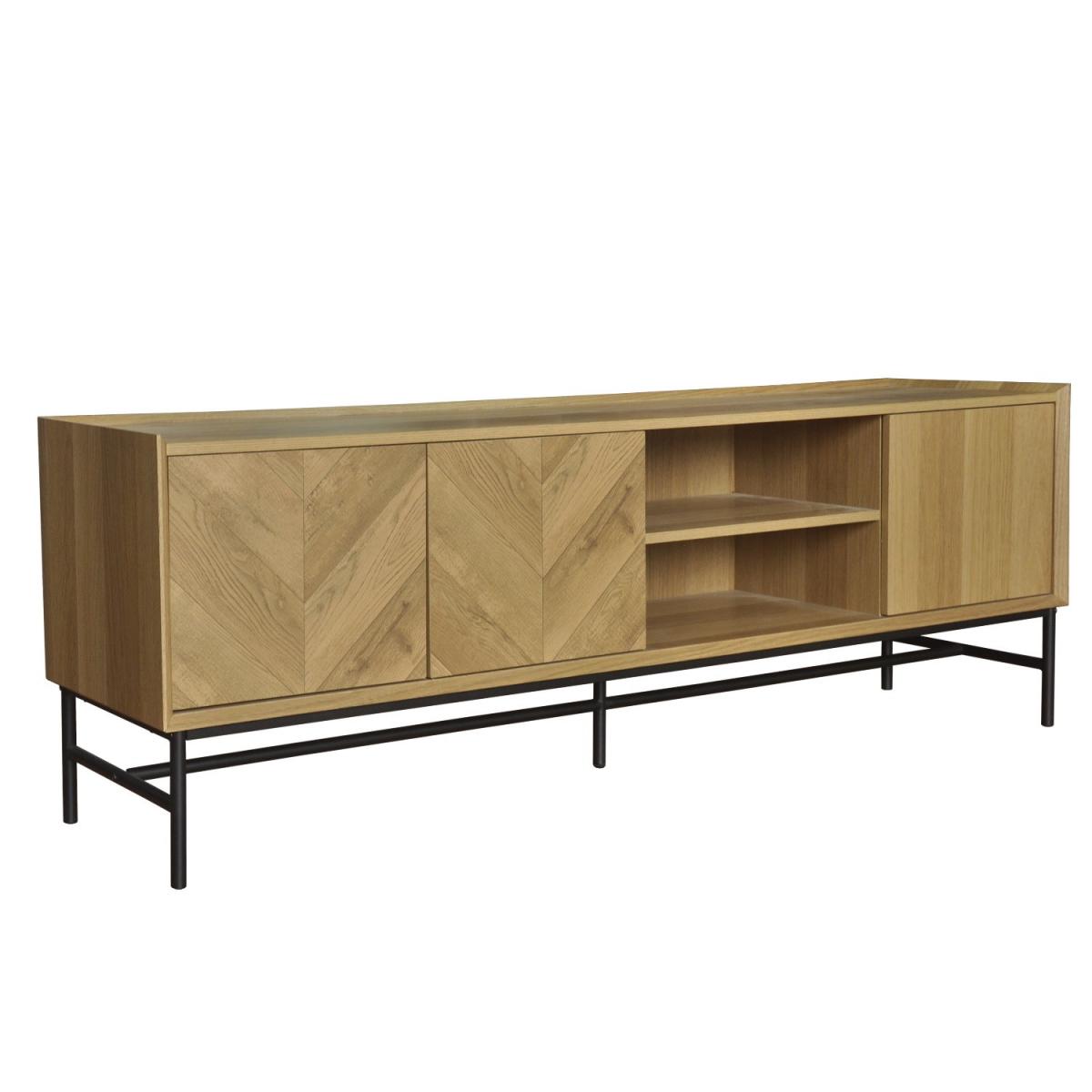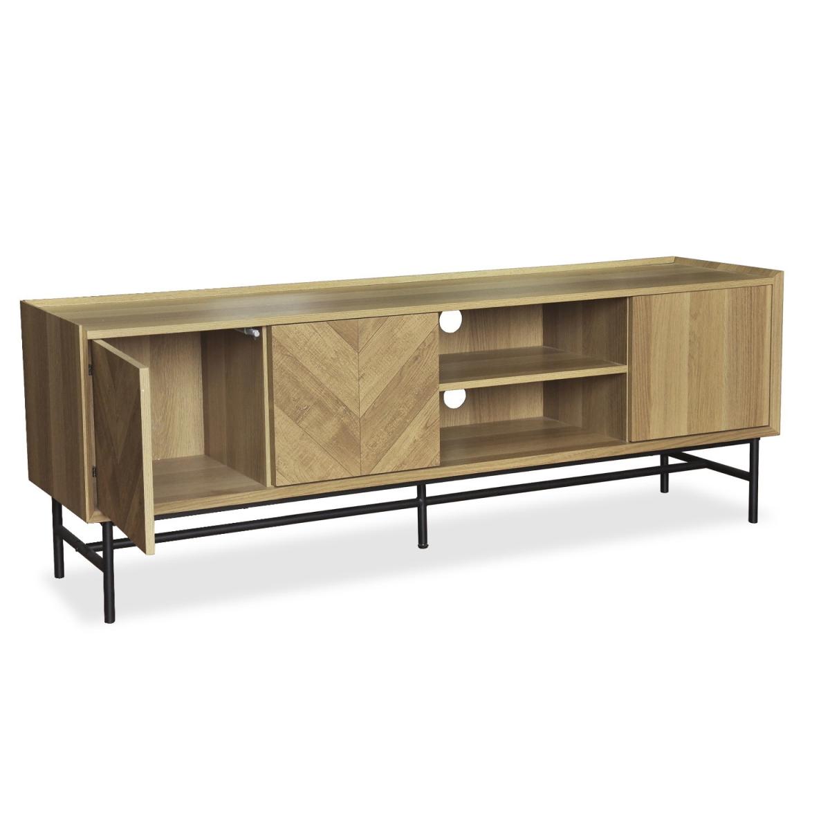 Features we love Sleek and functional TV unit finished in oak-effect Door fronts feature stunning chevron-pattern detailing. Both open and closed storage for organising essentials. Cable management holes are featured on both shelves. Black powder-coated metal frame completes the look. Matching items are available in the Telsa range Need to know. Dimensions. W160 x H55 x D40 cm Weight. 30kg Number of doors. 3 Colour. Natural oak and black Material. Oak foil MDF and metal Finish. Oak foil top and powder-coated legs Assembly required. Yes.