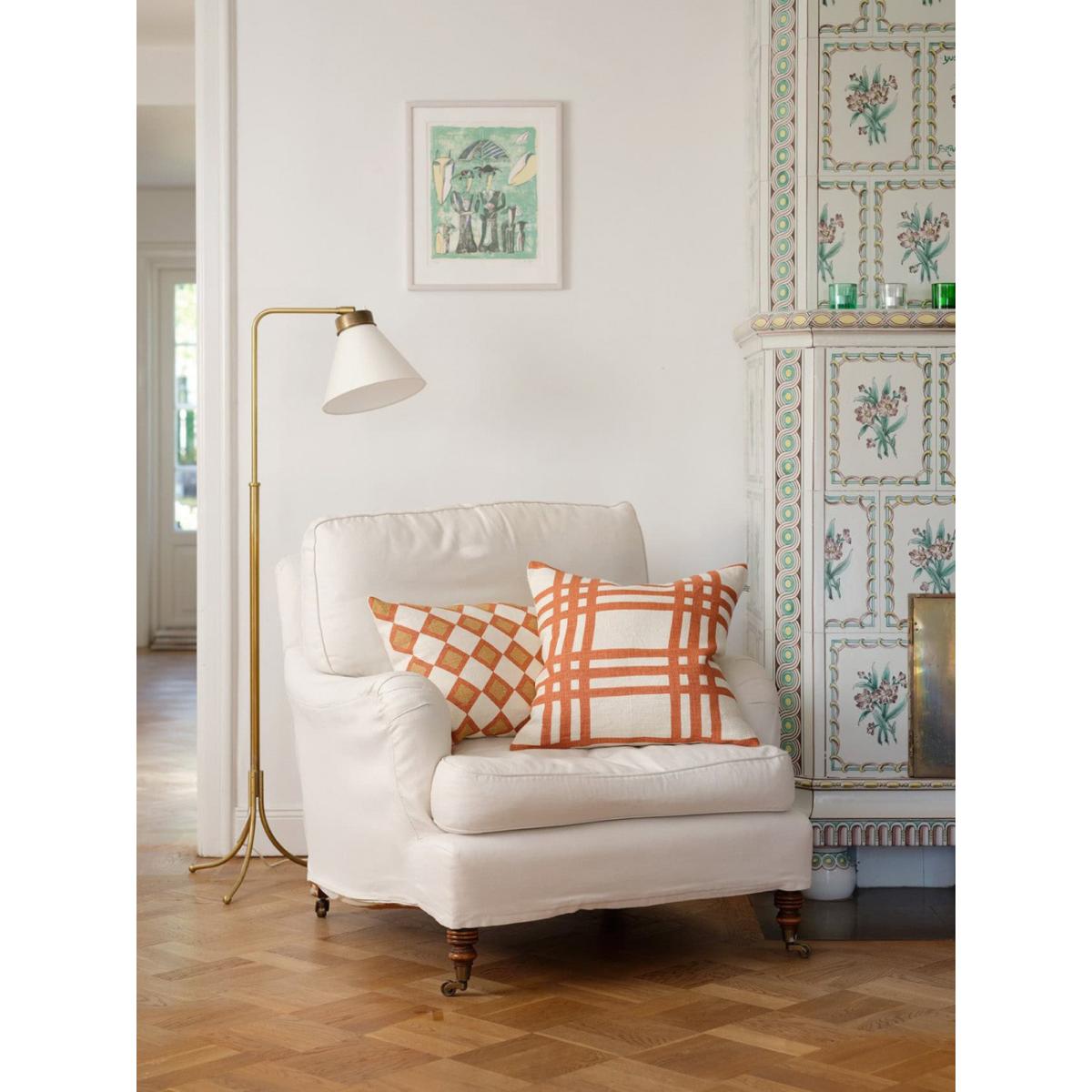 I love this cushion because of its vibrant apricot-orange hue and contemporary check pattern, which instantly lifts any space. It works particularly well in neutral or pared-back interiors, adding a pop of colour and visual interest without overwhelming the overall look. For styling, consider pairing it with muted sofas or chairs for contrast, or mix with other textured textiles to create a layered, inviting feel. It’s versatile enough to work in both modern and eclectic schemes, making it a great go-to for adding warmth and personality to living rooms or bedrooms. To keep it looking fresh, pair with understated accessories and ensure the cushion is positioned in a spot where its colour can truly shine.