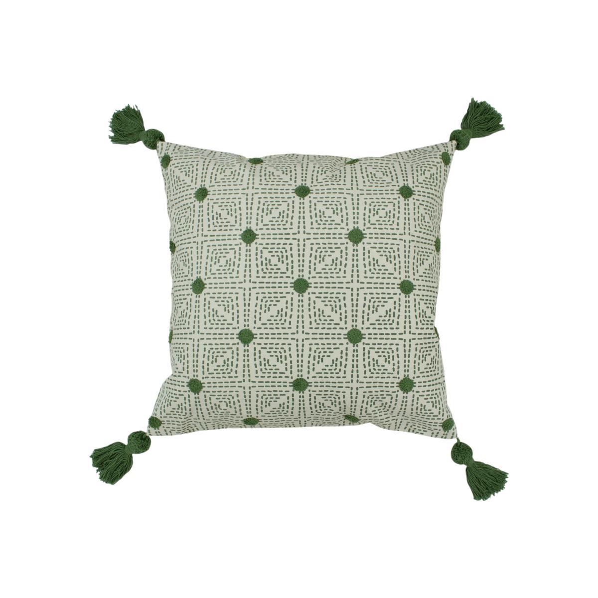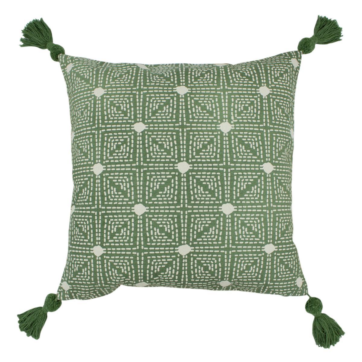 Crafted from 100% cotton for a beautiful texture, this stylish cushion features a geometric design, and is complete with pom-pom edging for a tactile finish. Available in a cool sage colourway, this cushion boasts a coloured pattern reverse and is designed with a removable cover for convenient upkeep.