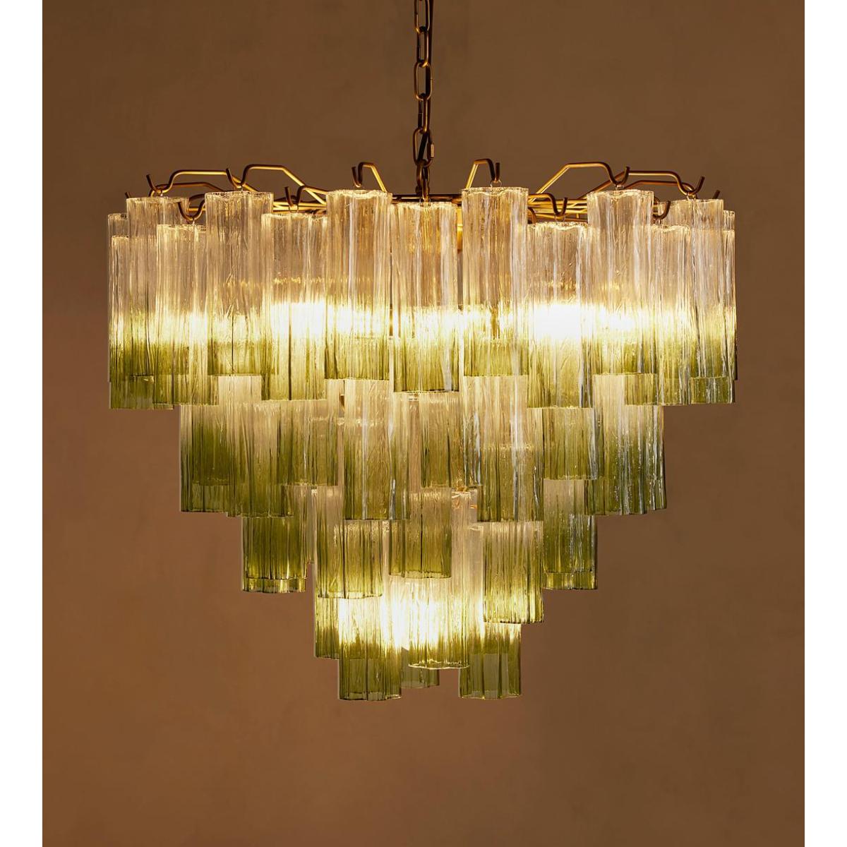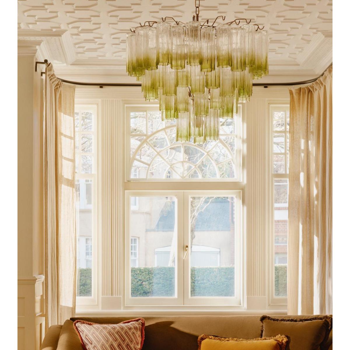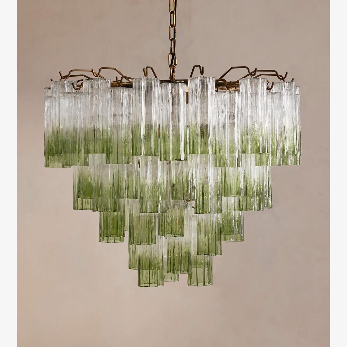 You will see multiples of our Chiara chandeliers hanging in DUMBO House. Each one features dozens of green ombre, scalloped glass tubular sections, which are mouth-blown and hand-finished by skilled artisans. These create a beautiful variation of tonal colours to bring depth, texture and opulence to any living space. Hang in an entryway or living room for elevated drama. Glass chandelier Mouth-blown using traditional artisanal techniques Scalloped, green ombre tubular glass sections Glass sections suspended from aged brass-finish metal frame Flex woven through decorative brass-finish chain Recommended bulb: 7 / E27 / 60W maximum As seen in DUMBO House