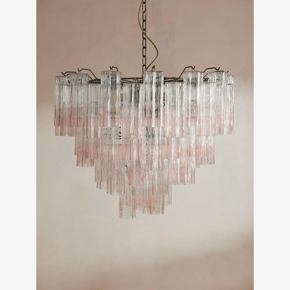 You will see multiples of our Chiara chandeliers hanging in DUMBO House. Each one features dozens of pink ombre, scalloped glass tubular sections, which are hand-finished by skilled artisans. These create a beautiful variation of tonal colours to bring depth, texture and opulence to any living space. Hang in an entryway or living room for elevated drama. Glass chandelier Hand-finished using traditional artisanal techniques Scalloped, pink ombre tubular glass sections Glass sections suspended from aged brass-finish metal frame Flex woven through decorative brass-finish chain As seen in DUMBO House