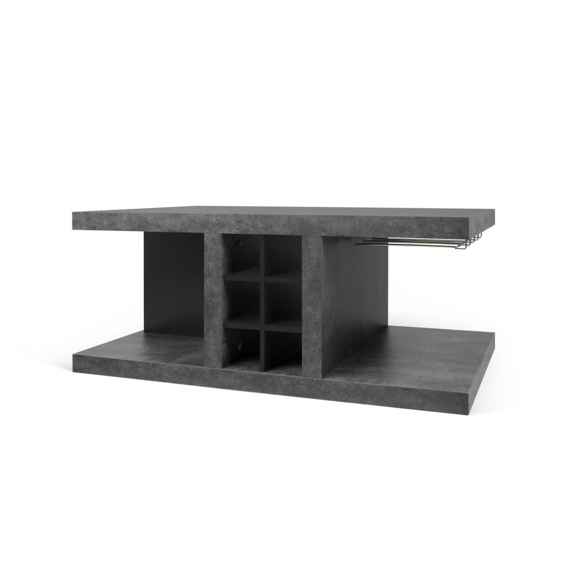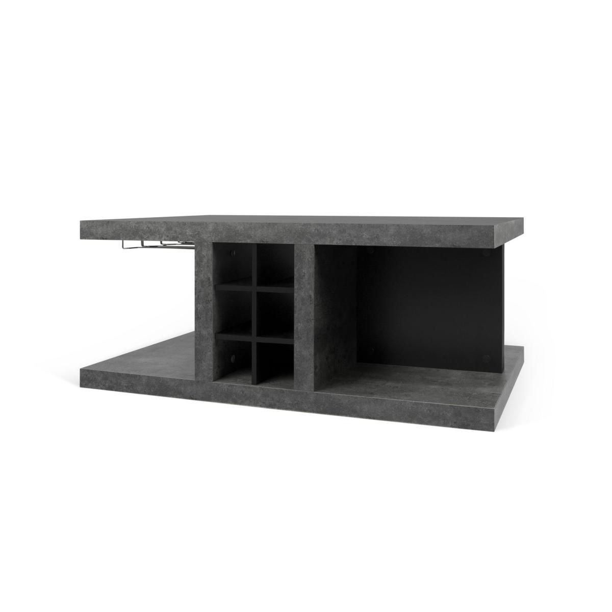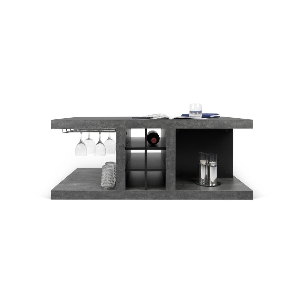An industrial style for this coffee table with an integrated bar with solid, destructured lines. It combines melamine with an ultra-realistic concrete effect with a lacquered black satin finish. Under the tabletop is a vast storage space which includes a rack for your wine bottles and favourite alcohols (space for 6 bottles) as well as a rail system for hanging stemmed glasses. A coffee table and a bar all in one, Chicago is a central piece of furniture, with everything else surrounding it: it invites sharing, laughing and enjoying great drinks together. This multifunctional coffee table enables friends to be brought together around a glass of wine (or whatever drink you prefer!) and to make sure everything is set for the occasion without leaving the comfort of your sofa. This coffee table is composed of high-density particle and fibre panels made from recycled wood. Delivered as a DIY kit to facilitate transport and reduce its carbon footprint (easy to assemble, instructions included).