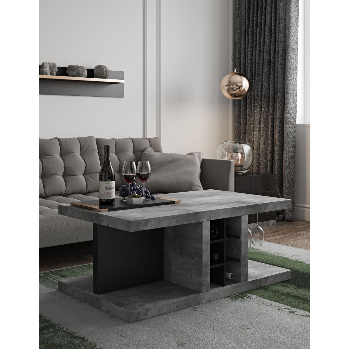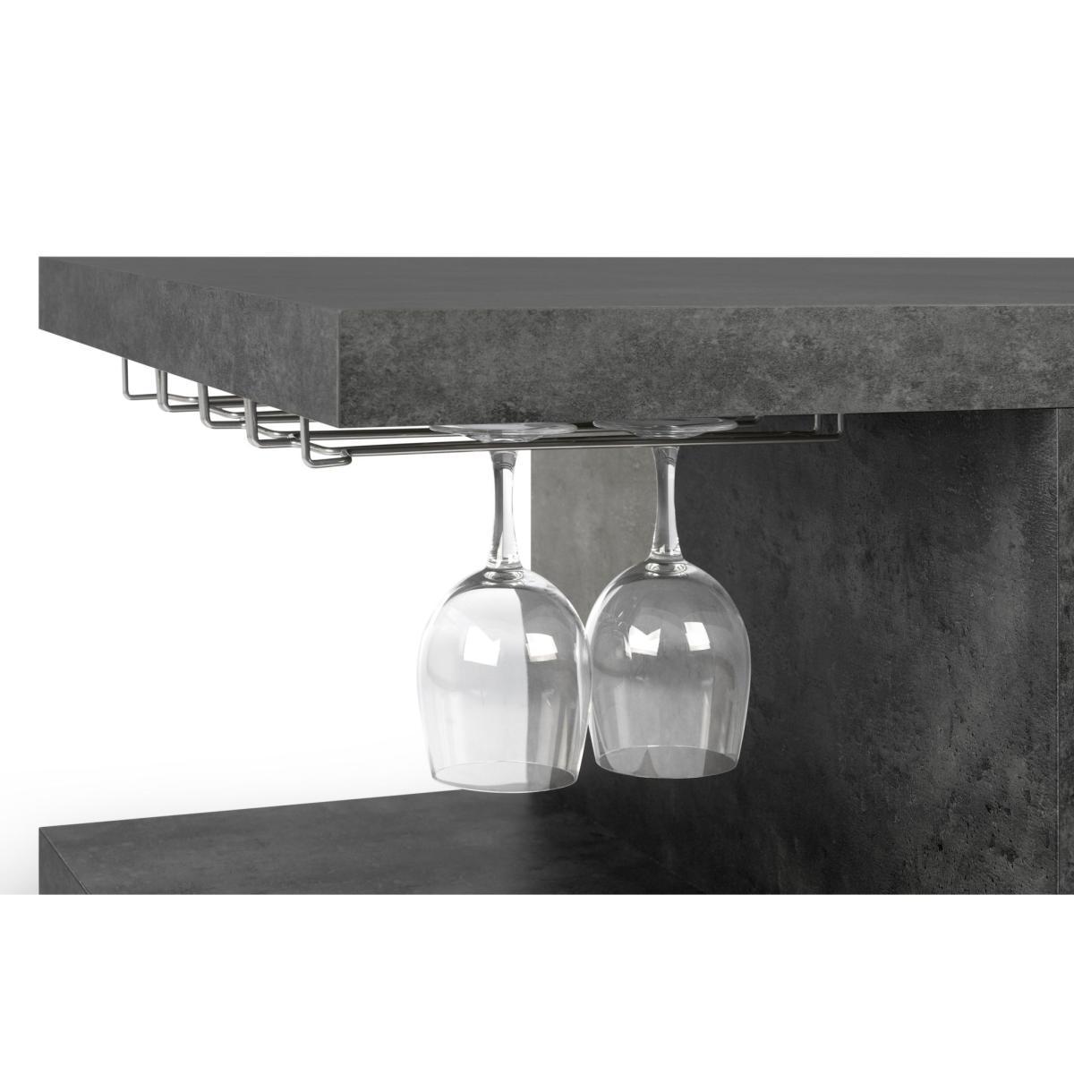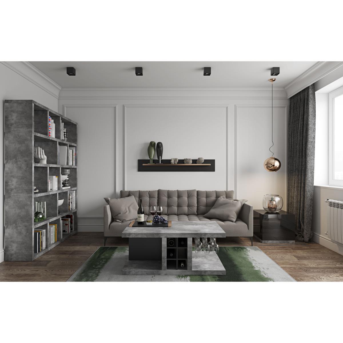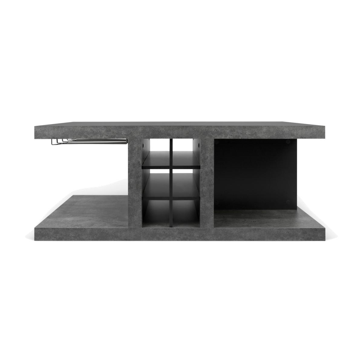 An industrial style for this coffee table with an integrated bar with solid, destructured lines. It combines melamine with an ultra-realistic concrete effect with a lacquered black satin finish. Under the tabletop is a vast storage space which includes a rack for your wine bottles and favourite alcohols (space for 6 bottles) as well as a rail system for hanging stemmed glasses. A coffee table and a bar all in one, Chicago is a central piece of furniture, with everything else surrounding it: it invites sharing, laughing and enjoying great drinks together. This multifunctional coffee table enables friends to be brought together around a glass of wine (or whatever drink you prefer!) and to make sure everything is set for the occasion without leaving the comfort of your sofa. This coffee table is composed of high-density particle and fibre panels made from recycled wood. Delivered as a DIY kit to facilitate transport and reduce its carbon footprint (easy to assemble, instructions included).