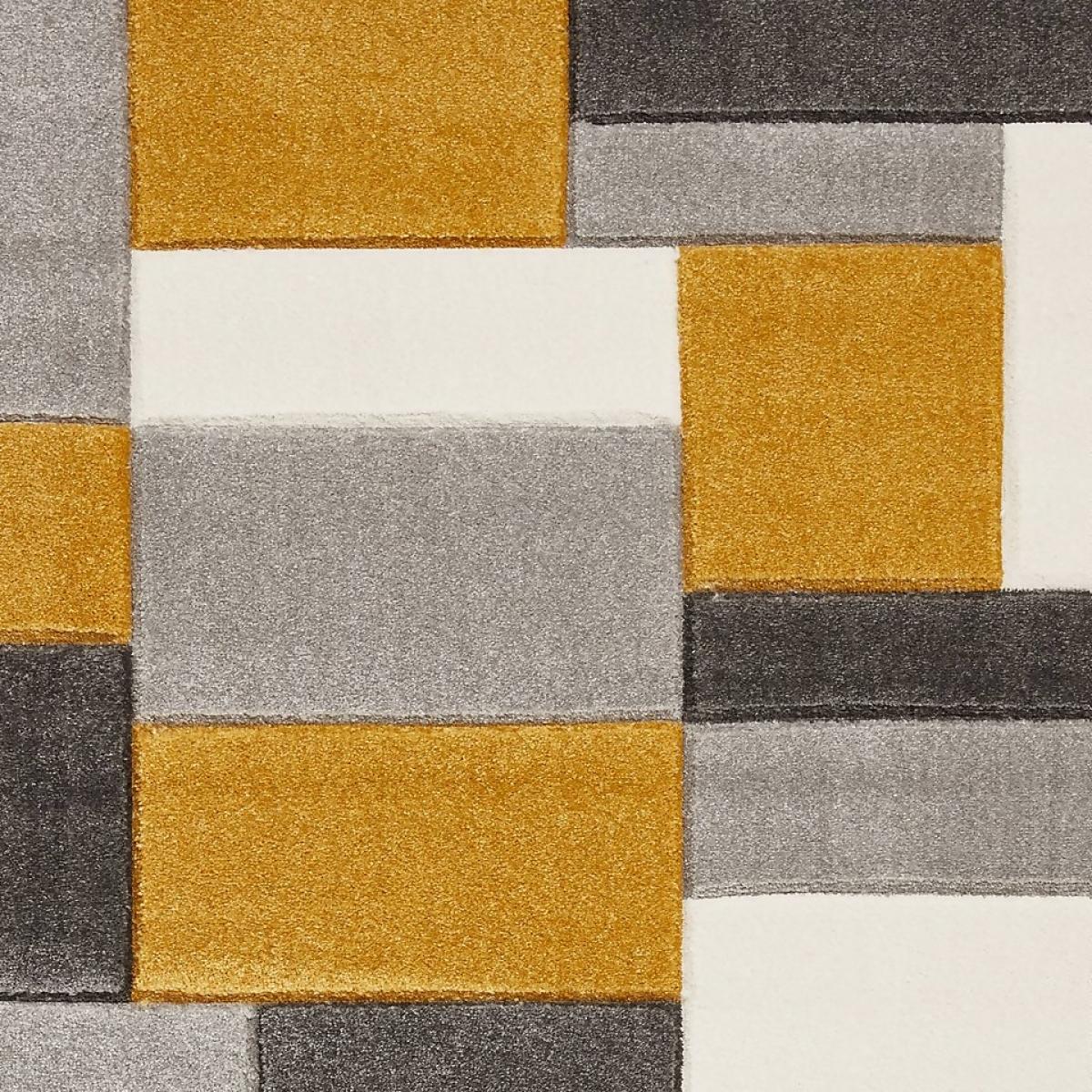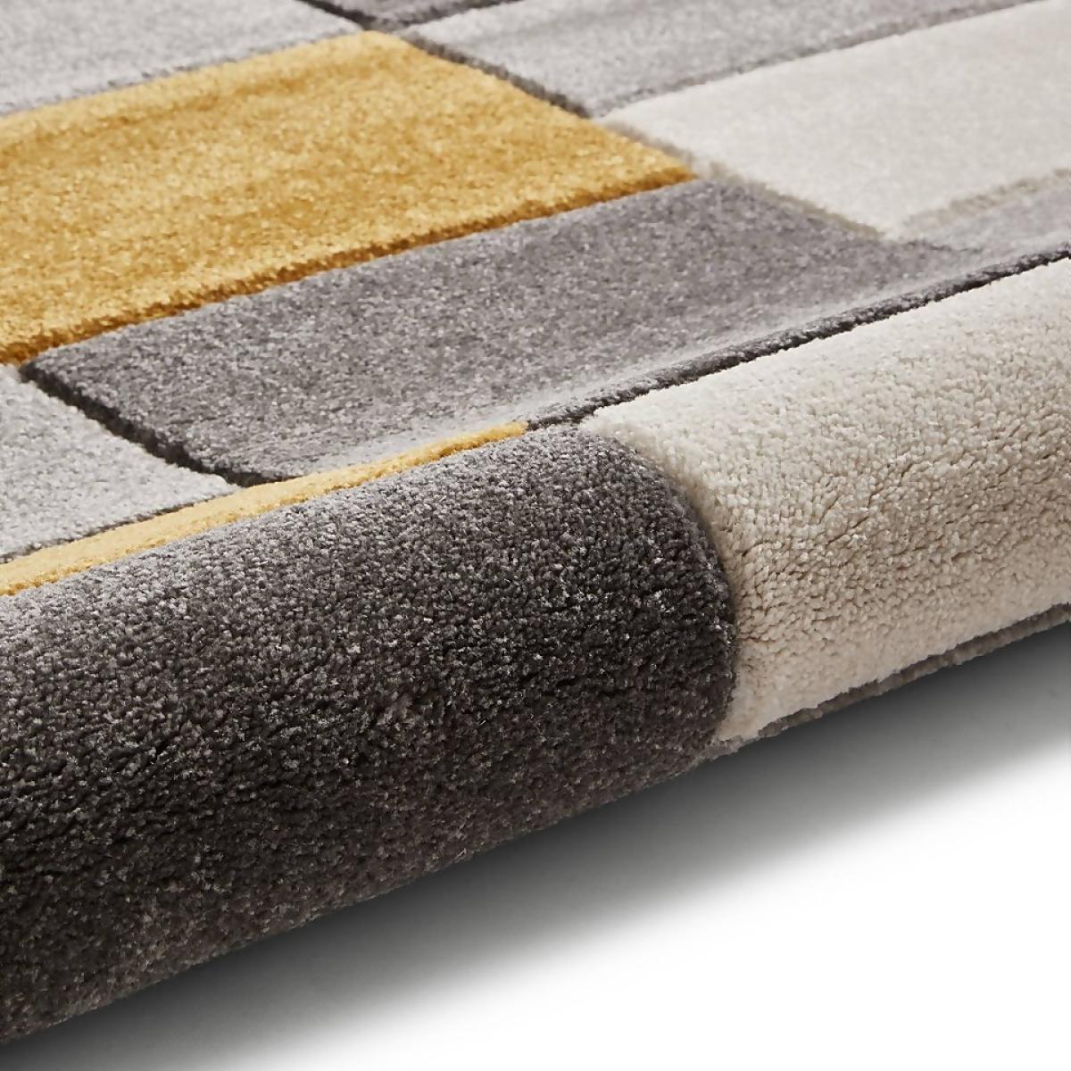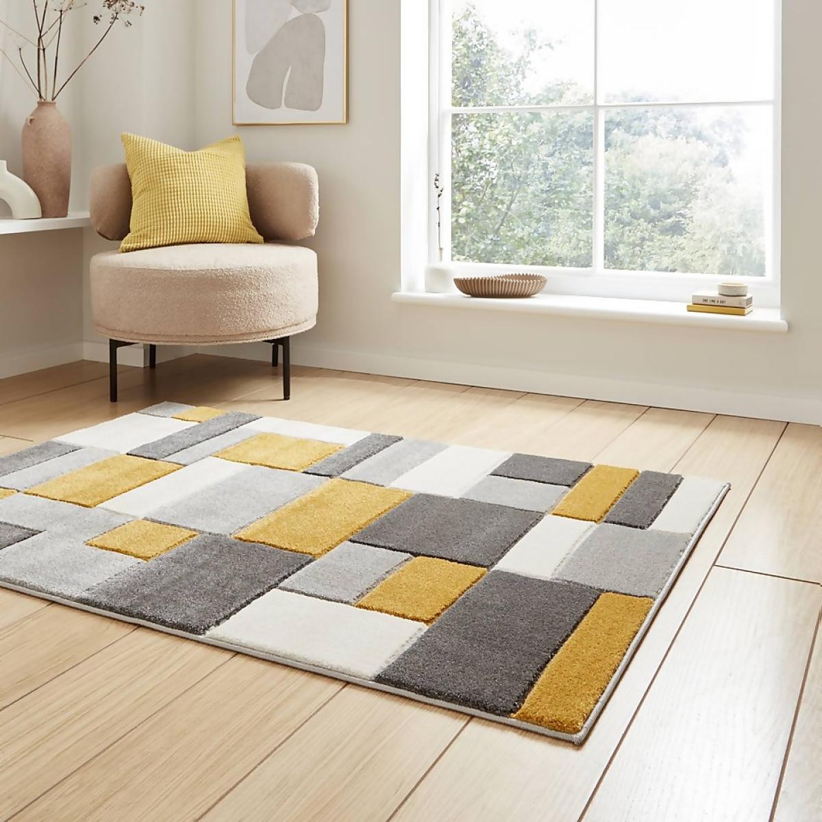 The Chicago Carved Geometric Rug, an eye-catching addition to any modern living room. With its unique geometric pattern and stylish blend of grey and yellow tones, this rug is the perfect way to add a touch of contemporary flair to your home decor.