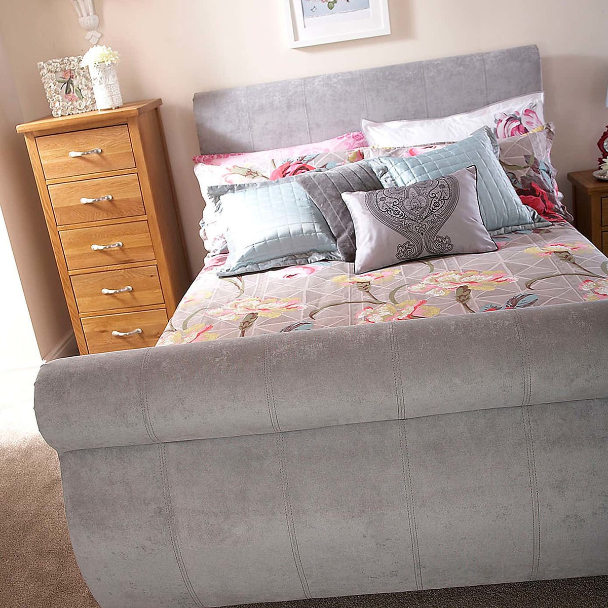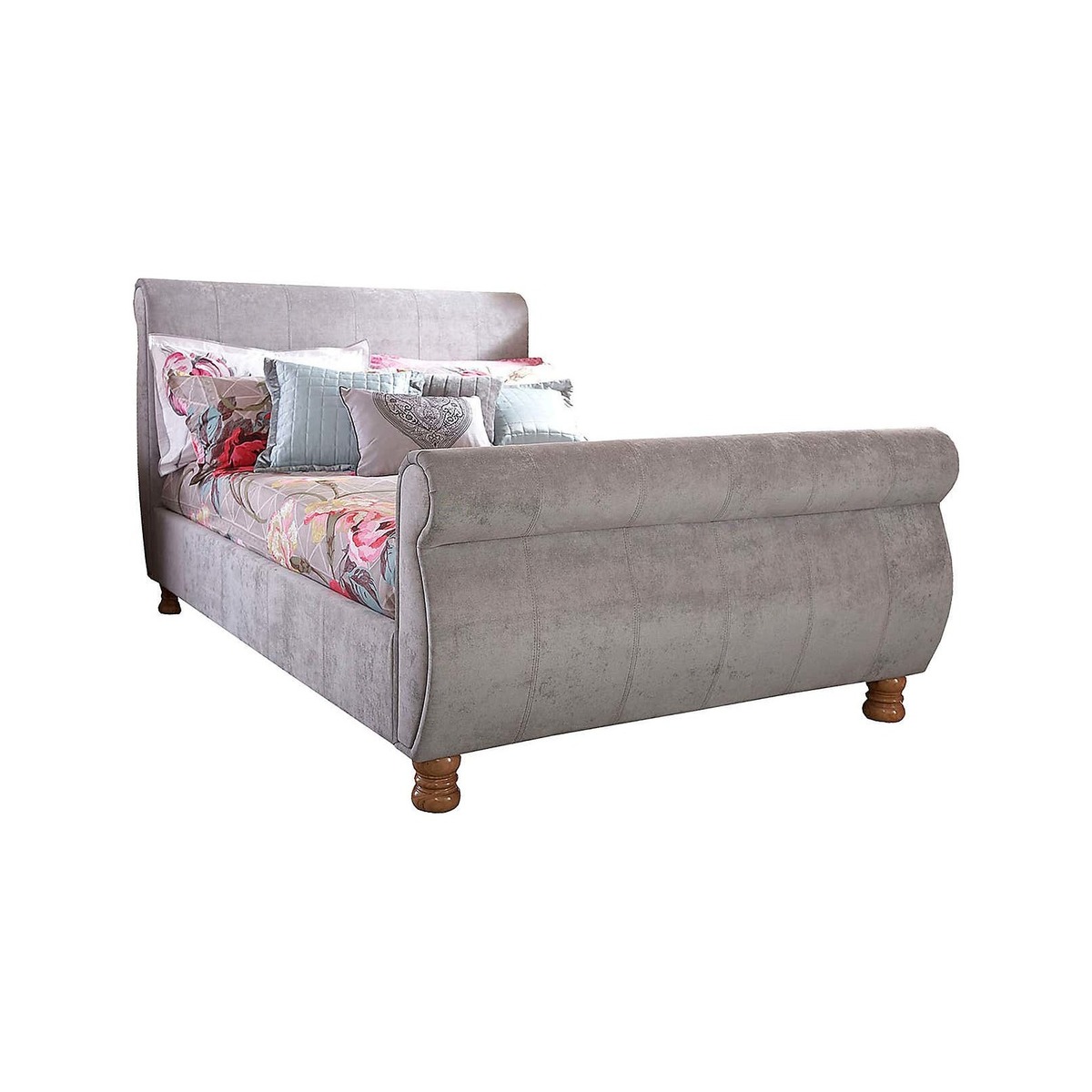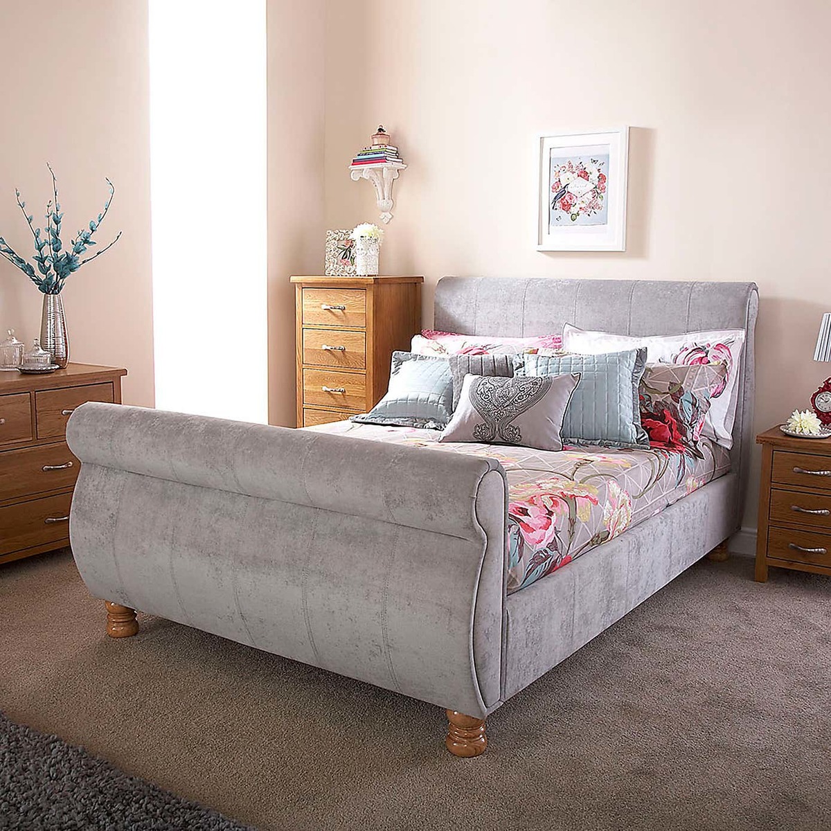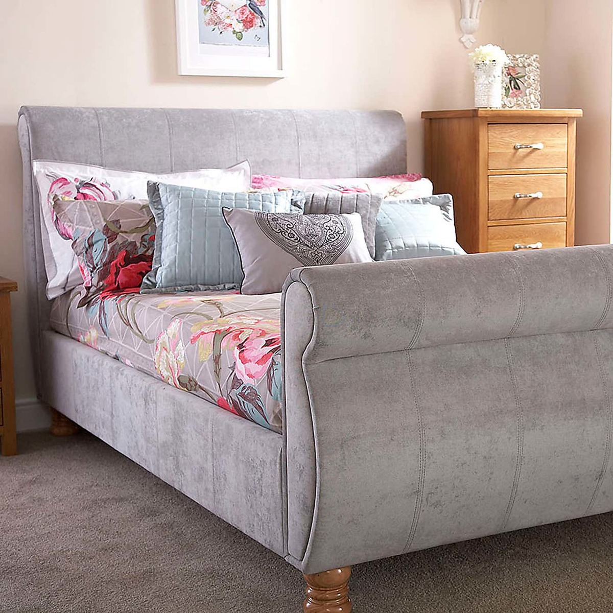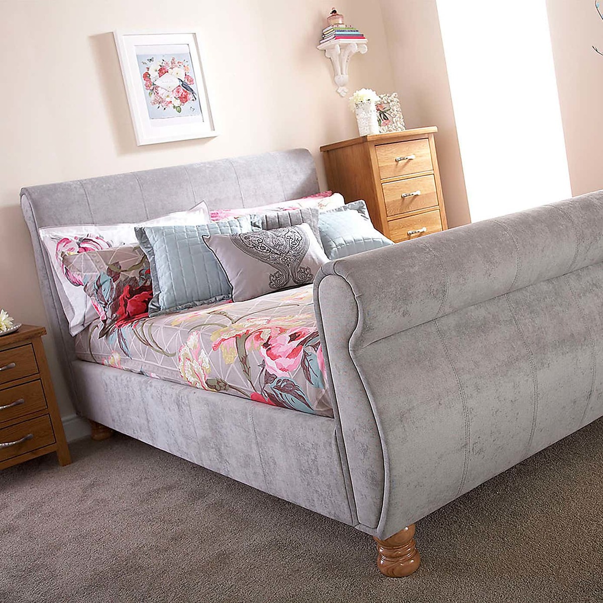 Upholstered in a luxurious chenille fabric, this striking bed features a sleigh design that will be a focal point in any bedroom. Finished in silver, this self-assembly bedstead is French-inspired and is finished in a shimmering silver colorway. Complete with complementing, solid wood feet, this glamorous bedstead is available in a choice of sizes. Please note, unfortunately we cannot deliver this item to the Channel Islands.