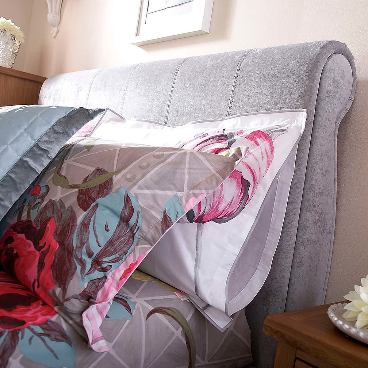 I really like this bed for its classic sleigh shape and luxurious silver upholstery, which adds a sophisticated touch to any bedroom. It works particularly well in both contemporary and traditional interiors, especially when paired with soft greys, muted pastels, or even bold accent colours for contrast. To style it effectively, consider layering with textured bedding and a few decorative cushions for added comfort and visual interest. Keeping the surrounding decor subtle allows the bed’s elegant silhouette and fabric to stand out. This piece is versatile enough to complement a range of colour schemes and styles, from understated minimalism to more opulent settings.