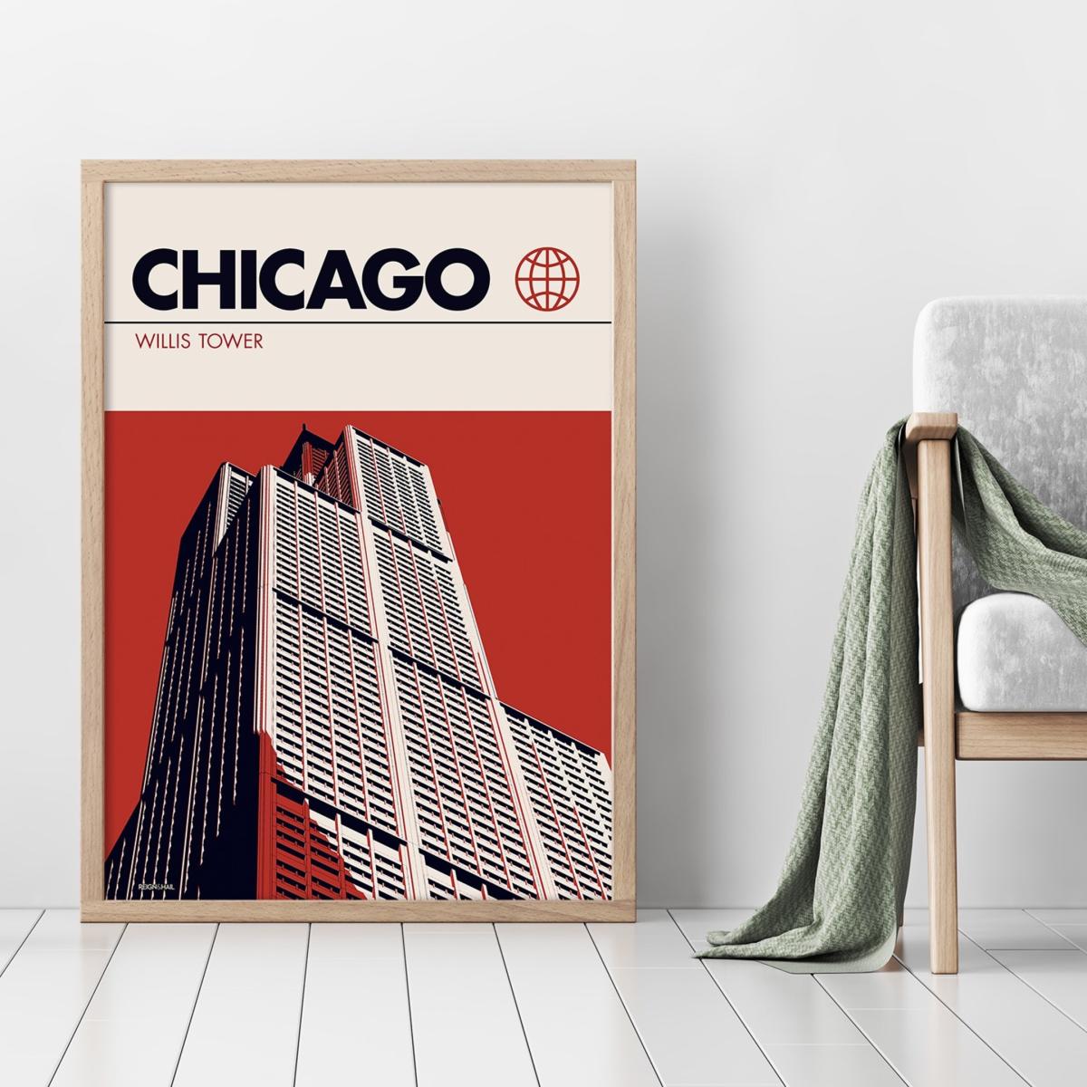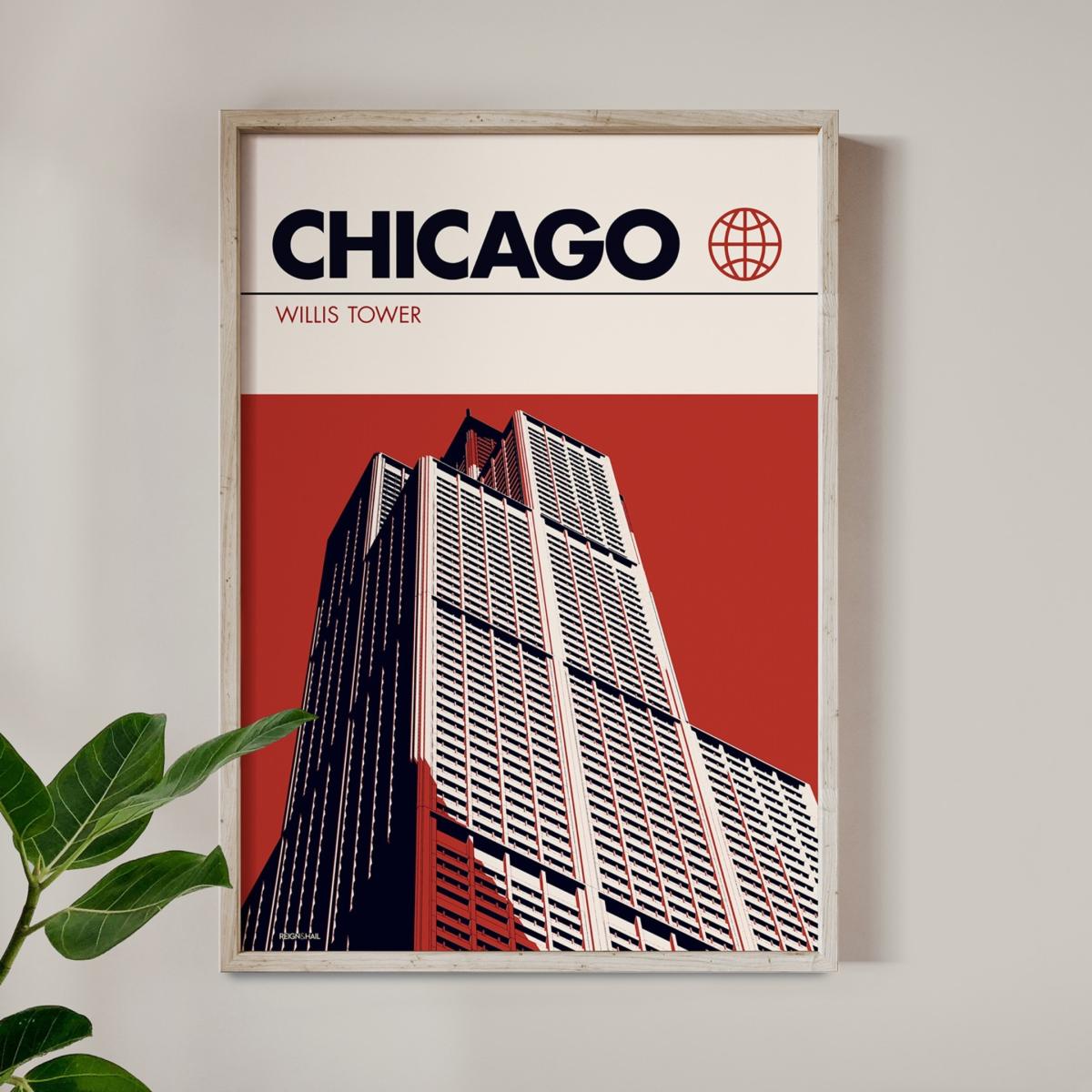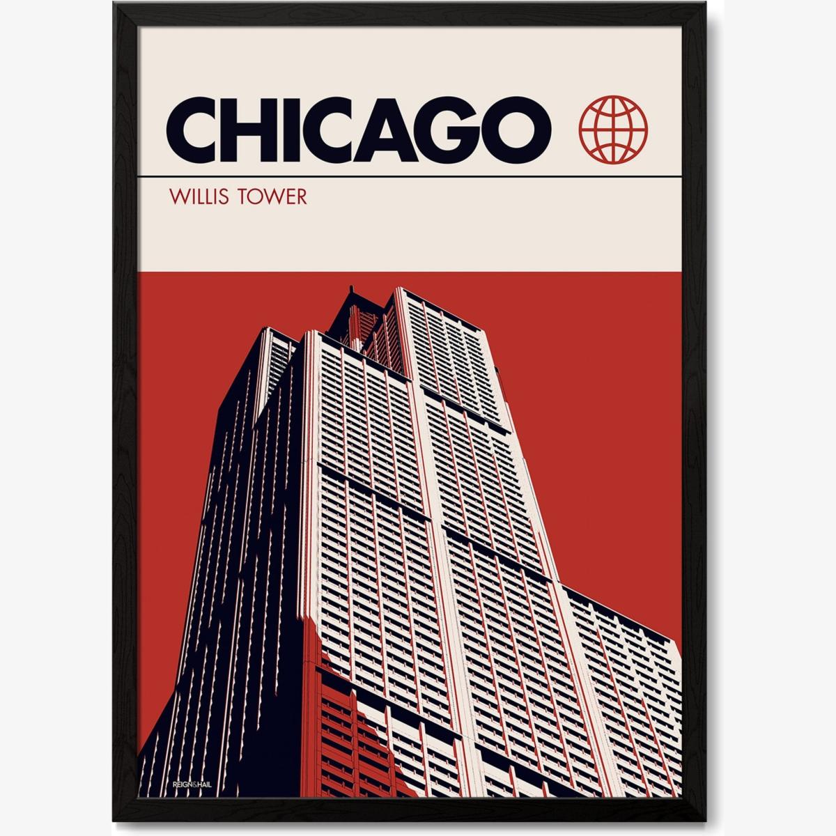 Chicago Willis Tower Modernist Architectural Travel Poster A2 420 X 594Mm Reign & Hail