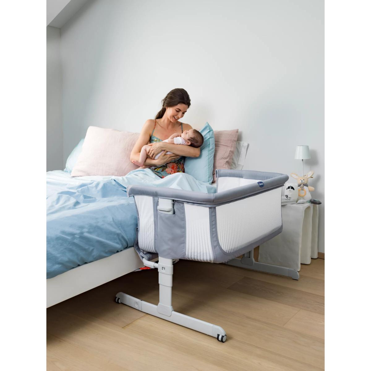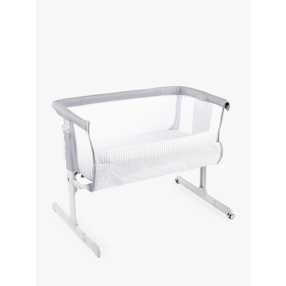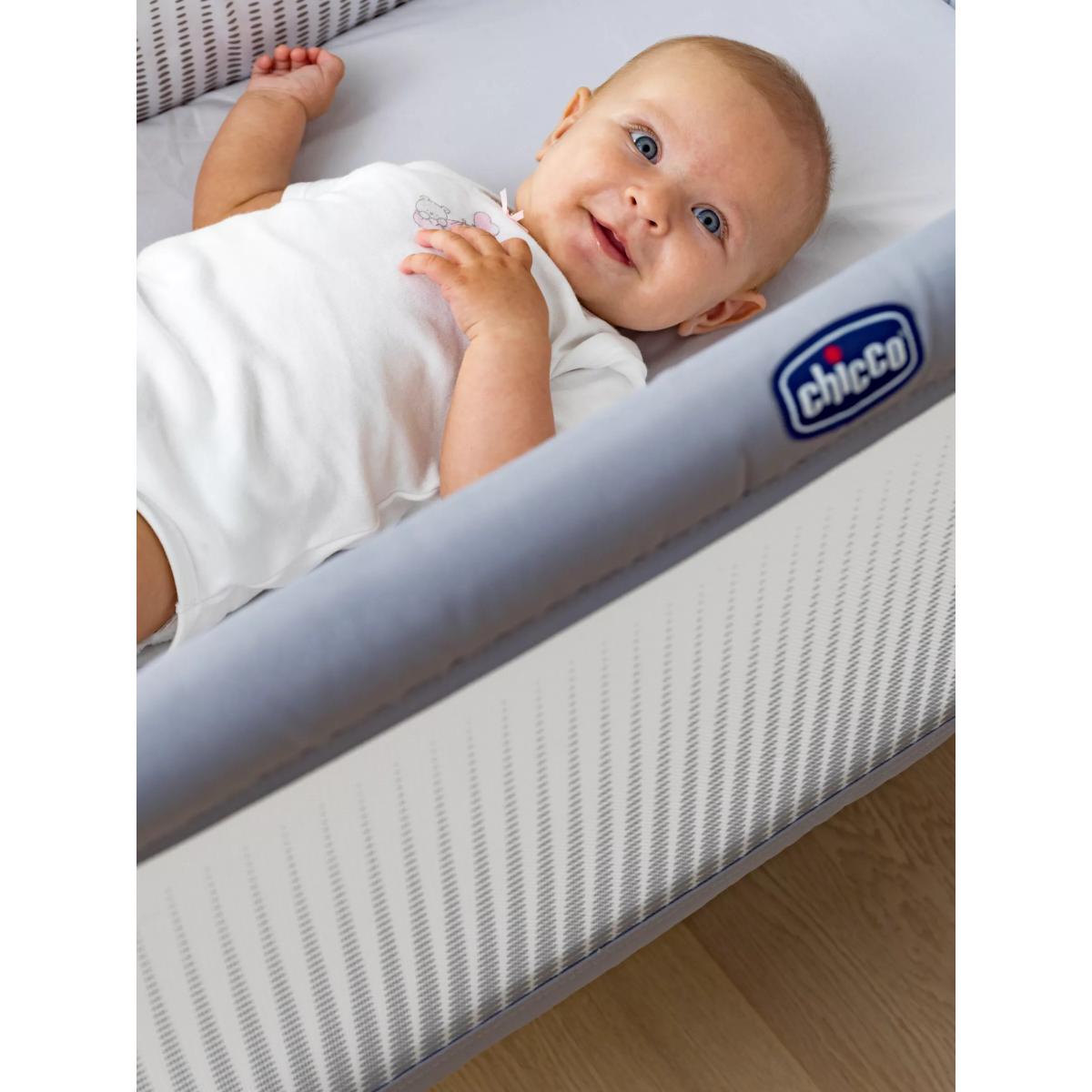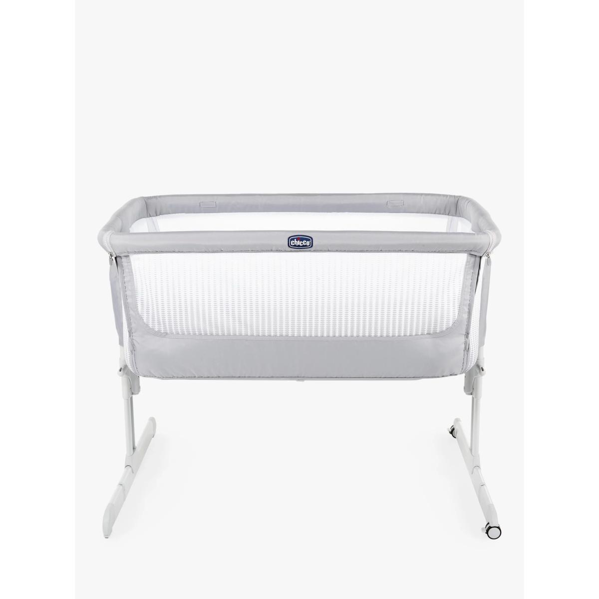 The Chicco Next2. Me Air is designed to allow your baby to sleep safely next to you without sharing the same bed. A 3 in 1 solution, it adapts to your needs as a side-sleeping crib for safe co-sleeping, a stand-alone crib in your nursery or as travel crib thanks to the travel bag included. With its wider netted sides to improve airflow around the crib, and enhanced visibility into the crib, you can rest assured that baby is comfortable, and can check up on baby from the comfort of your bed without disturbing their sleep. Designed with a rounded, cocooning shape to create a cosy sleeping environment for your baby, it has a special safety harness that attaches to your bed frame to securely hold the crib in position for baby's safety. Adjusting to 6 different height levels to easily adapt to any bed, it can also be used in a tilting mode to help support with reflux and congestion. Key Features: Suitable from birth to 6 months Tilt mode to help with congestion and reflux 6 adjustable height levels Soft mattress included with removable and washable lining Padded sides for extra comfort 2 wheels with brakes for easy manoeuvring around the home