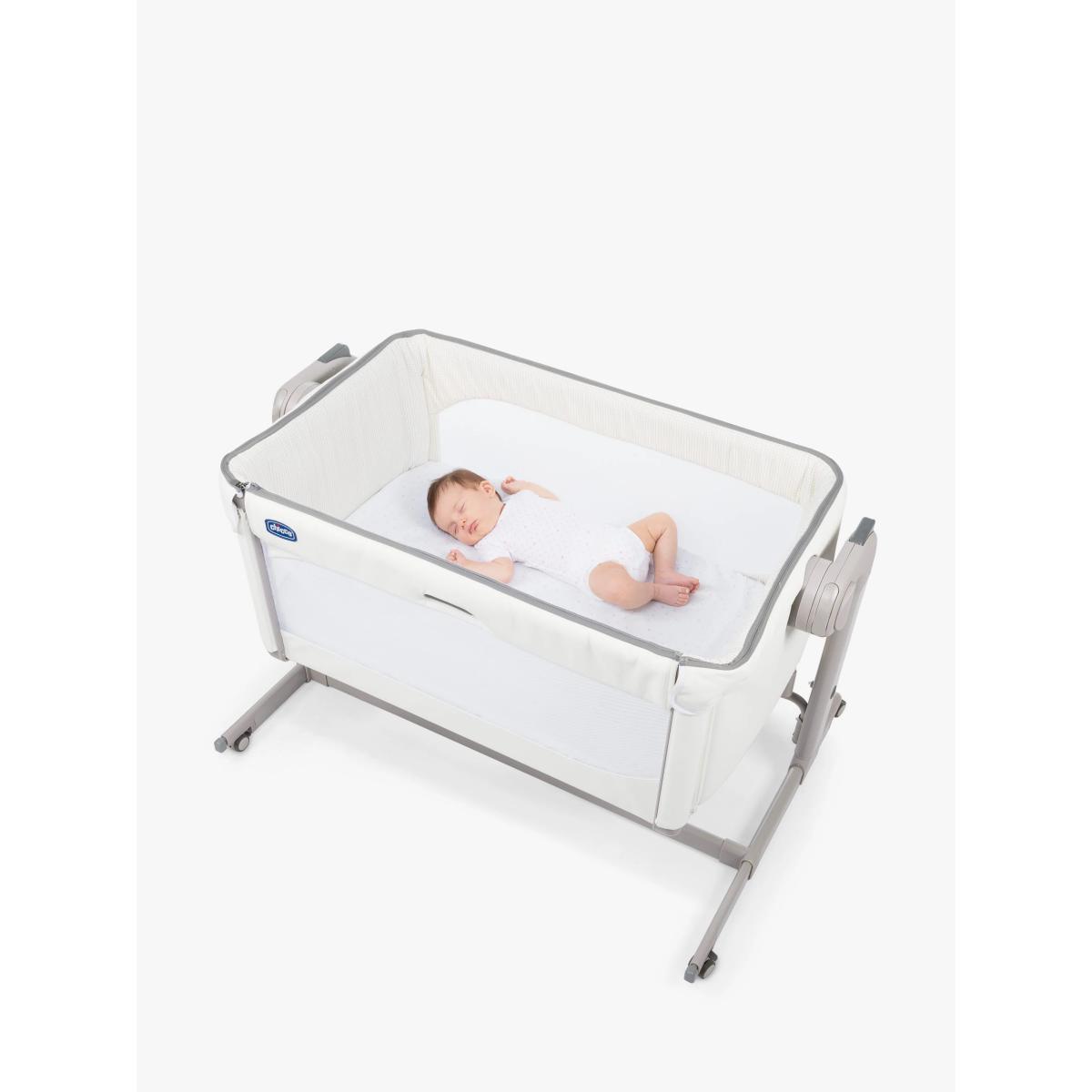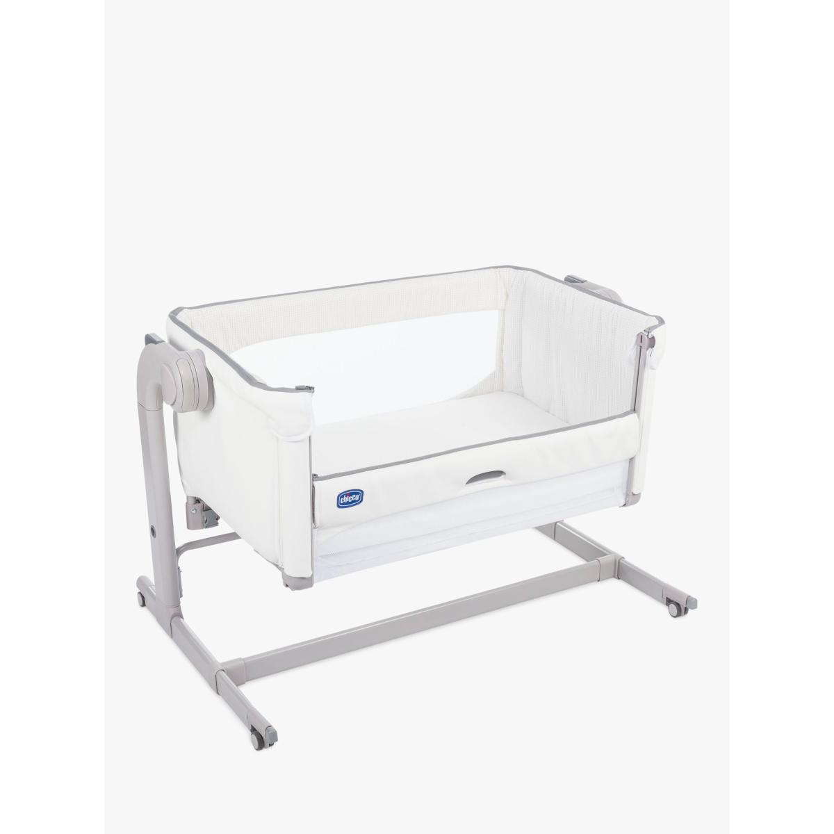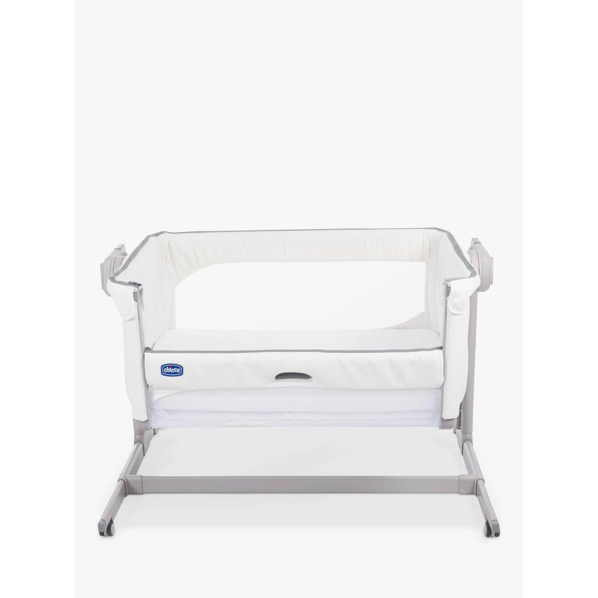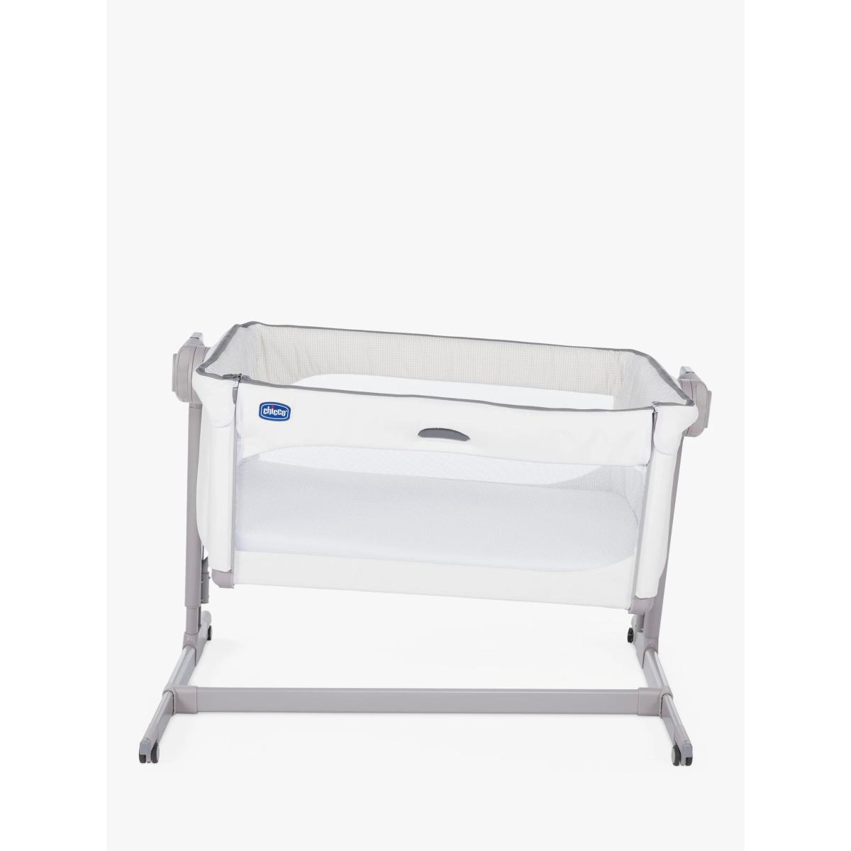 The award-winning Chicco Next2. Me Magic crib allows you to sleep next to your baby without being in the same bed. Your baby can safely sleep in the crib next to you, allowing you to respond quickly, whether for feeding, changing or night time snuggles. Boasting a one-handed sliding side panel for easy access to little one, and a rocking mode when in stand-alone sleeping mode, soothe baby back to sleep in no time. Easily attaching to most types of adult beds using the safety straps provided to enable safe side-sleeping, it has eleven height settings and clever telescopic feet so that you can also use it with beds with drawers or on divan base beds. Tilting by up to four levels to help baby's digestion, improve breathing and reduce reflux, Next2. Me Magic has two large mesh windows and a 3D mesh mattress cover to improve airflow throughout the crib. Built with four wheels to move around the house if needed, it also comes with a travel bag for easy transportation and storage. What's included: Chicco Next2. Me Magic Mattress Safety harness kit Travel bag Please note: The height of the parents' mattress must be higher than or the same as that of the side of the crib. If this is not the case, use the adjustment system to achieve this condition on both sides.