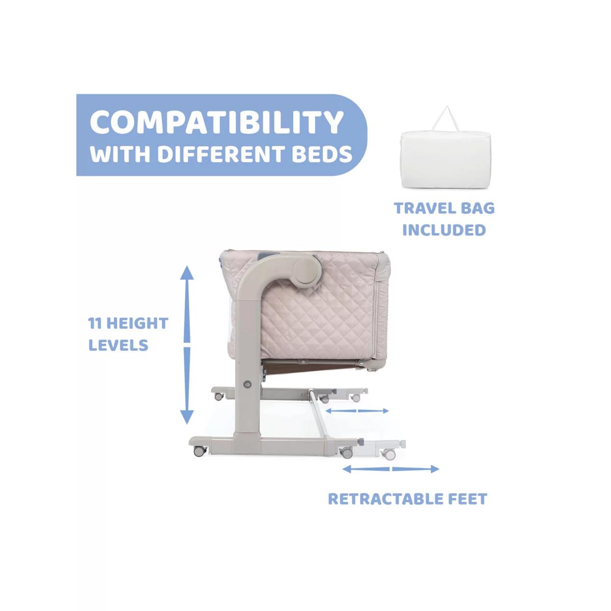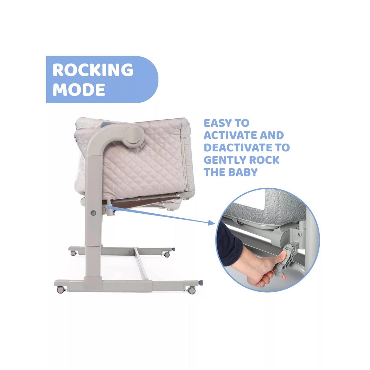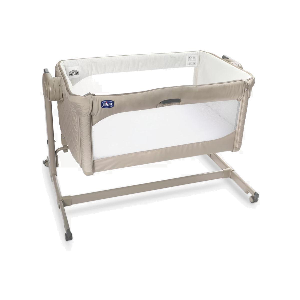 The award-winning Chicco Next2. Me Magic crib allows you to sleep next to your baby without being in the same bed. Your baby can safely sleep in the crib next to you, allowing you to respond quickly, whether for feeding, changing or night time snuggles. Boasting a one-handed sliding side panel for easy access to little one, and a rocking mode when in stand-alone sleeping mode, soothe baby back to sleep in no time. Easily attaching to most types of adult beds using the safety straps provided to enable safe side-sleeping, it has eleven height settings and clever telescopic feet so that you can also use it with beds with drawers or on divan base beds. Tilting by up to four levels to help baby's digestion, improve breathing and reduce reflux, Next2. Me Magic has two large mesh windows and a 3D mesh mattress cover to improve airflow throughout the crib. The internal padded material can easily be removed to be cleaned without the need to remove the rest of the crib fabrics by un-zipping the zip located around the top of the crib structure. Built with four wheels to move around the house if needed, it also comes with a travel bag for easy transportation and storage. What's included: Chicco Next2. Me Magic Mattress Safety harness kit Travel bag Please note: The height of the parents' mattress must be higher than or the same as that of the side of the crib. If this is not the case, use the adjustment system to achieve this condition on both sides.
