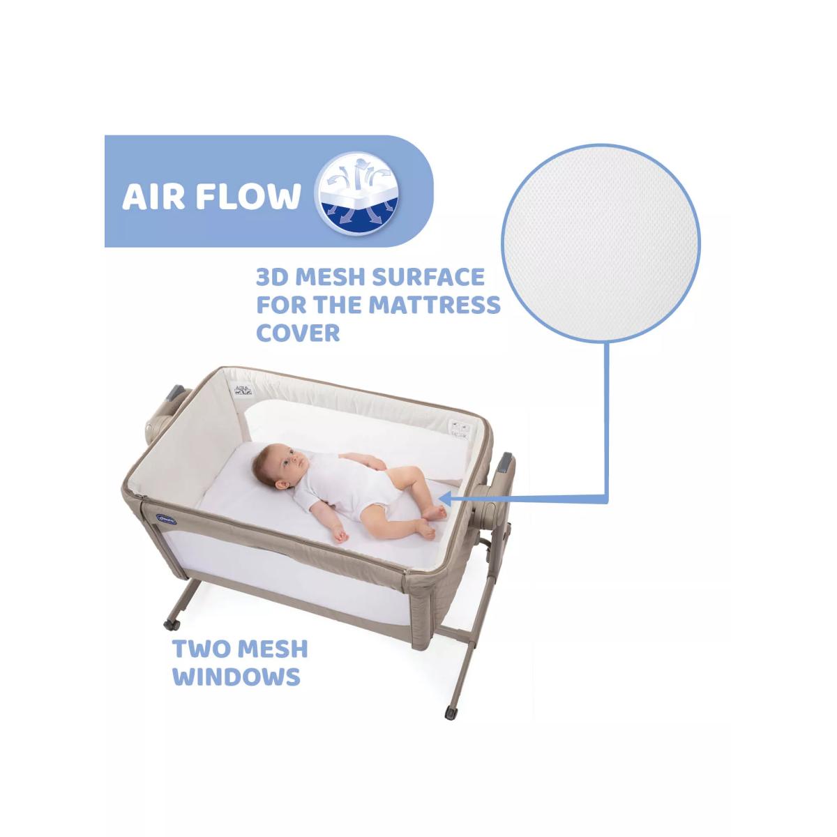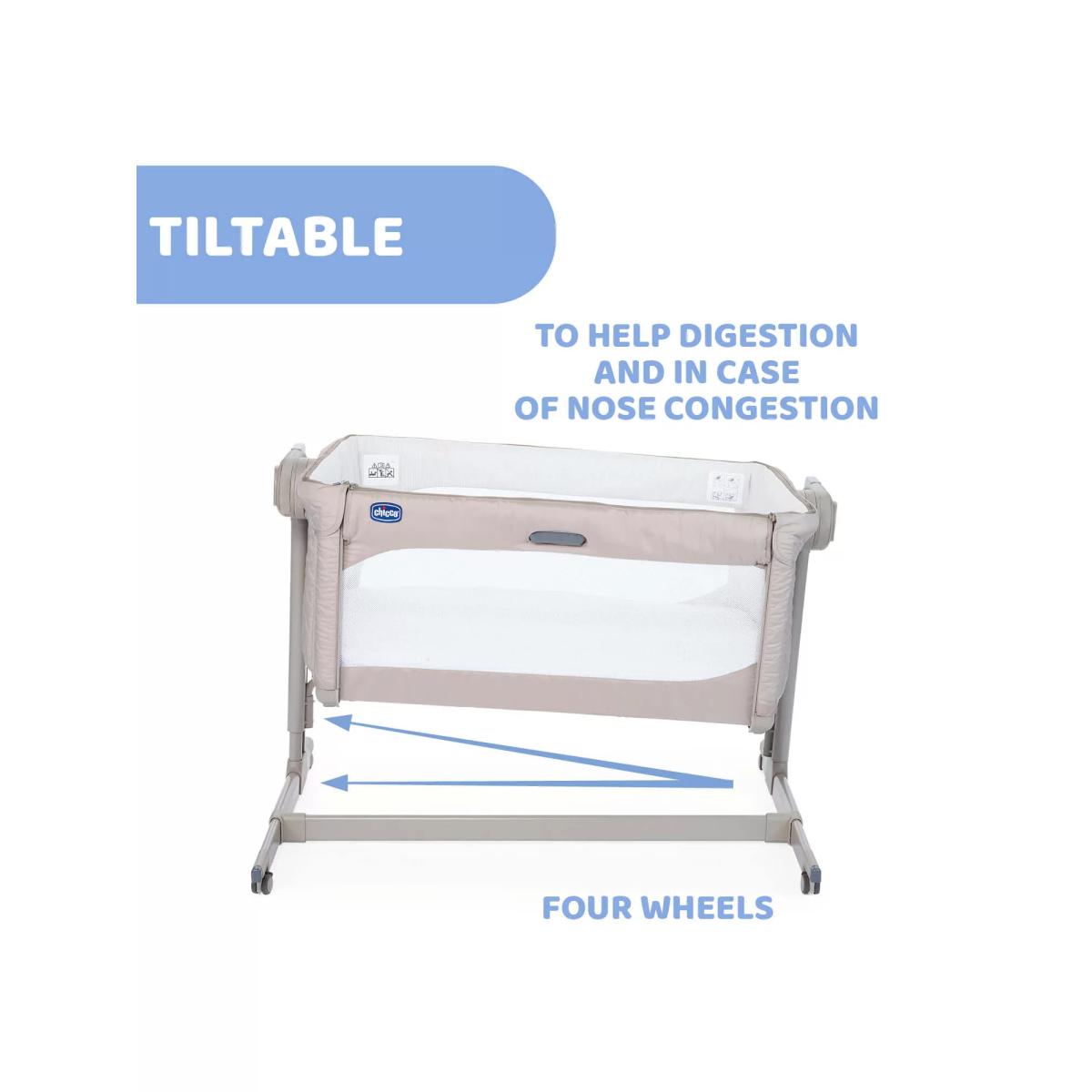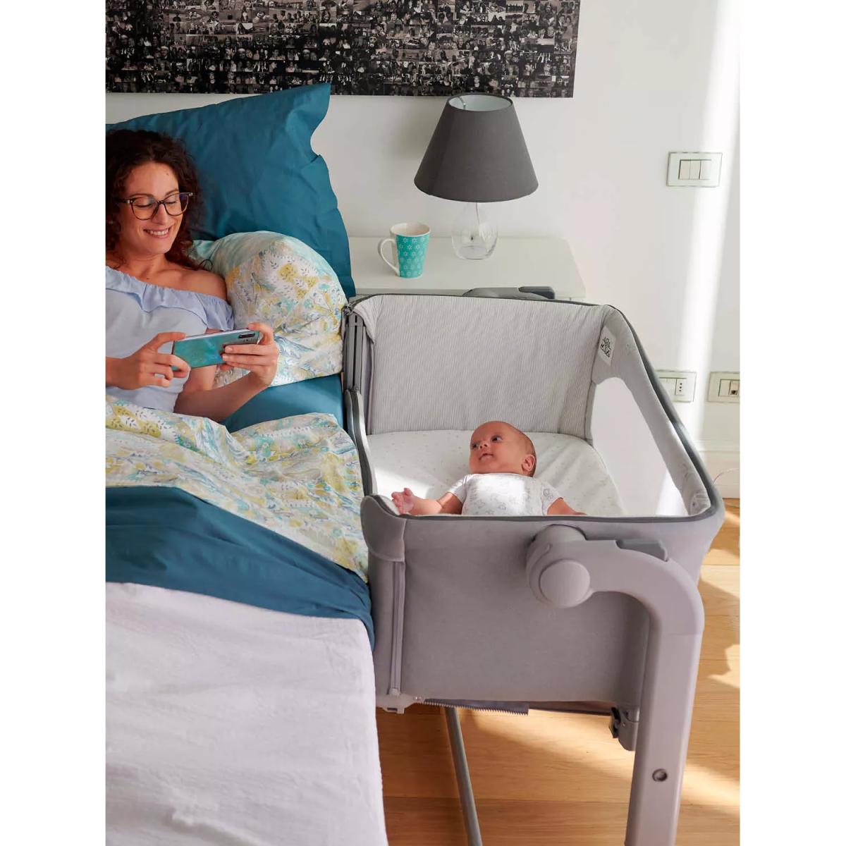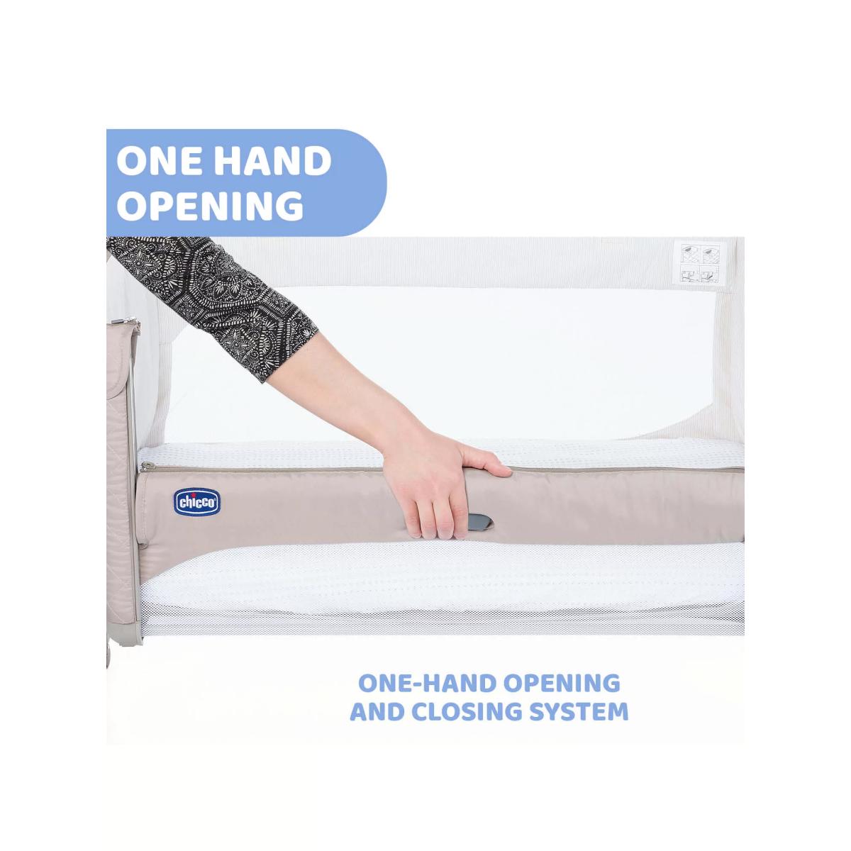 The award-winning Chicco Next2. Me Magic crib allows you to sleep next to your baby without being in the same bed. Your baby can safely sleep in the crib next to you, allowing you to respond quickly, whether for feeding, changing or night time snuggles. Boasting a one-handed sliding side panel for easy access to little one, and a rocking mode when in stand-alone sleeping mode, soothe baby back to sleep in no time. Easily attaching to most types of adult beds using the safety straps provided to enable safe side-sleeping, it has eleven height settings and clever telescopic feet so that you can also use it with beds with drawers or on divan base beds. Tilting by up to four levels to help baby's digestion, improve breathing and reduce reflux, Next2. Me Magic has two large mesh windows and a 3D mesh mattress cover to improve airflow throughout the crib. The internal padded material can easily be removed to be cleaned without the need to remove the rest of the crib fabrics by un-zipping the zip located around the top of the crib structure. Built with four wheels to move around the house if needed, it also comes with a travel bag for easy transportation and storage. What's included: Chicco Next2. Me Magic Mattress Safety harness kit Travel bag Please note: The height of the parents' mattress must be higher than or the same as that of the side of the crib. If this is not the case, use the adjustment system to achieve this condition on both sides.