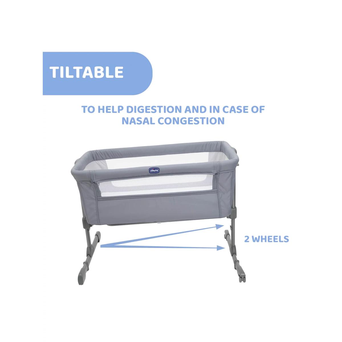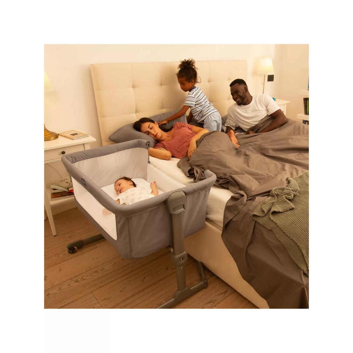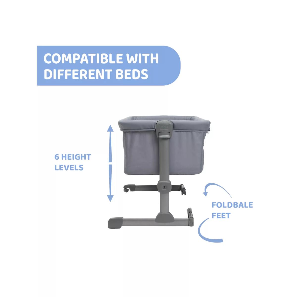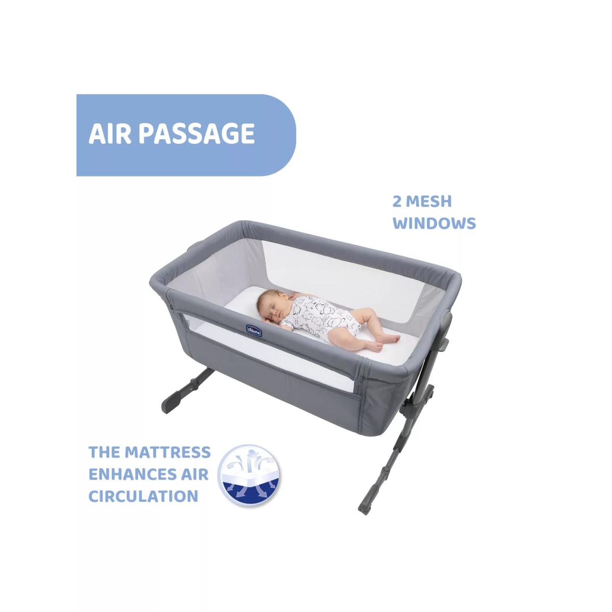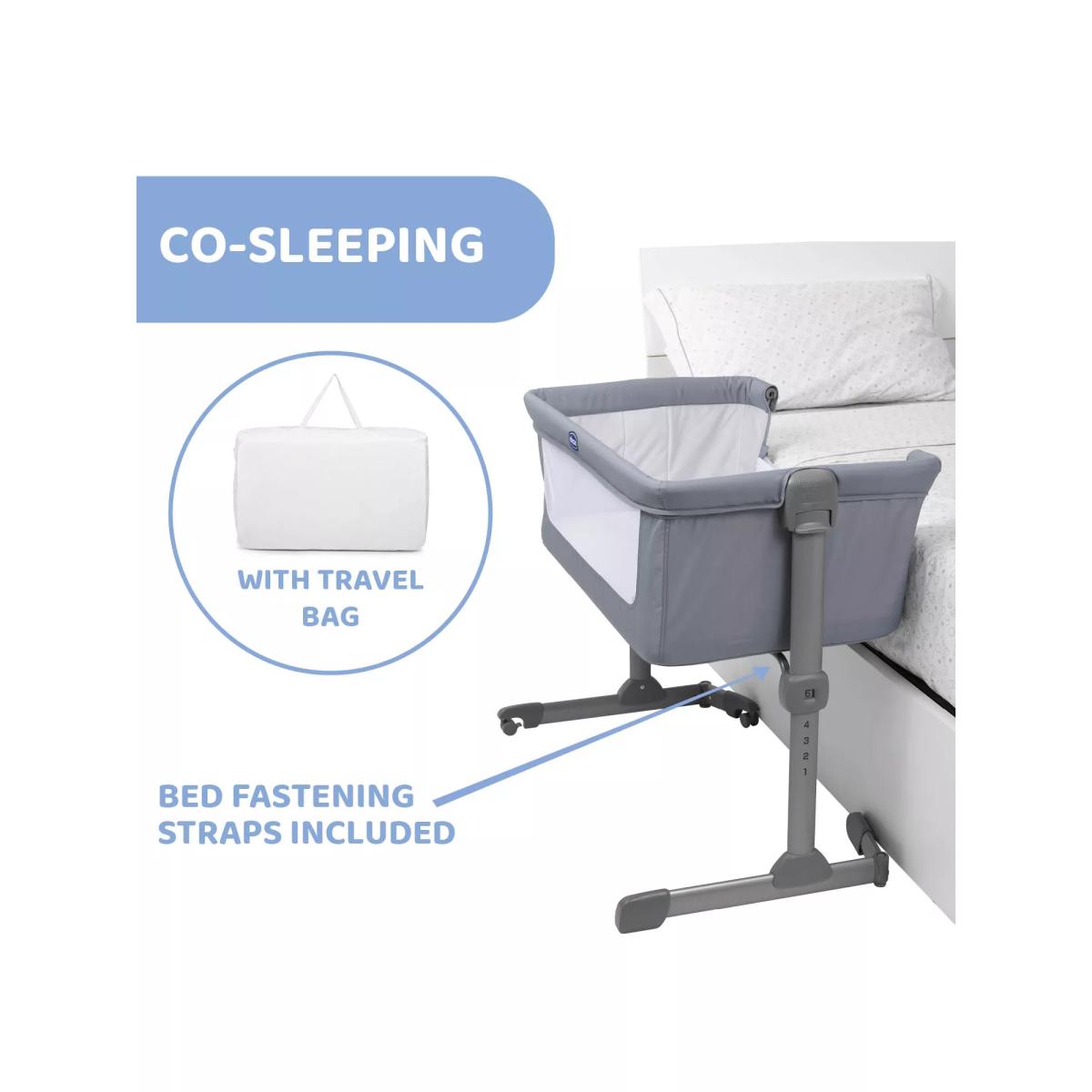 The Chicco Next2me side sleeping crib has been specifically designed to allow you and your baby to sleep next to each other without the need to share the same bed. The ease of attachment and assembly, plus the removable and washable lining make life easy, making the Chicco Next to Me bedside crib the perfect addition to any nursery. Key Features: Suitbale from birth to 9kg Adjustable to 6 height levels to fit with different beds. The feet can be folded to easily install the crib to beds with drawers When used as a traditional crib it can be tilted in case of nose congestion and to enhance the baby's digestion Travel bag included for ease of transport Simple and safe fastening system to attach to parent's bed Mesh window for air circulation Removable and washable lining