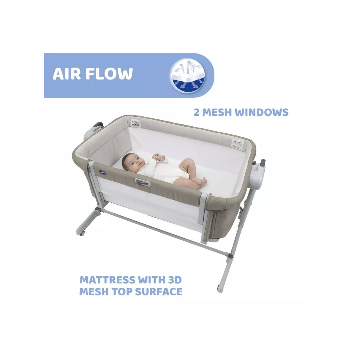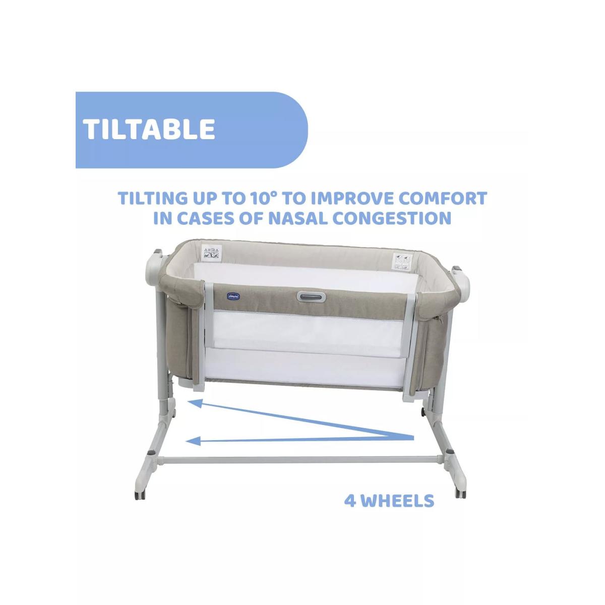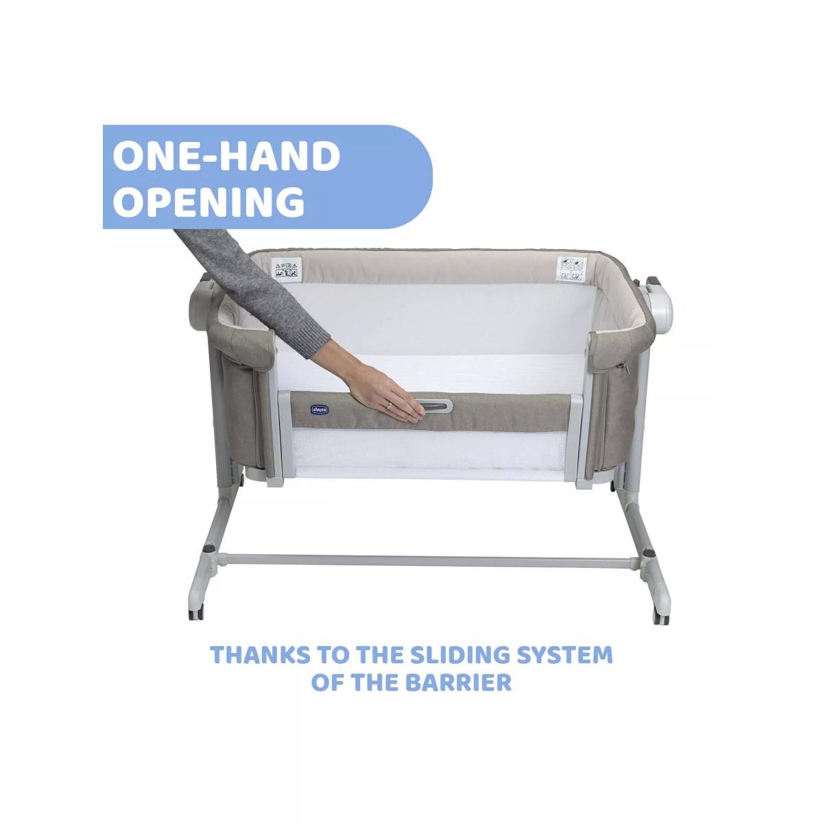 Meet the Next2. Me Magic Evo Cot, a new solution for co-sleeping from 0 to 6 months. With the crib's rocking mode, you can gently rock your baby to sleep. There's a one-hand opening thanks to the barrier sliding system and 4 swivelling wheels for maximum manoeuvrability. The 11 heights and foldable feet to grant compatibility with different beds. It's tiltable to help baby in case of regurgitation and it comes with a mattress with 3D mesh which enhances the passage of air congestion.