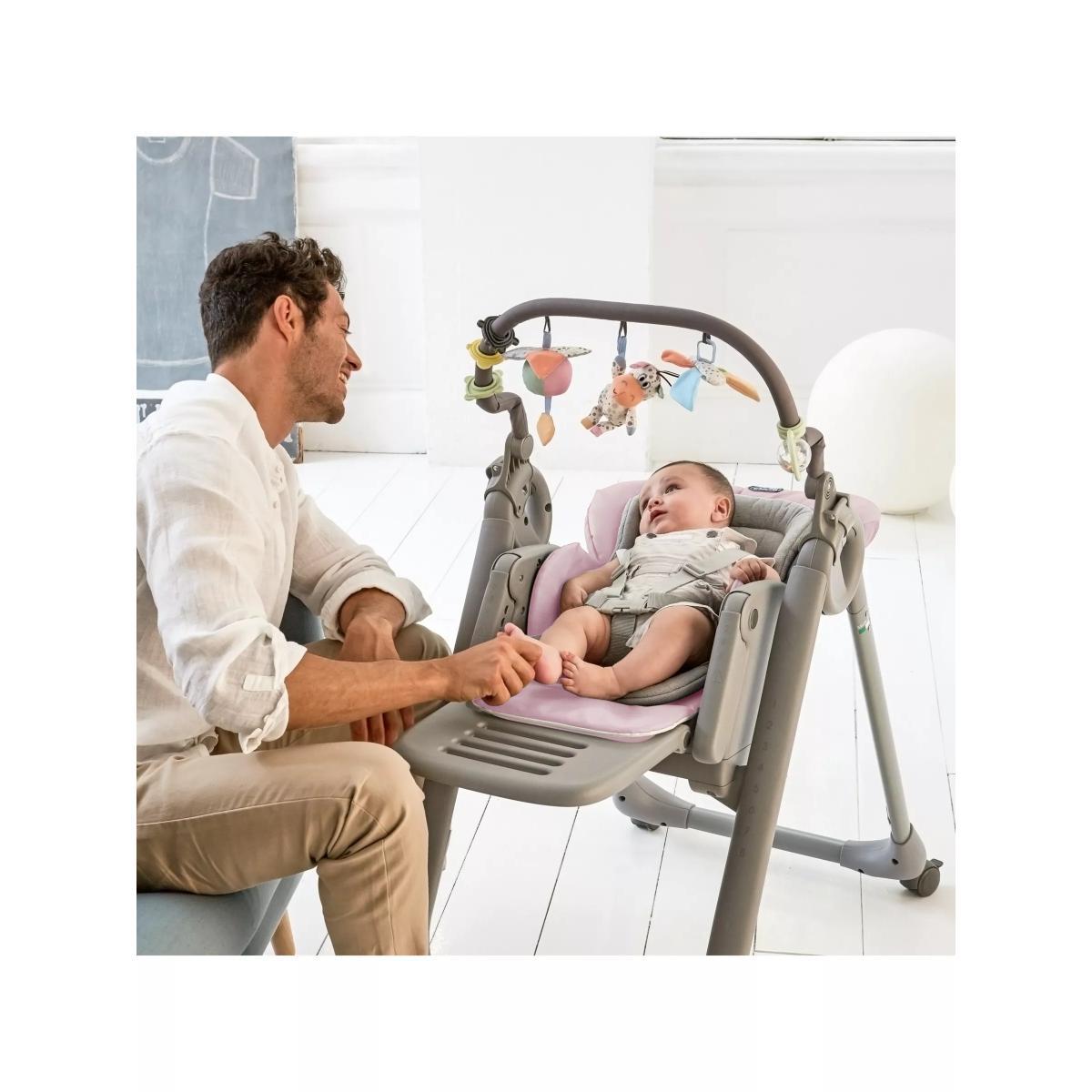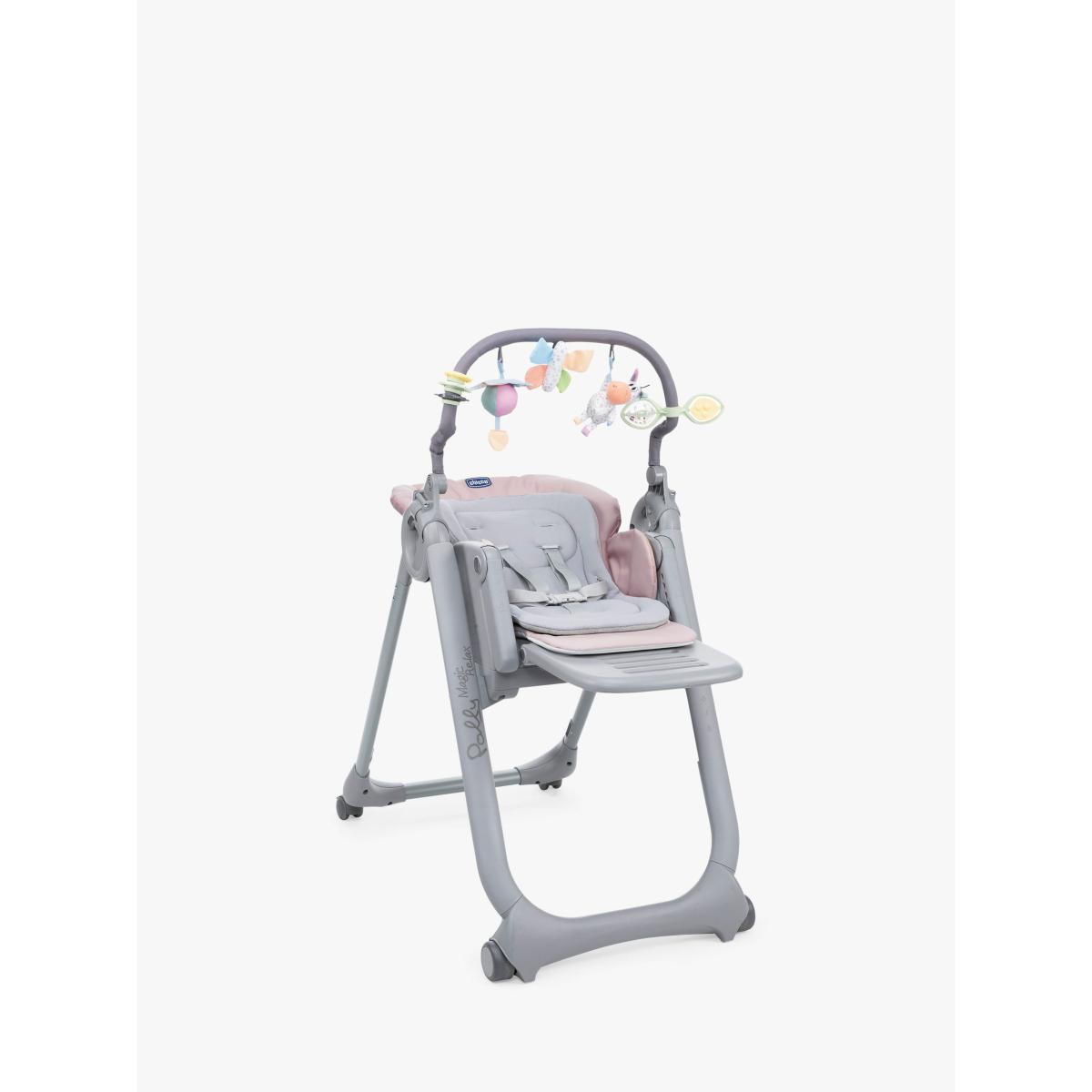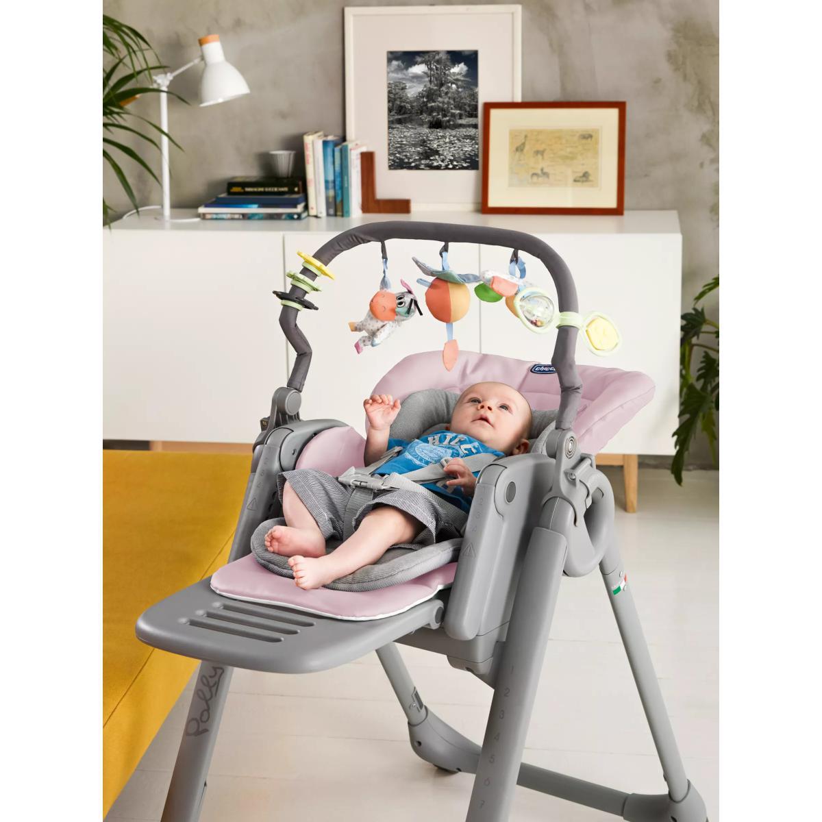 The Polly Magic Relax highchair from Chicco is the multi-functional solution with an elegant design, suitable from birth as a recliner and from 6 months as a first highchair. Whilst in recline the cocooning and snug seat with seasonal reducer and toy bar with fabric pendants simultaneously cuddle and entertain your baby. The frame is adjustable to 8 height positions and the table tray is removable, making the Polly Magic Relax super versatile and able to be used at any table so you can enjoy meals together. Both the seat and table can be adjusted to 4 different positions, the leg rest also adjustable, giving your baby ultimate space and comfort. Keeping your little one safes at all times during use is a 5-point safety harness. To further assist with storage the Polly Magic Relax is easily foldable to a compact size that is free-standing. 4 swivel wheels additionally help manoeuvre the chair about home.