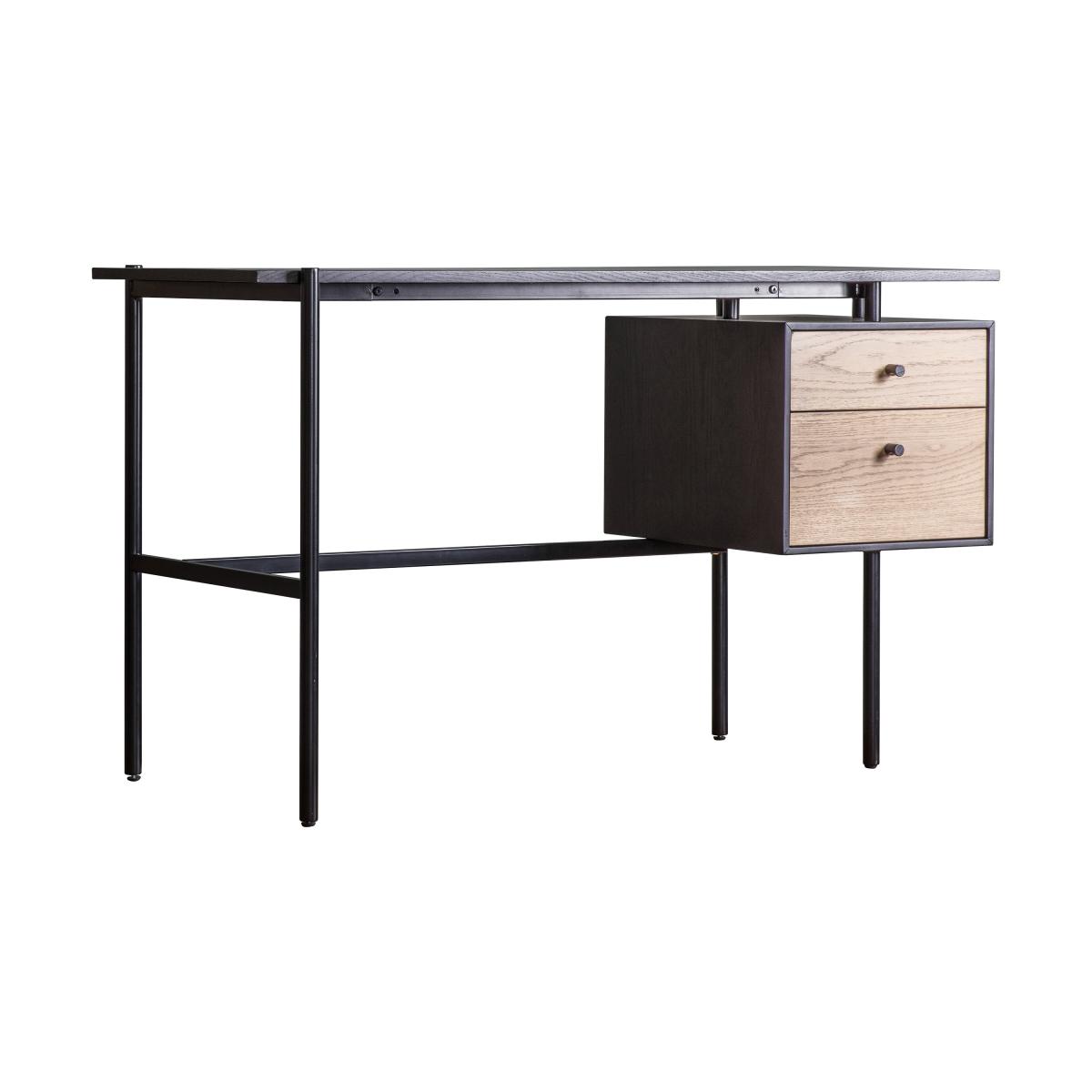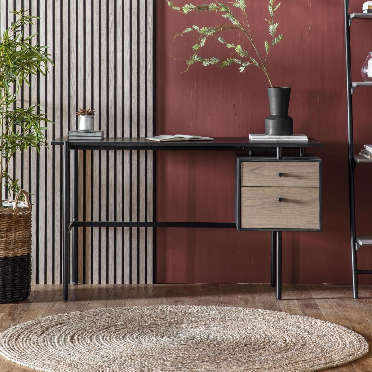 * Cool, space conscious, apartment living vibe* Features two drawers with natural oak fronts and a stylish black top* Tubular metal frame* Ideal for smaller spaces* Modern industrial look to suit a wide range of interiors Designed to give a cool, space conscious, apartment living vibe, the Chico Desk gives a feeling of space which is ideal in smaller interiors. It features two drawers with natural oak fronts and a stylish black top, which shows the wood grain, and tubular metal frame.