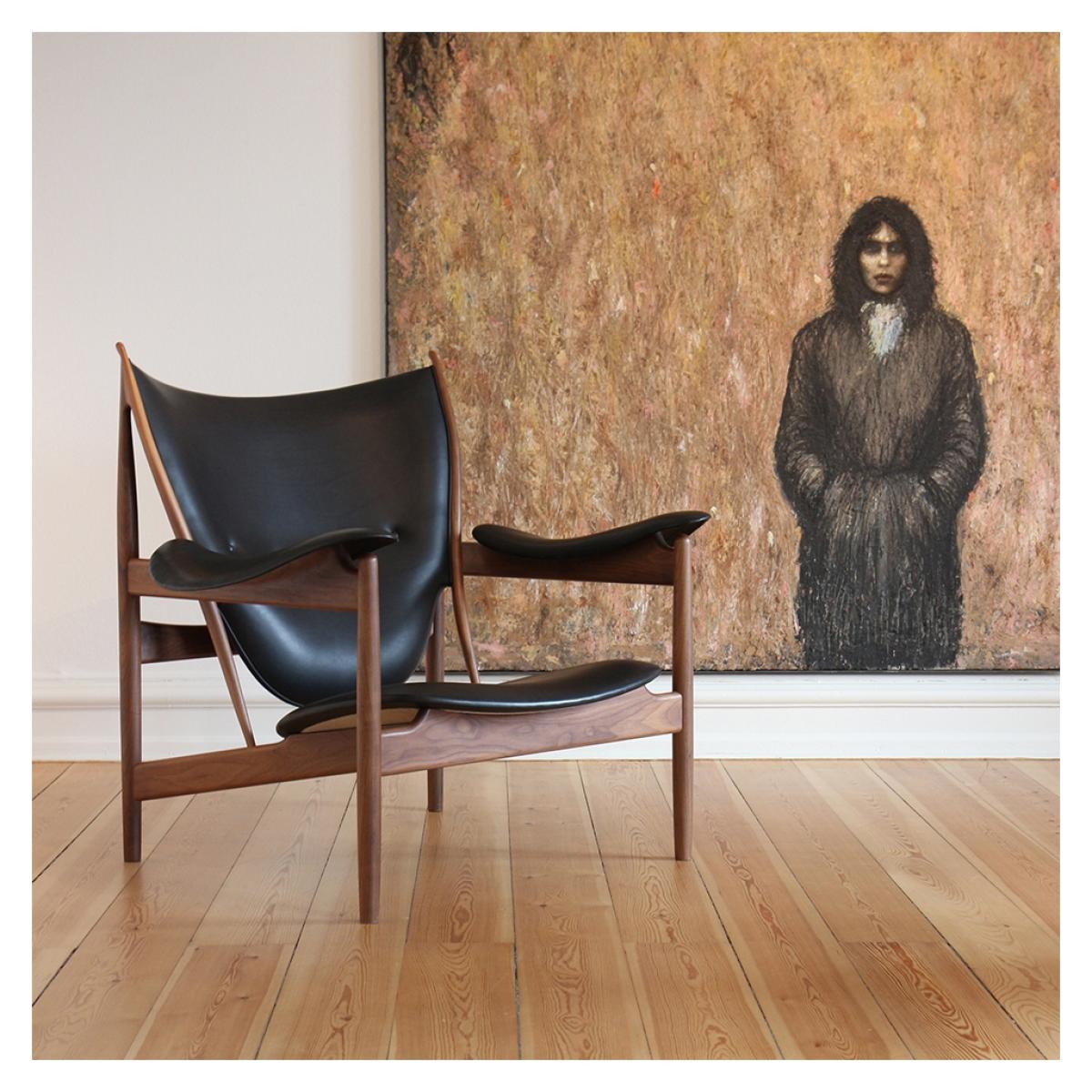 Finn Juhl, the master of Danish Modern, originally designed the iconic Chieftain Chair in oiled walnut and black leather in 1949.Exuding grandeur, the Chieftain Chair's shape was inspired by symbols of weaponry used on foreign shores. The oiled walnut frame takes on the shape of bows and arrows, whilst it's shield-like back and comfortable low seat are flanked by armrests that resemble the shape of saddles. Upholstered in full-grain, vacuum-tanned, smooth aniline black Nevada leather from south German cattle hides, the chair's leather is firm but supple with an exceptional grain. Famed for its exceptional comfort, the large Chieftain Chair was designed to offer a wide array of seating positions. With armrests perfectly suited for lounging and a seat large enough to curl up on, this chair is certain to bring maximum comfort to any space. The first Danish furniture designer to achieve international recognition, Finn Juhl is seen by many as the master of Danish Modern. A self-taught designer, he originally studied to become an architect but worked with the mindset of a sculptor when creating his designs. Rather than thinking in terms of practicality, Finn Juhl broke free from the constraints of conventional working methods to create truly innovative designs.