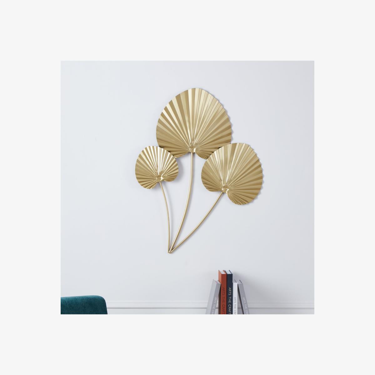 Amazing wall decoration made of three overlapping gold leaves. This decoration make an eye catcher of your interior. The piece has been created and built to look as much as possible to the natural leaf. Amazing wall decoration made of three overlapping gold leaves. This decoration make an eye catcher of your interior. The piece has been created and built to look as much as possible to the natural leaf.
