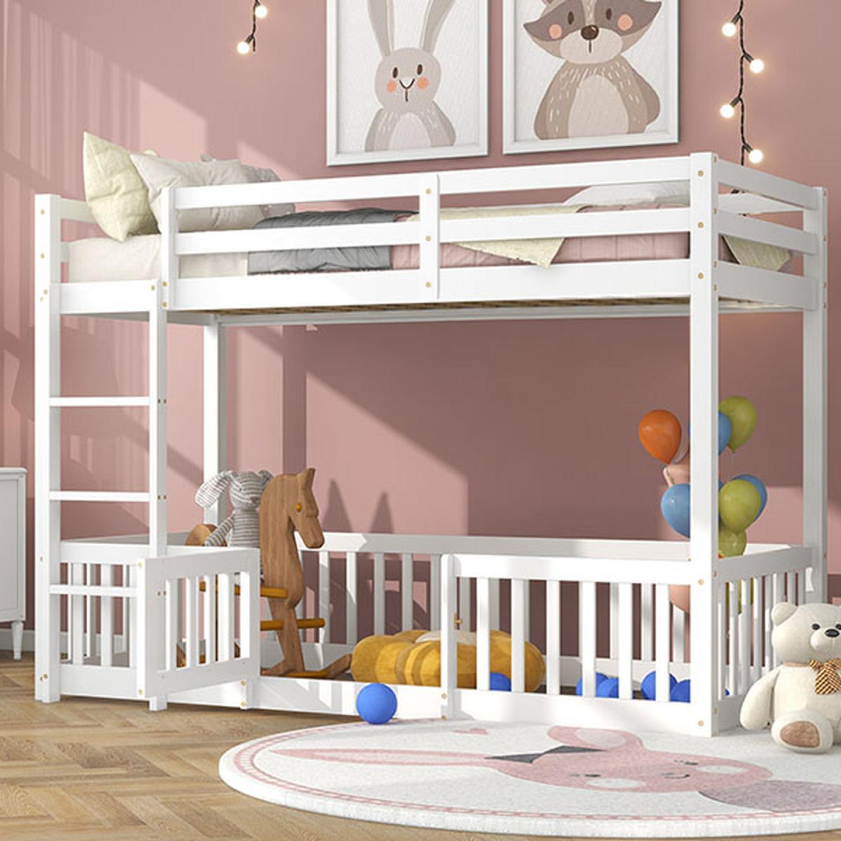 Practical staircase bed design. The staircase bed is very space-saving, and to give you the freedom to organise the space under the bed freely, the bed frame underneath is not fitted with a slatted base. You can use the space under the bed as storage space or for a children's table with chairs so that your child has plenty of room to move around. Pure solid wood construction. The bed is made of pure pine wood, and the four tightly packed fences are safe and stable, so you have a quality guarantee. Unique design. The lower bed is surrounded by fences on all sides and has a door in the centre that can be opened. This allows you to create a mysterious and fun play area for your child under the bed. A safe and fun design. Safety measures. Safe and tight fences on all four sides of both the upper and lower levels ensure children's safety and prevent falls. The three step, right angled ladder is safe and secure. The bed is a reassuring choice for parents. Environmentally friendly. FSC-certified pine is strong, safe and child-friendly, which can promote sustainable development. Easy to install. Detailed instructions and complete parts can help you with assembly. The pleasure of installation lets you enjoy the bed even more.