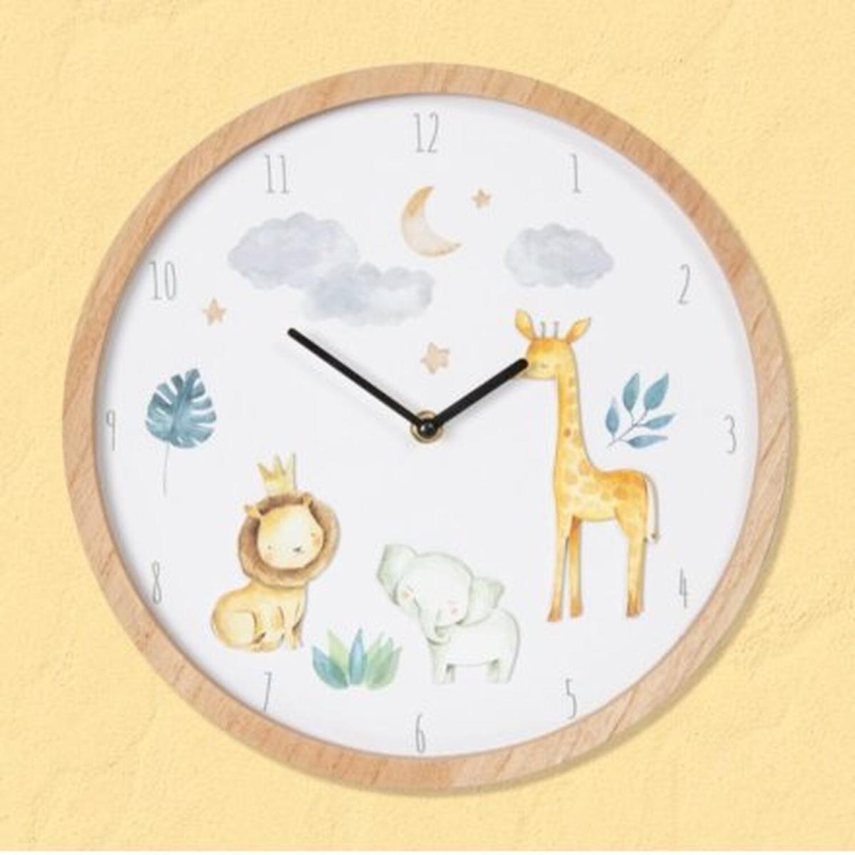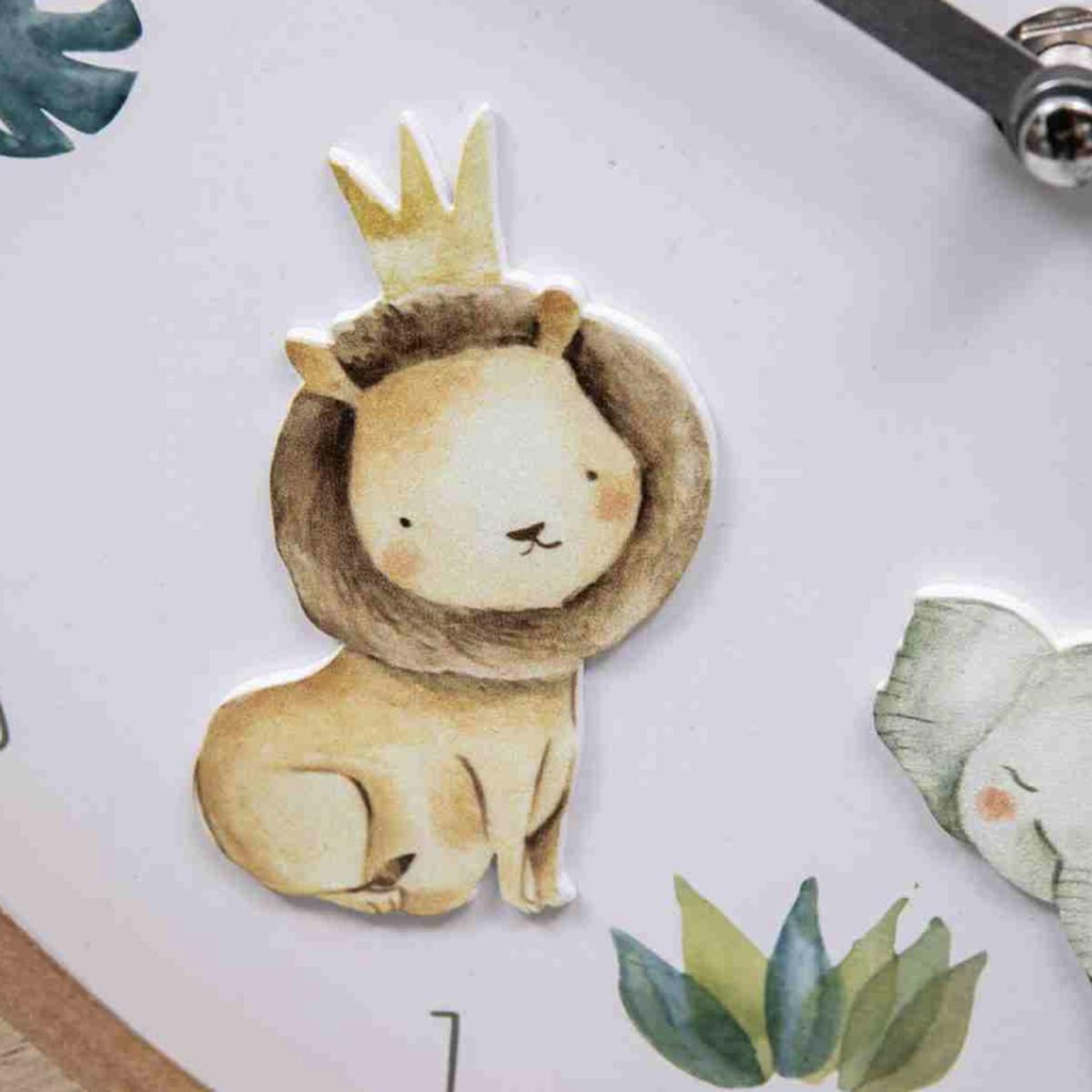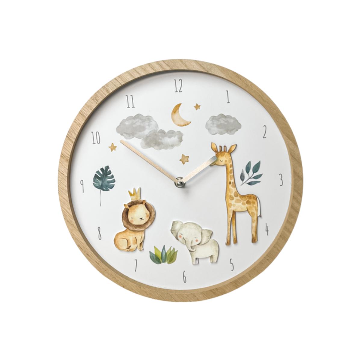 Children's animal jungle round nursery clock with embossed giraffe, elephant & lion. The natural wood frame with metal hands makes an adorable addition to any jungle-themed nursery kids' room. Display it on the wall and style it with animal posters, mirrors and hooks to create a beautiful wall safari-themed gallery.